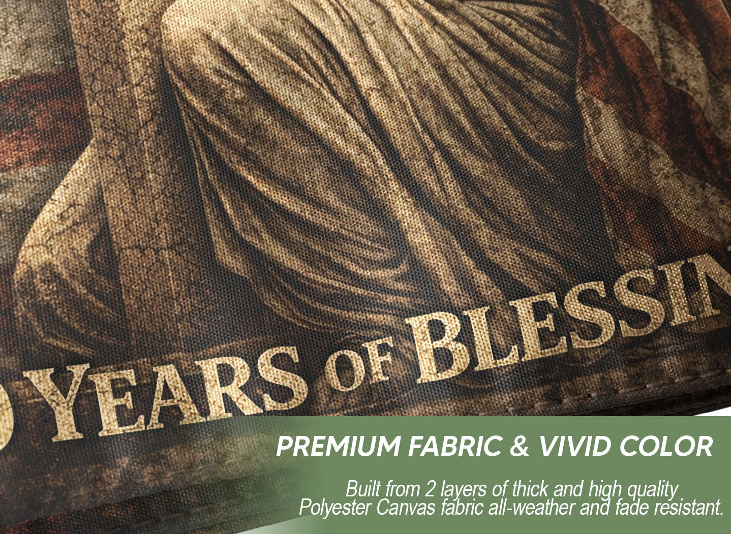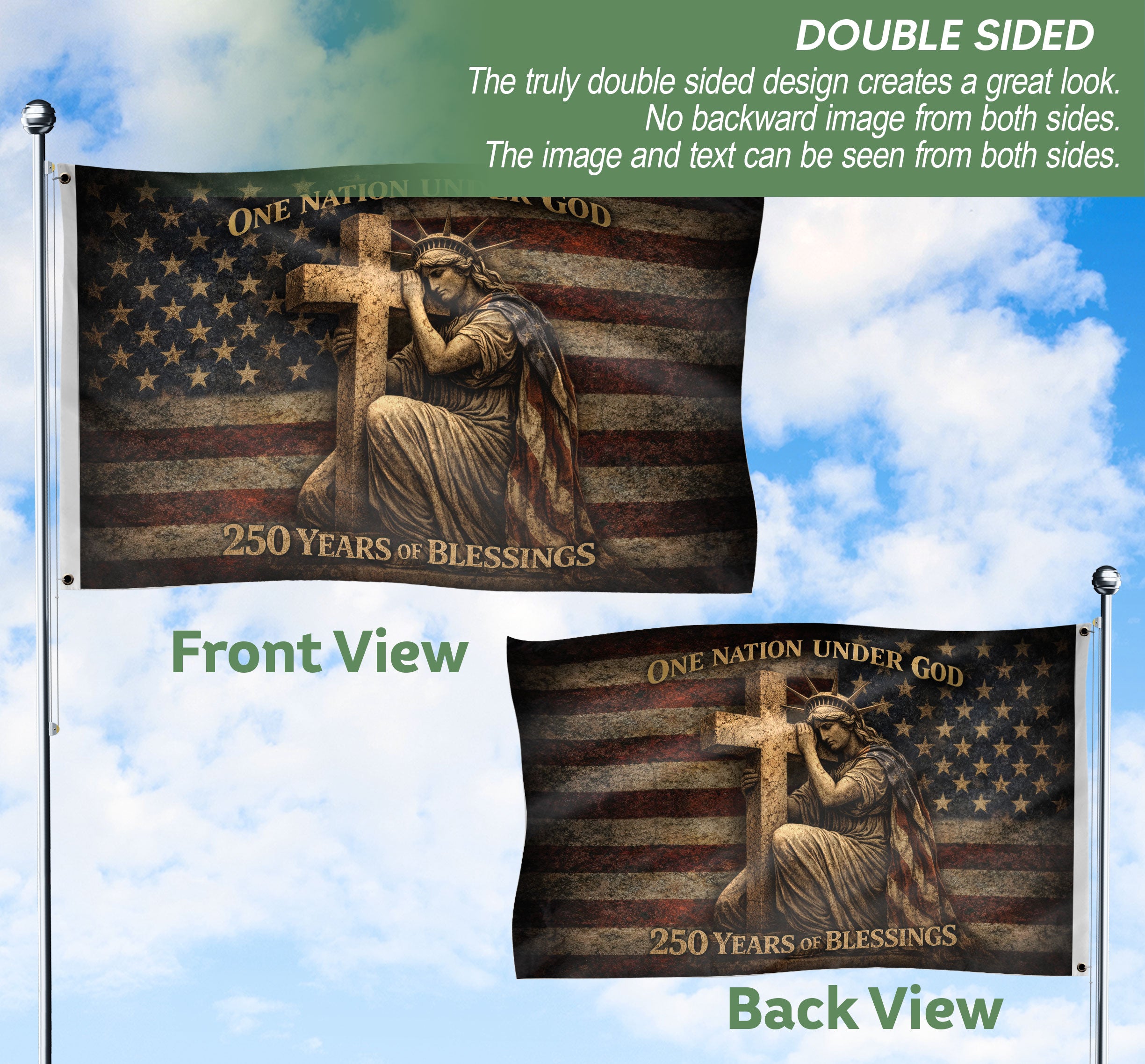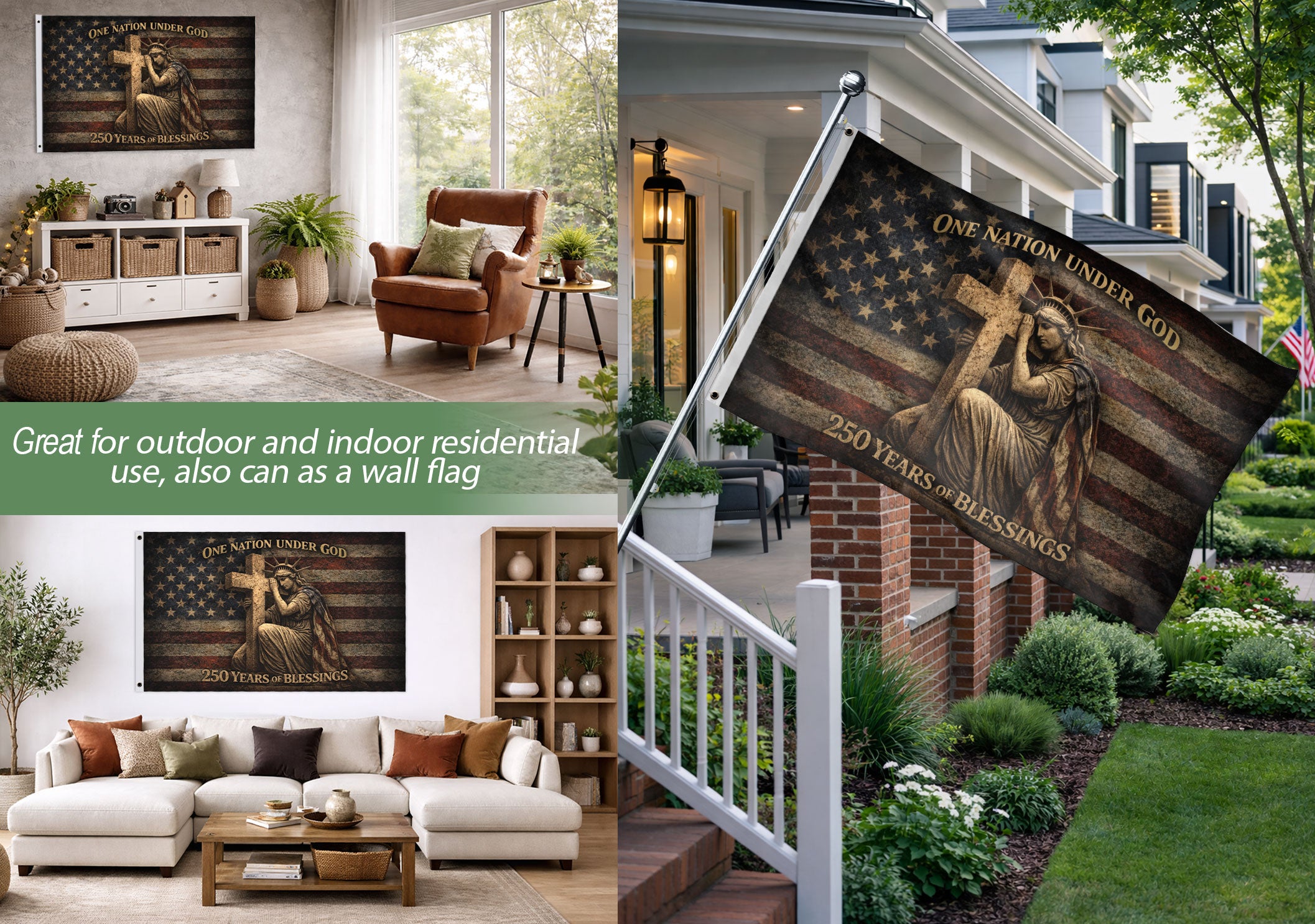 Celebrate the 250th anniversary of the United States with this Christian patriotic house flag. The design features a striking cross over an American flag background, boldly displaying the message ‘One Nation Under God.’ This flag honors the nation’s history from 1776 to 2026, blending patriotic pride with Christian faith. Ideal for displaying on your home porch, garden, or yard, it serves as a meaningful symbol of unity, freedom, and belief. Crafted for outdoor durability, this USA anniversary flag withstands weather while making a powerful statement about American values and spirituality. Perfect for holidays, Independence Day, or everyday display to share your faith and patriotism.