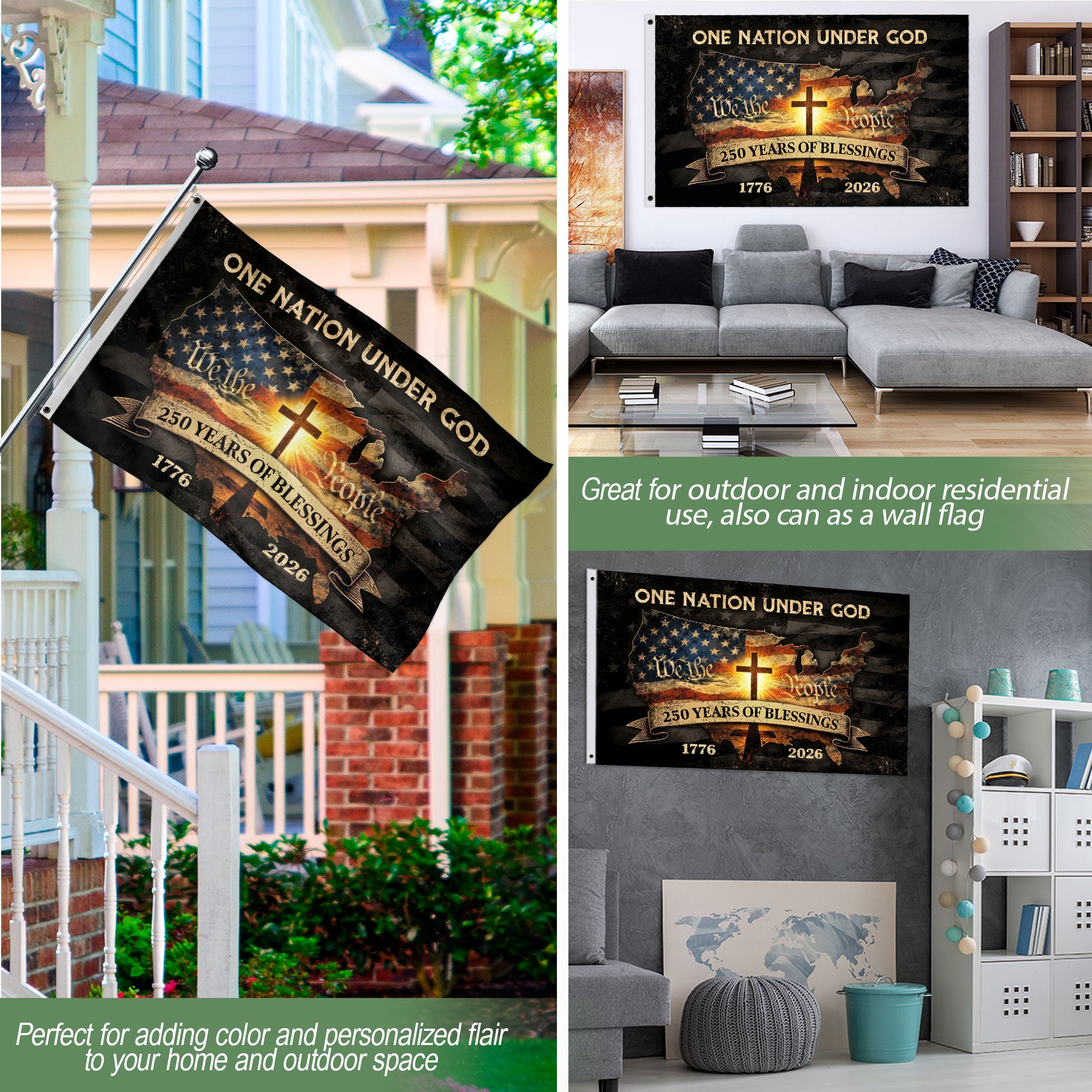 Celebrate America’s 250th birthday with this bold Christian patriotic flag featuring ‘One Nation Under God’. Double-sided for visibility from any angle, this USA flag embodies faith, gratitude, and national pride. Crafted with durable polyester fabric, it withstands outdoor conditions for porches, gardens, poles, or events. Perfect for Independence Day, Memorial Day, or daily display of Christian values and American spirit. Measures standard flag size with reinforced edges and brass grommets for easy hanging. Show your conviction and hope for the nation’s future.