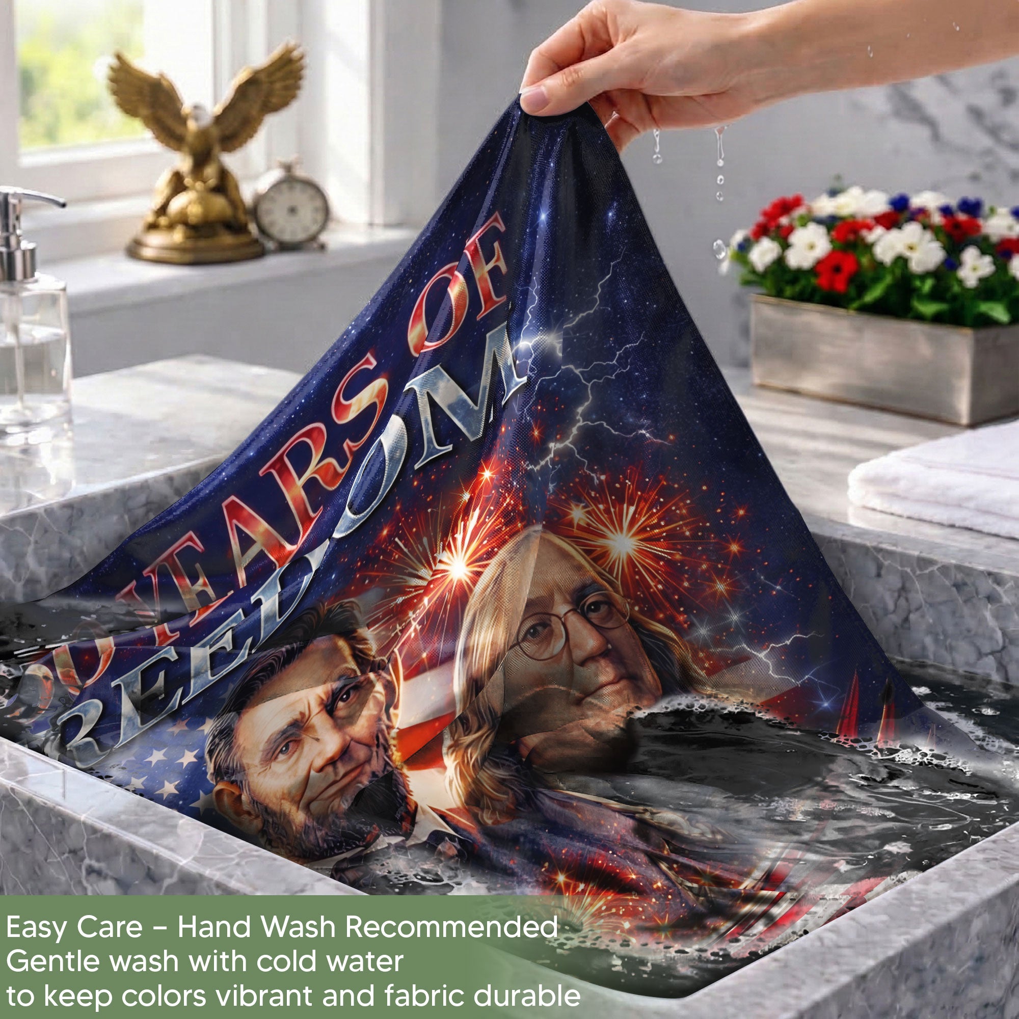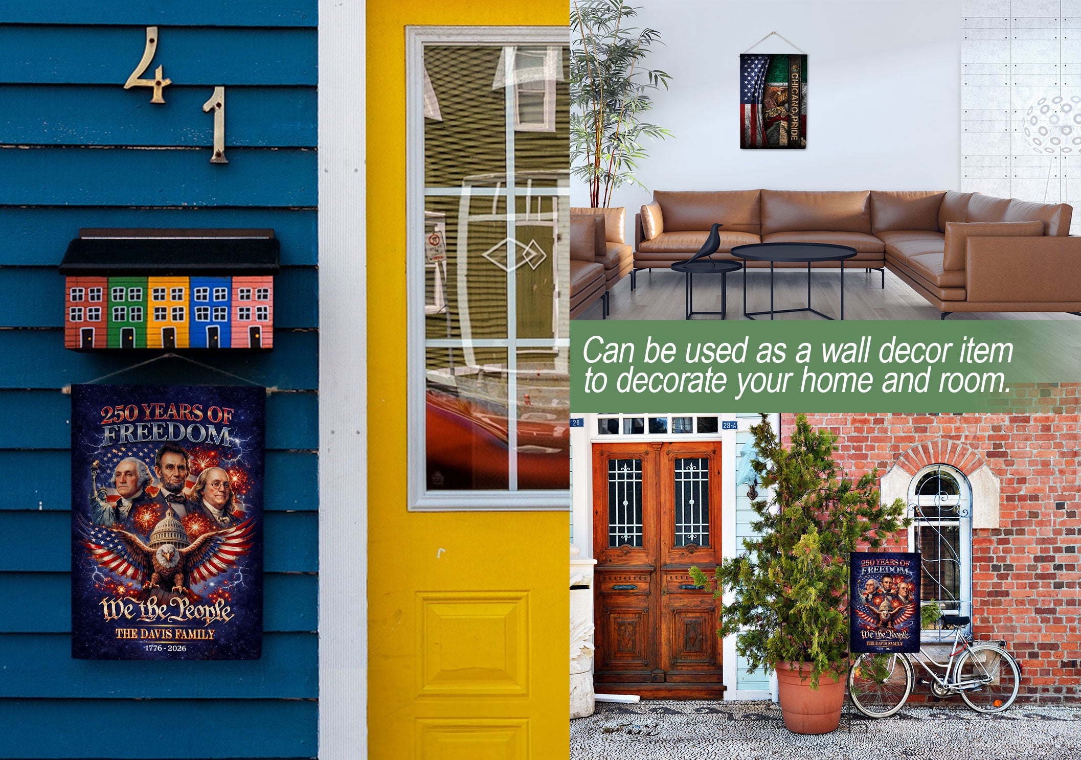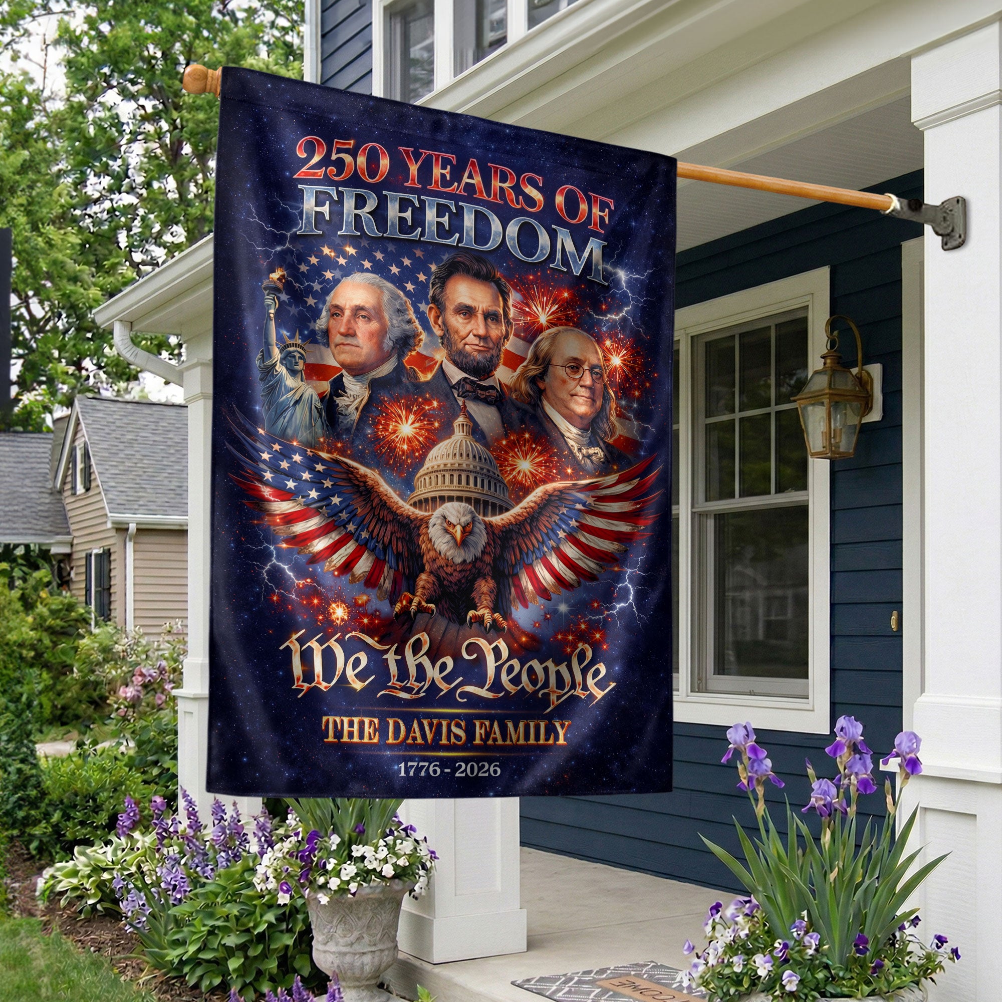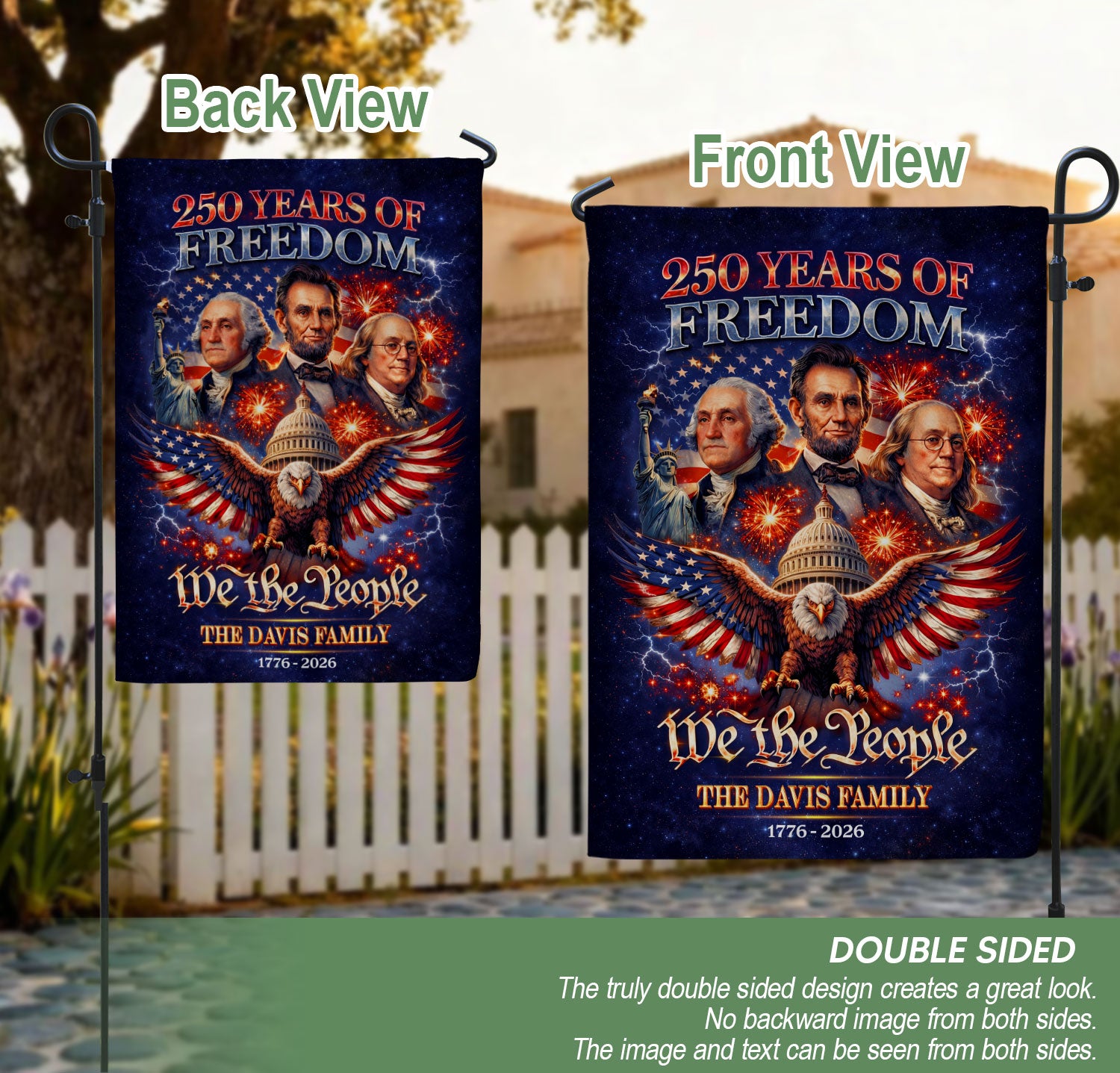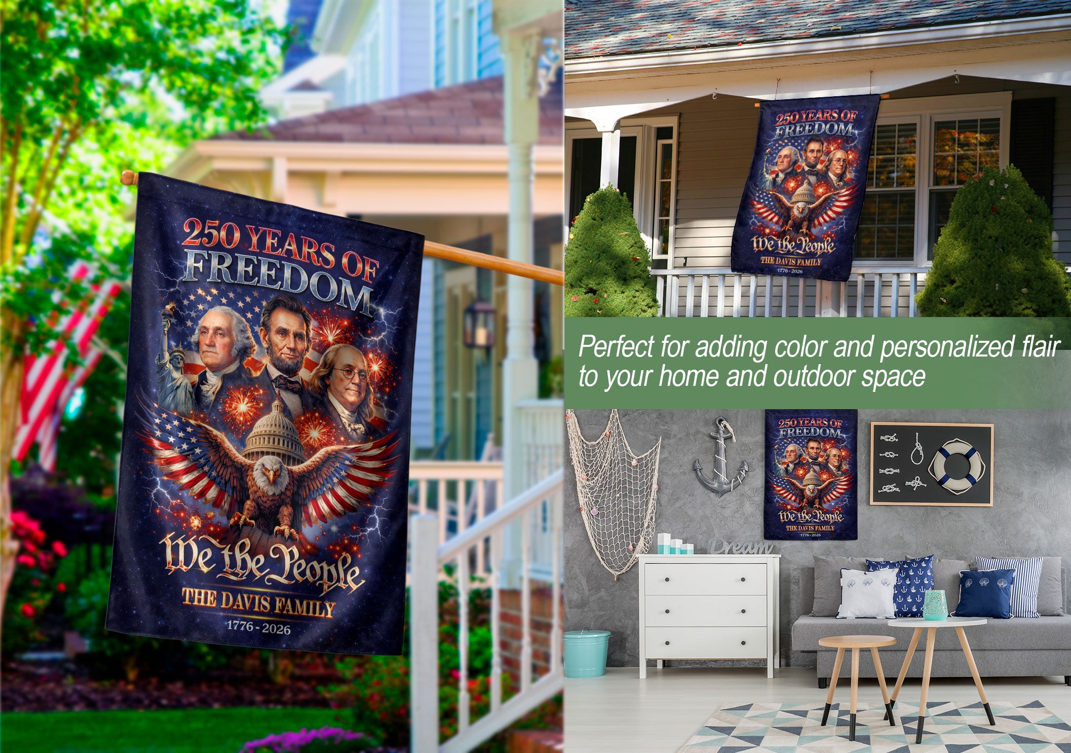 Celebrate America’s 250th anniversary with this custom family name garden flag, spanning 1776-2026. Featuring iconic portraits of Founding Fathers George Washington, Abraham Lincoln, and Benjamin Franklin, alongside the majestic eagle, Statue of Liberty, and U.S. Capitol. Crafted for outdoor display, this personalized garden flag honors the spirit of liberty and independence. Ideal for patriotic holidays, historical commemorations, or as a thoughtful family gift. Durable double-sided design withstands weather, perfect for gardens, porches, or yards. Add your family name for a unique touch.