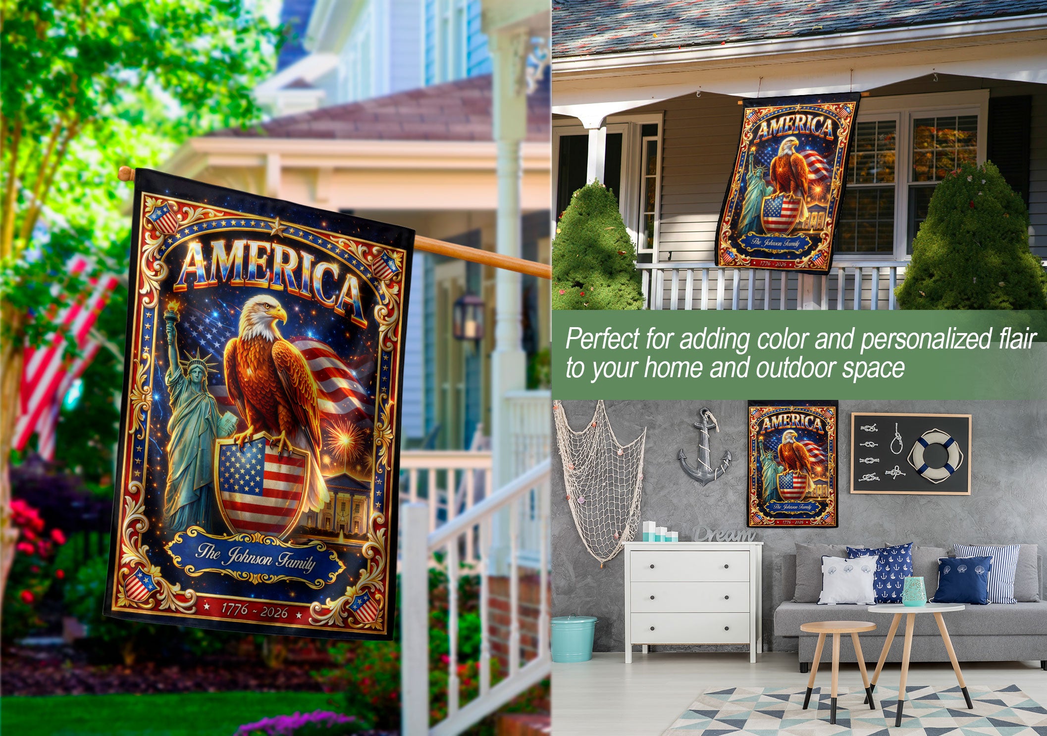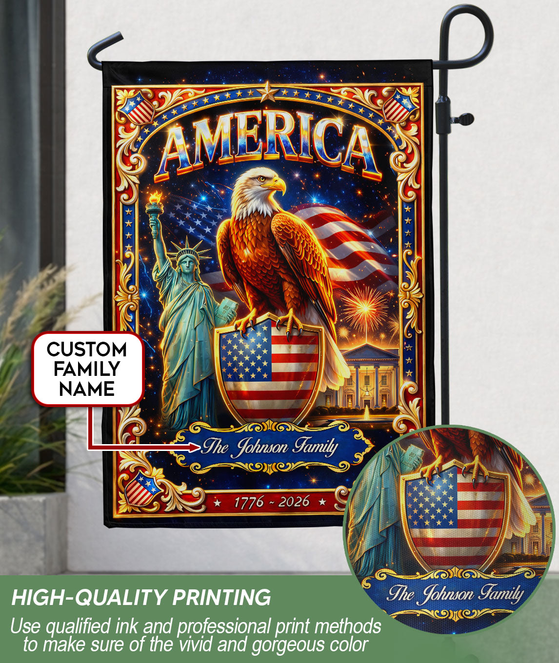 Celebrate America’s 250th anniversary with this custom family name garden flag. Featuring a striking design with a powerful bald eagle, the iconic Statue of Liberty, and vibrant fireworks, it honors the nation’s journey from 1776 to 2026. Made from durable, weather-resistant polyester fabric, this double-sided garden flag measures approximately 12.5 x 18 inches and fits standard garden flag poles. Personalize it with your family name for a unique patriotic display. Ideal for gardens, porches, mailboxes, or as a thoughtful gift for history enthusiasts, veterans, or family gatherings during this historic milestone. Easy to install and maintain, it adds a bold statement of American pride to any outdoor space.
