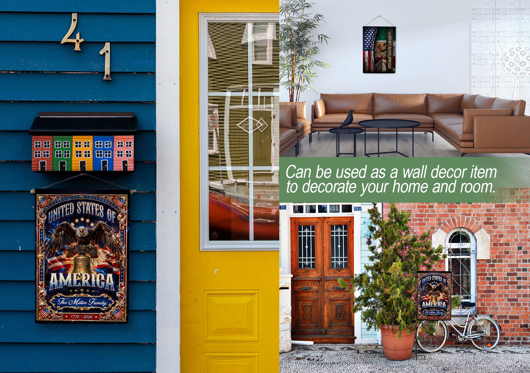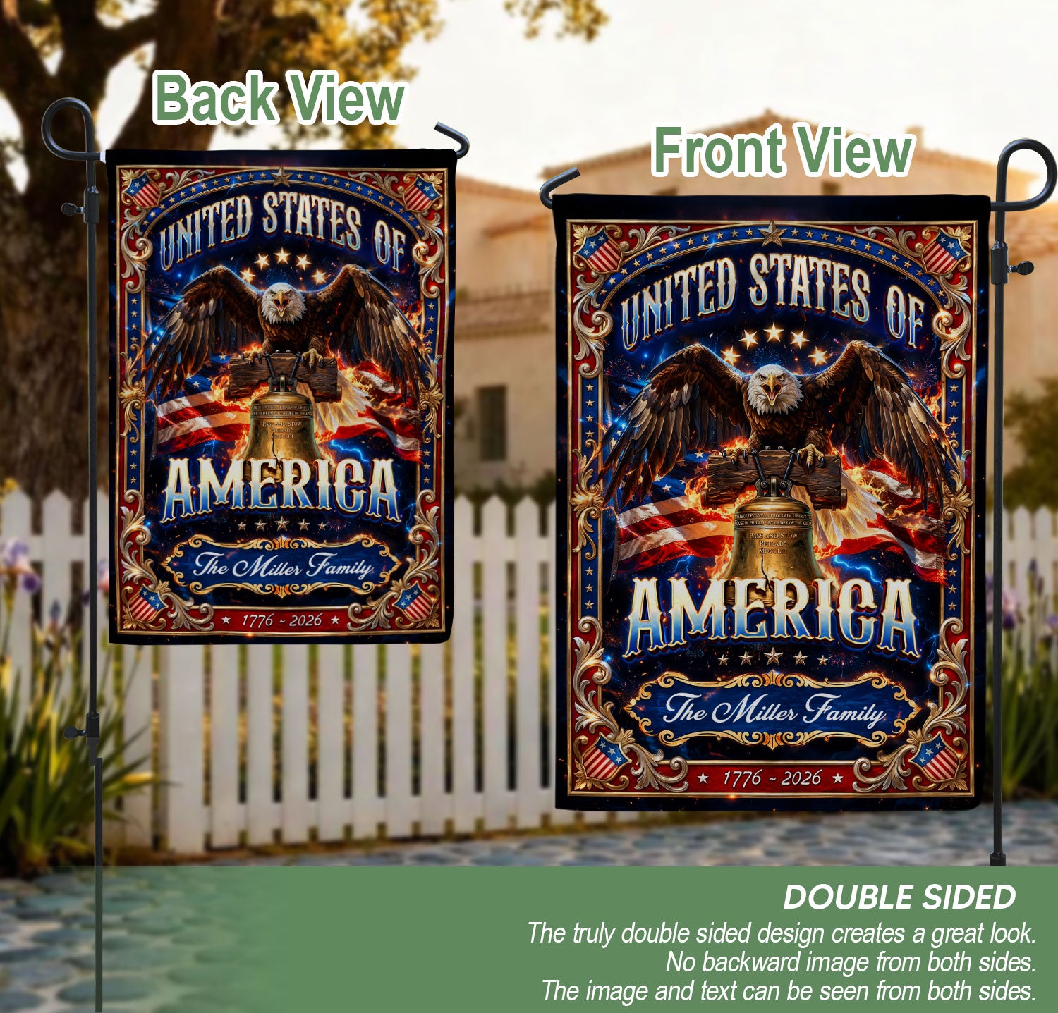 Celebrate American heritage and freedom with this custom garden flag featuring a majestic eagle perched on the iconic Liberty Bell, bold United States of America text, and 1776-2026 semiquincentennial design. Personalize it with your family name for a unique touch that showcases your pride. Crafted from high-quality, durable, weather-resistant fabric, this flag withstands outdoor elements for year-round display in gardens, porches, yards, or patios. Perfect for patriotic holidays like Fourth of July, Memorial Day, or everyday display to honor national history and family legacy.