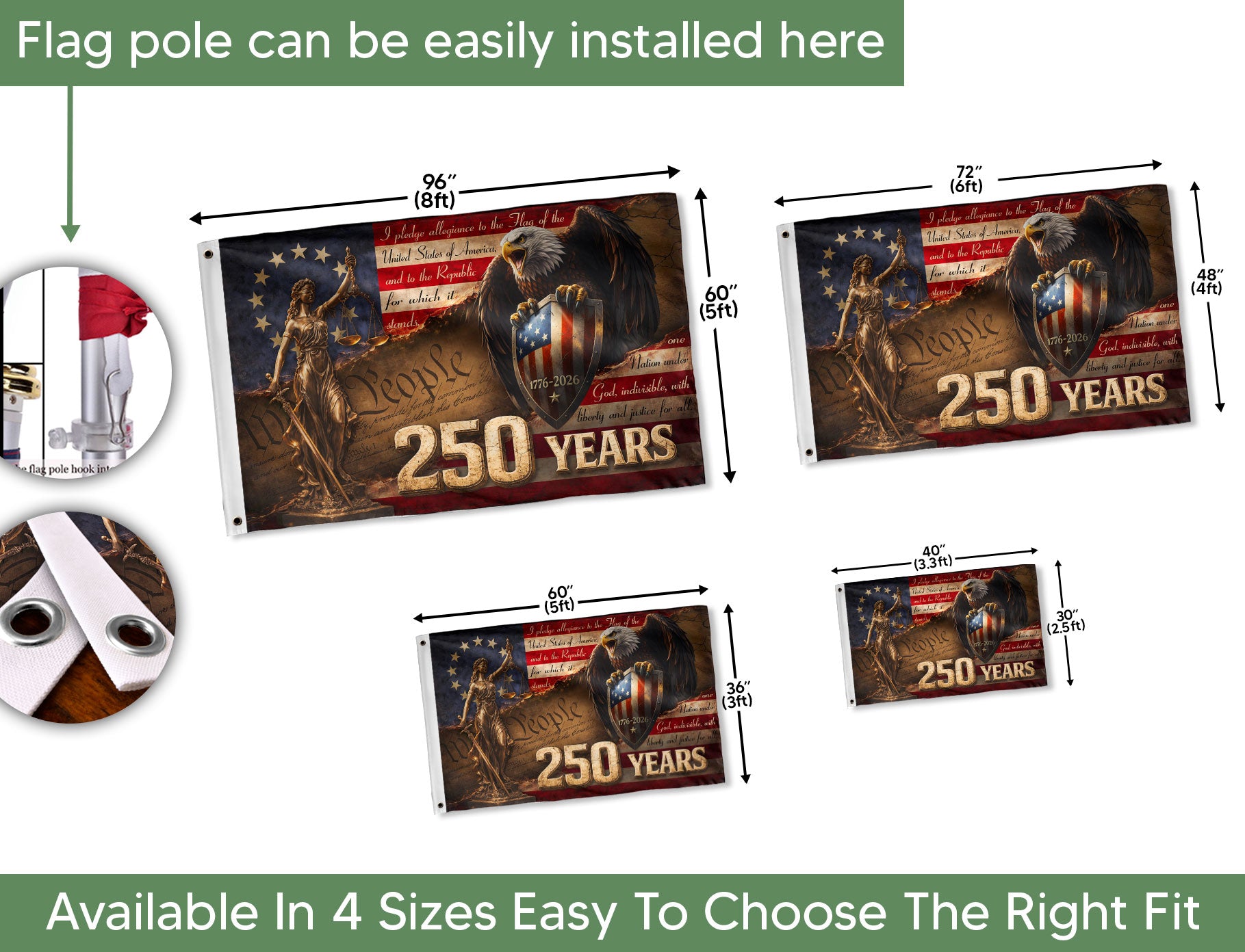 Celebrate 250 years of American freedom with this Lady Justice house flag, commemorating the journey from 1776 to 2026. Featuring a striking artwork of Lady Justice holding her iconic scales of justice, paired with a majestic bald eagle perched on a patriotic shield emblazoned with ‘We The People’ and the historic milestone. Perfect for displaying outside your home to honor the United States’ quarter-millennium of independence. Crafted from durable, weather-resistant polyester fabric, this double-sided flag measures standard house flag size for easy attachment to flagpoles or garden stands. Vibrant colors and high-quality printing ensure long-lasting visibility and fade resistance. Ideal for patriots, history enthusiasts, Fourth of July celebrations, or everyday display of national pride. Add a touch of symbolism and Americana to your porch, yard, or balcony.