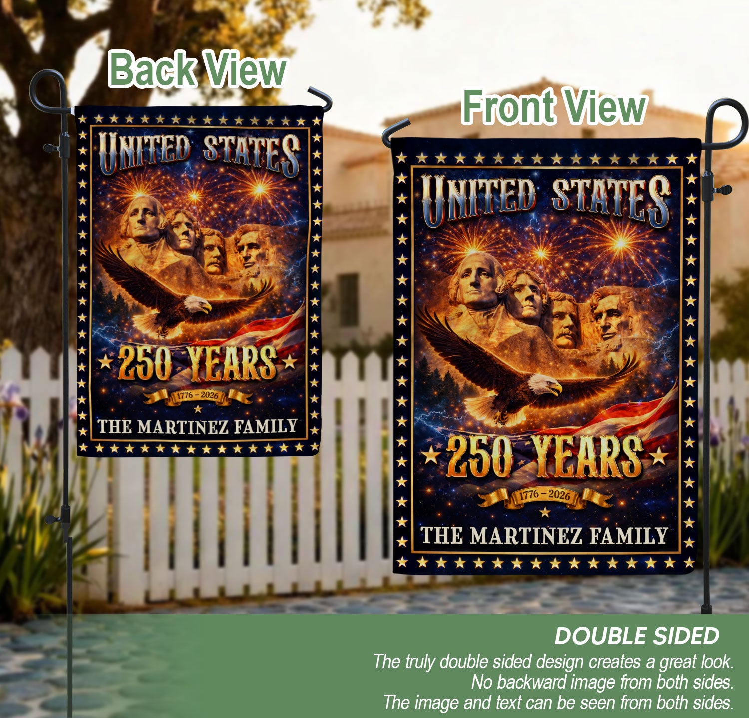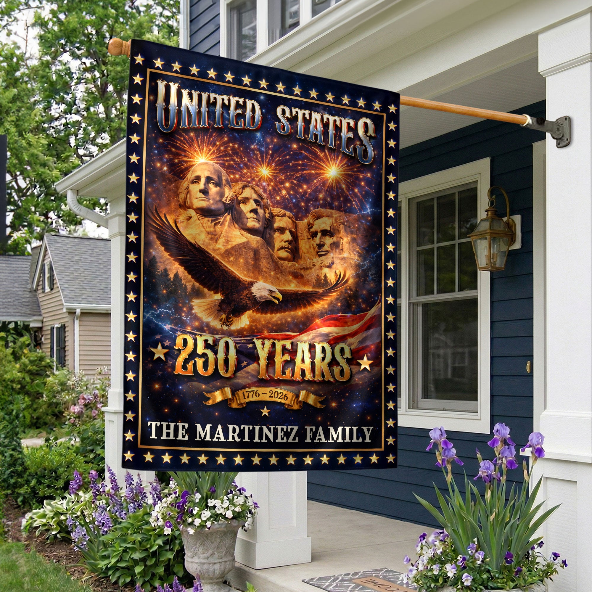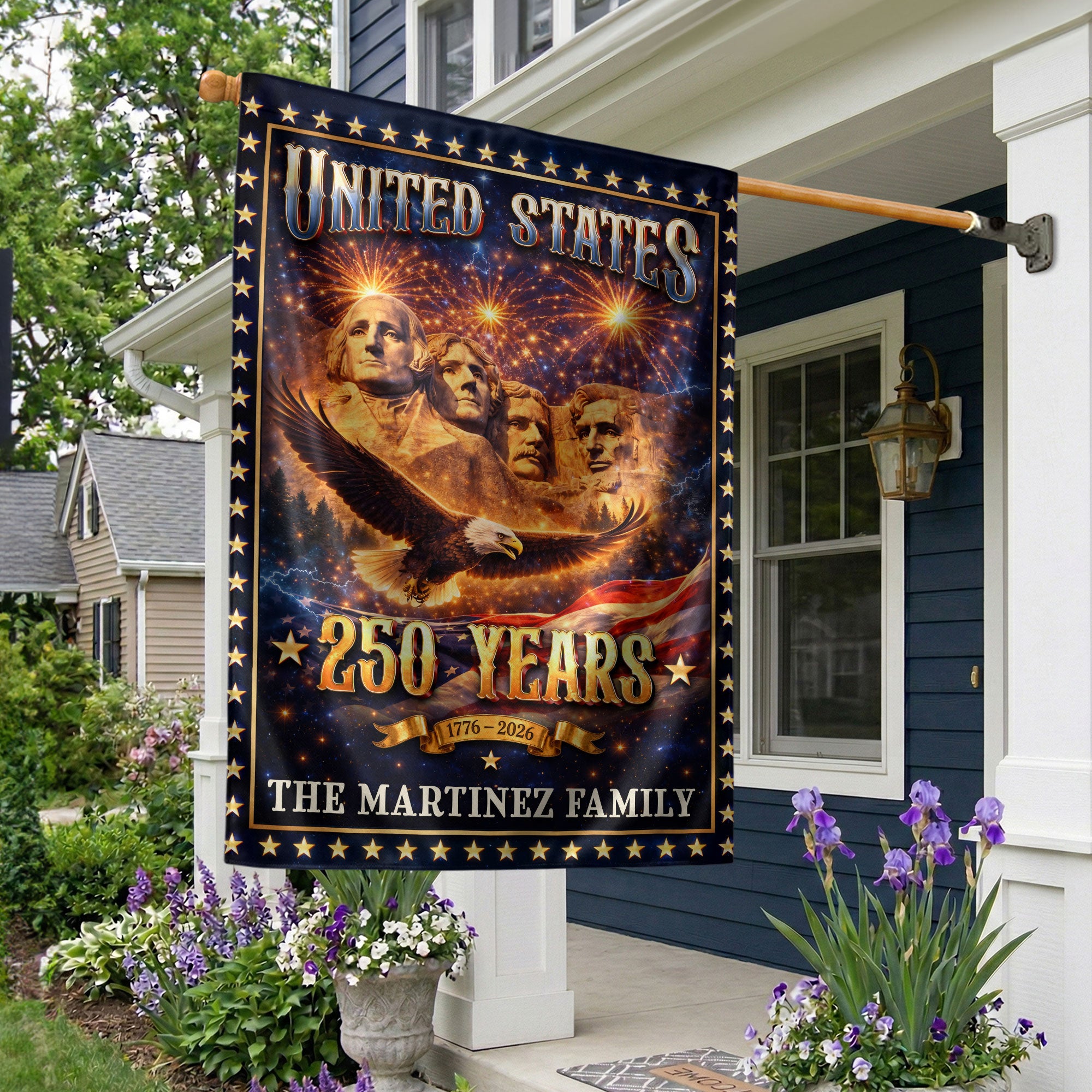 Mount Rushmore Patriotic Garden Flag with Custom Family Name 250 Years 1776-2026 Banner