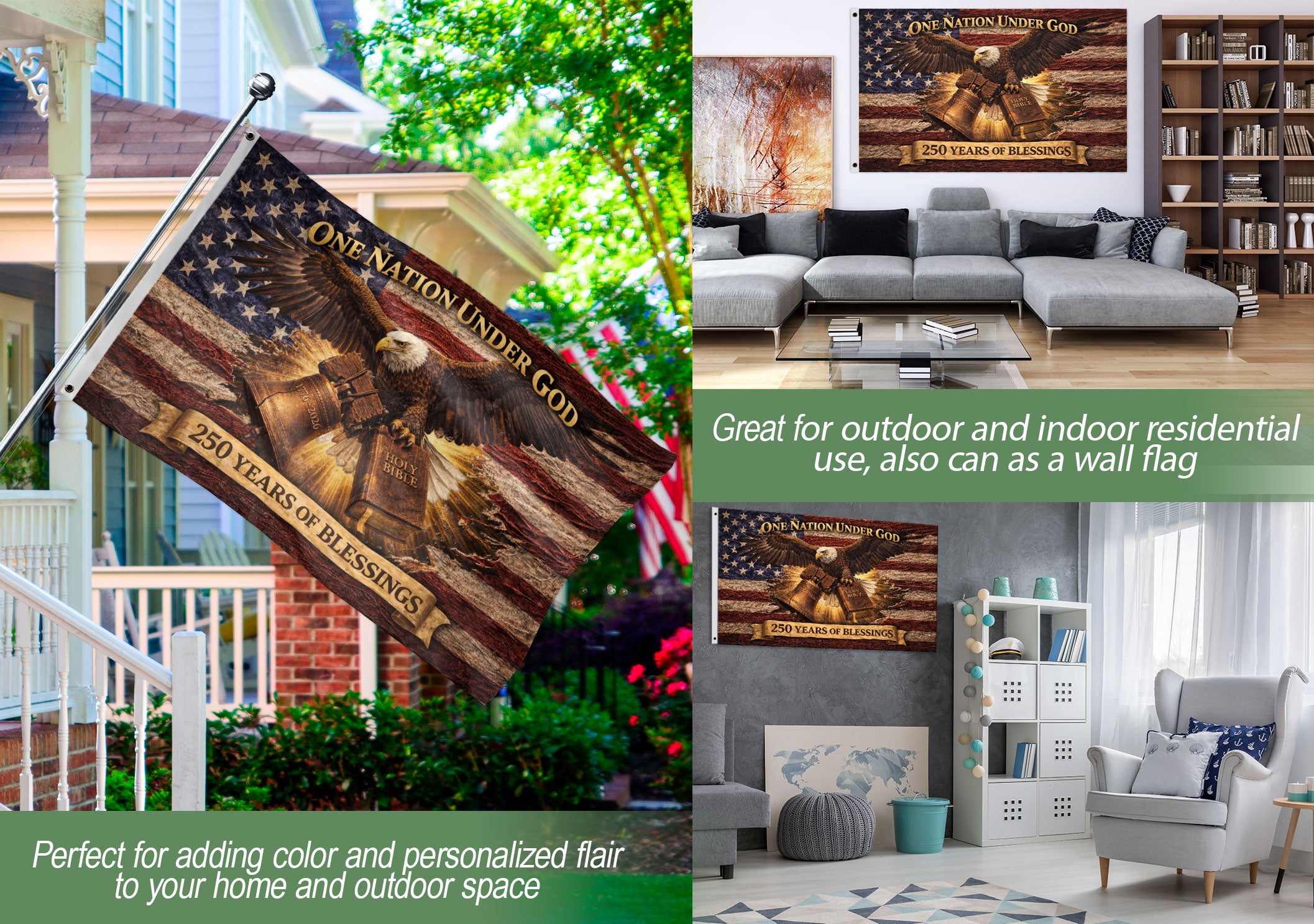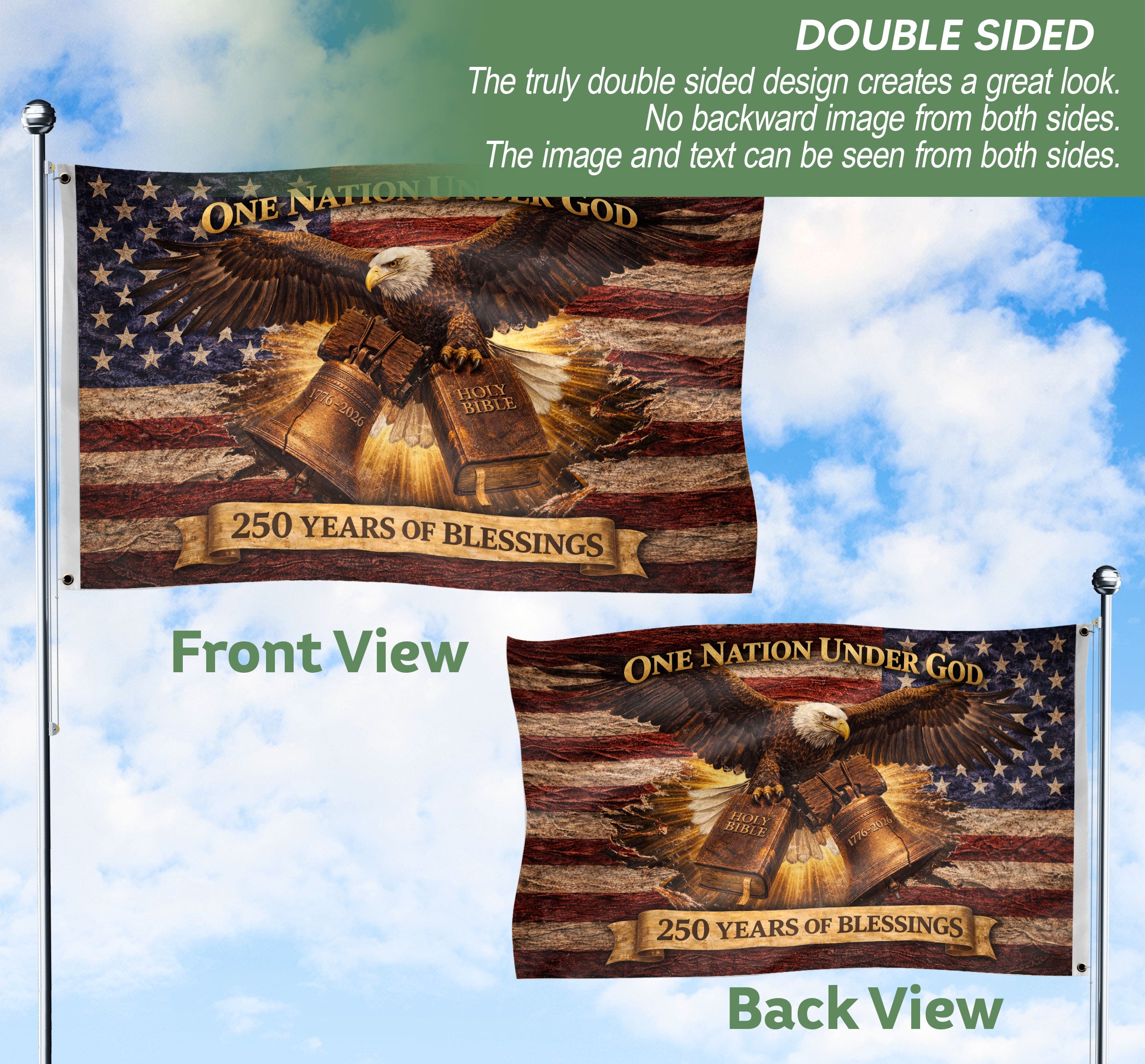 One Nation Under God 250 Years Flag 1776-2026 Bald Eagle Holy Bible Patriotic Banner
