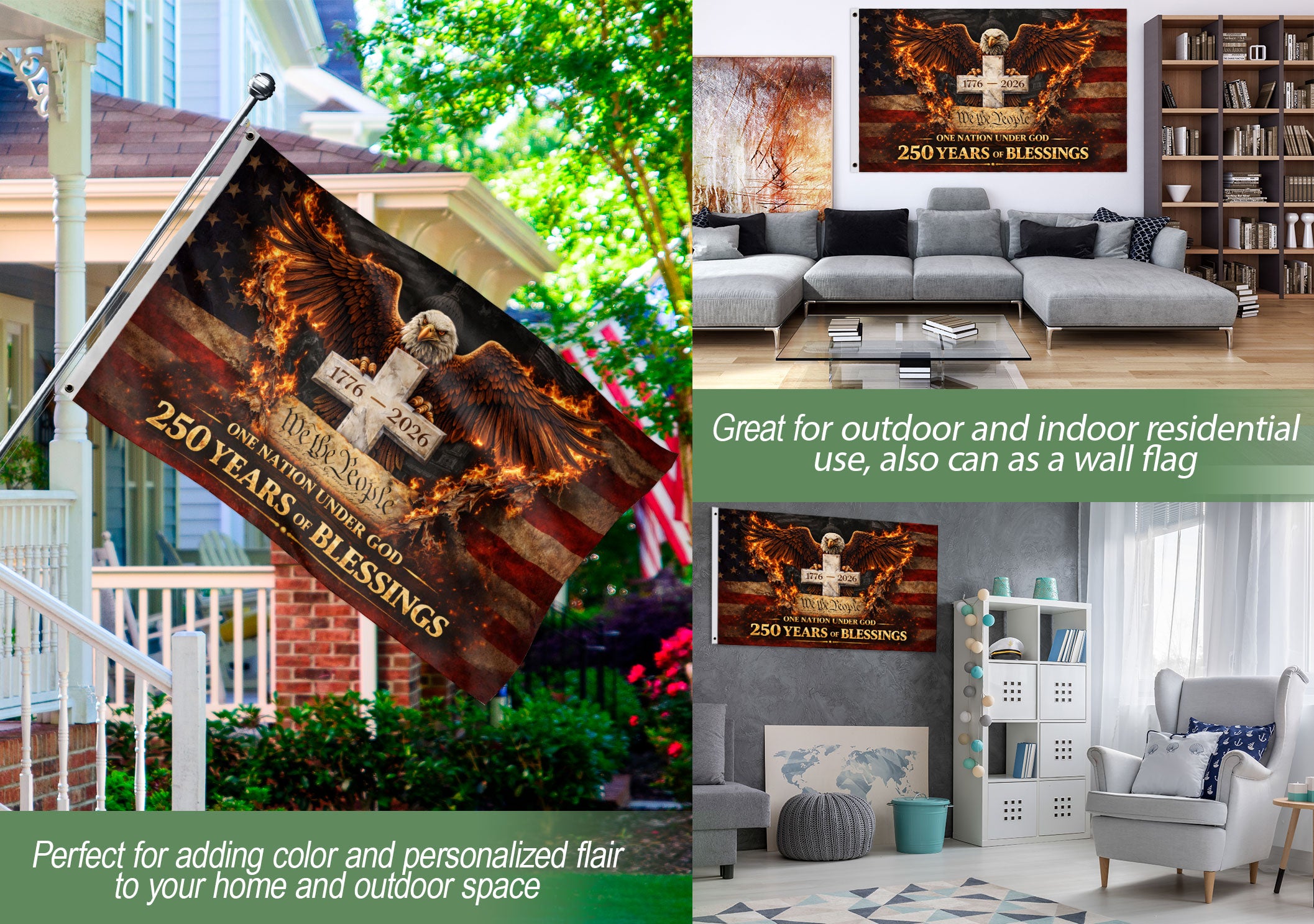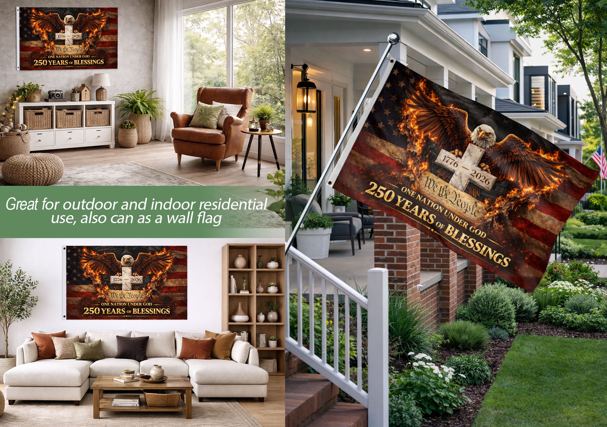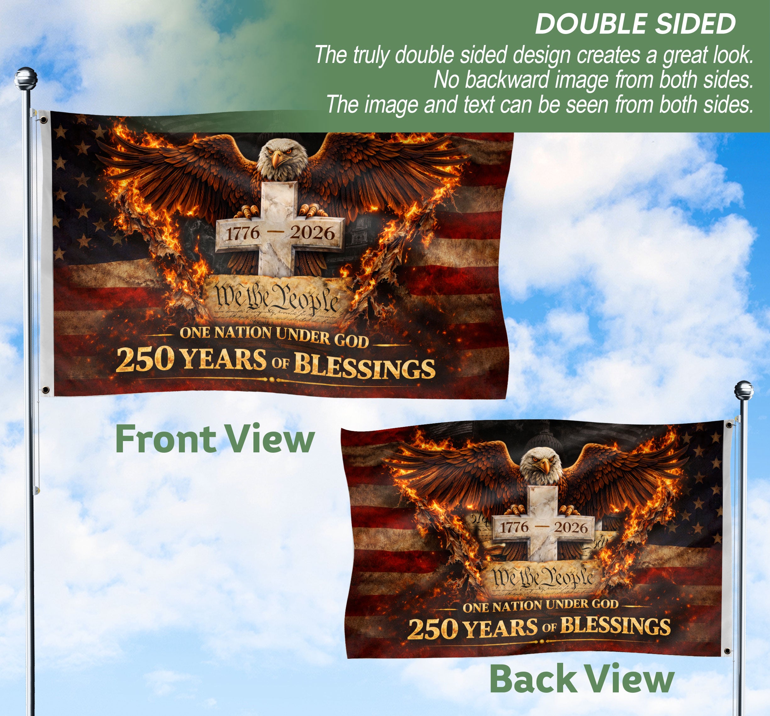 Celebrate 250 years of American independence with the One Nation Under God 250 Years Flag, spanning 1776-2026. This double-sided house flag features a striking design with an eagle and cross, symbolizing faith, patriotism, and unity. Crafted for durability, it displays the powerful message ‘One Nation Under God’ on both sides, perfect for porches, homes, or outdoor displays. Made from high-quality polyester fabric that withstands weather elements, ensuring vibrant colors and clear details year-round. Ideal for patriots, Christians, and history enthusiasts honoring enduring American values and freedom through faith. Easy to hang with reinforced grommets, this flag measures standard house flag size for versatile use during holidays, Independence Day, or daily pride.