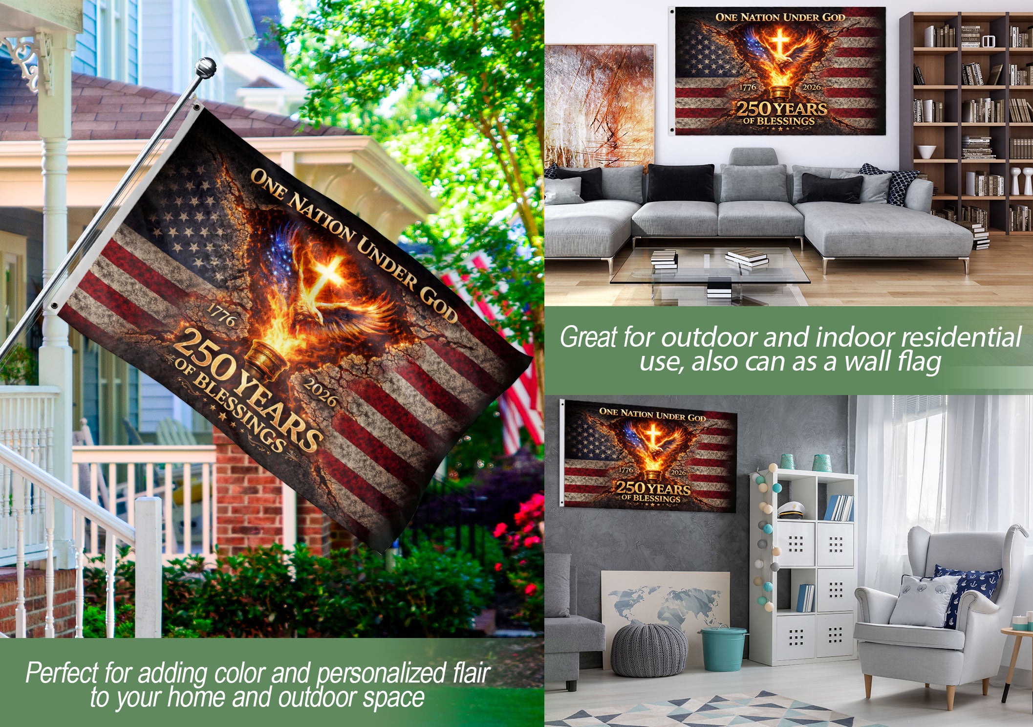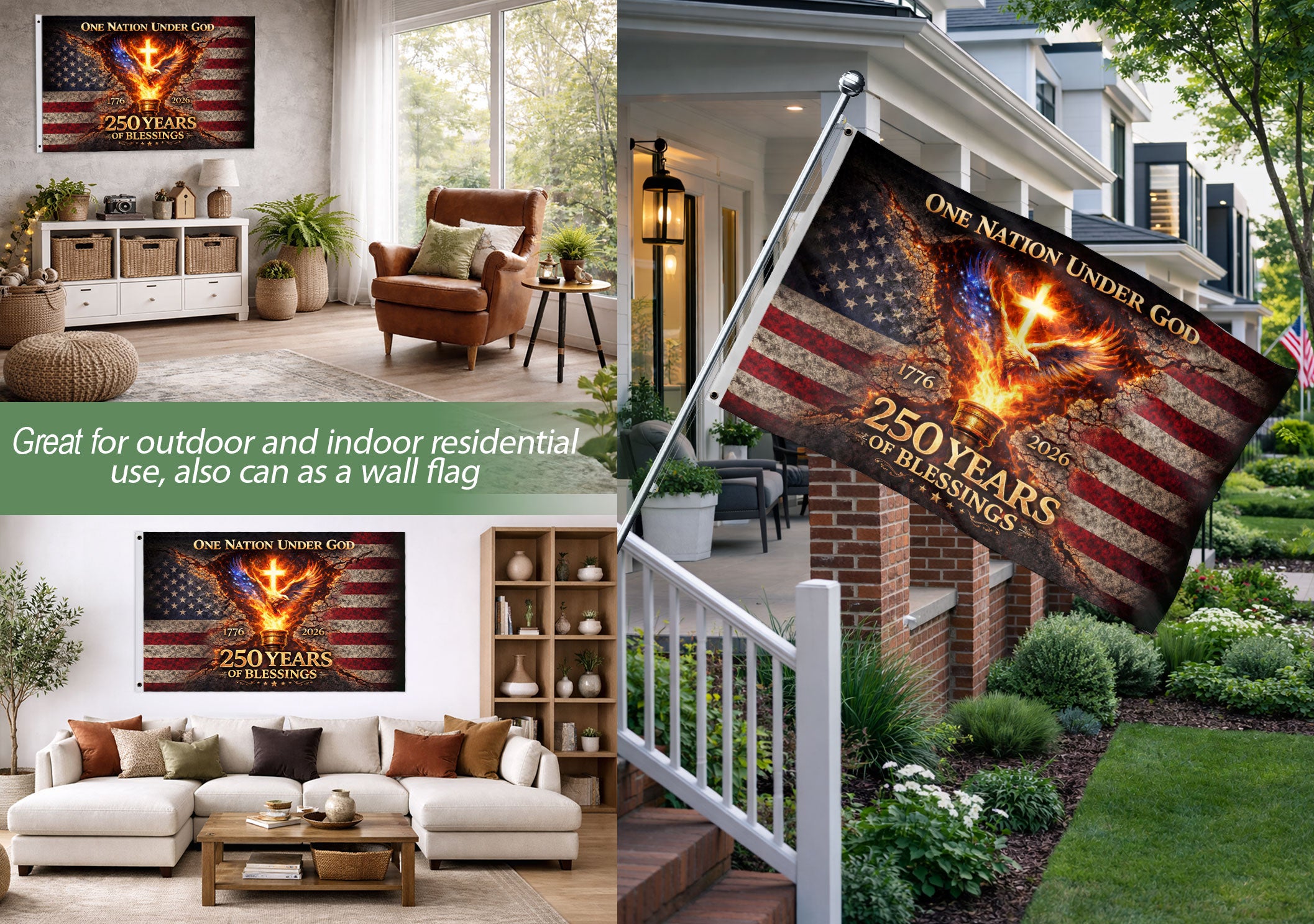 Celebrate 250 years of American history with the One Nation Under God 250 Years Flag, spanning 1776-2026. This double-sided house flag features a powerful design with an eagle and cross, symbolizing faith, patriotism, and unity. Crafted for durability, it’s perfect for displaying on your porch, garden, or home to honor the nation’s Christian heritage and enduring spirit. Made with high-quality polyester fabric that withstands outdoor conditions, the vibrant print is visible from both sides. Ideal for Independence Day, Memorial Day, or everyday pride in the USA’s journey.