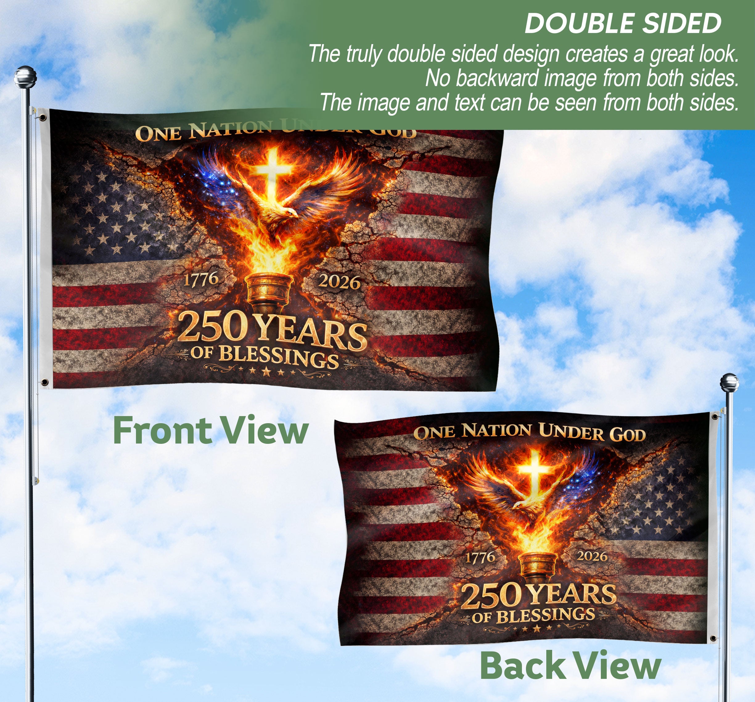 One Nation Under God 250 Years USA Flag 1776-2026 Eagle Cross Christian Double Sided House Flag