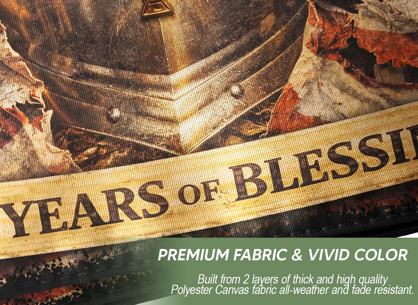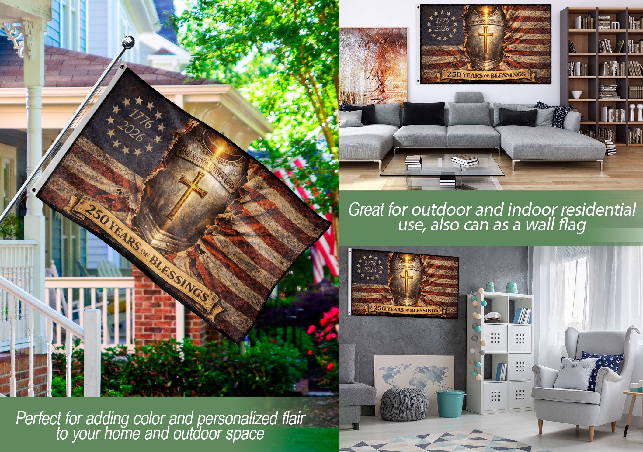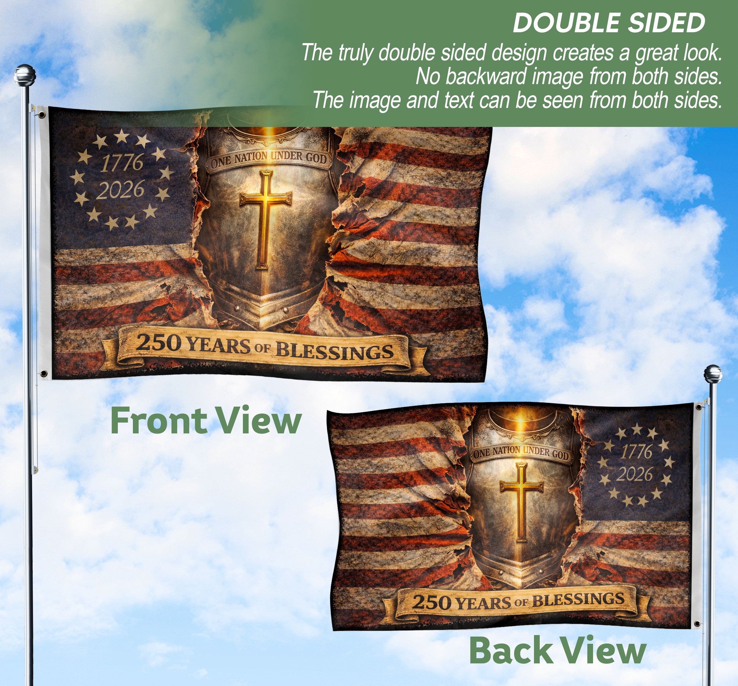 Celebrate 250 years of American independence with the One Nation Under God 250th Anniversary Flag (1776–2026). This striking commemorative banner features a radiant cross on a shield emerging from a distressed American flag backdrop, symbolizing faith, divine protection, and enduring freedom. The bold message ‘One Nation Under God – 250 Years of Blessings’ honors the 2026 semiquincentennial milestone. Perfect for displaying at homes, churches, patriotic events, Fourth of July celebrations, veterans’ memorials, or outdoor gatherings. Crafted with durable fabric for indoor and outdoor use, this Christian patriotic flag withstands weather while showcasing national pride and religious heritage. Ideal for history enthusiasts, faith-based communities, and supporters of American values.