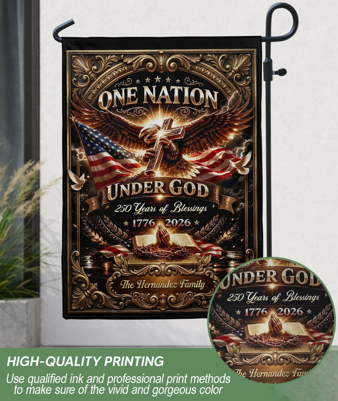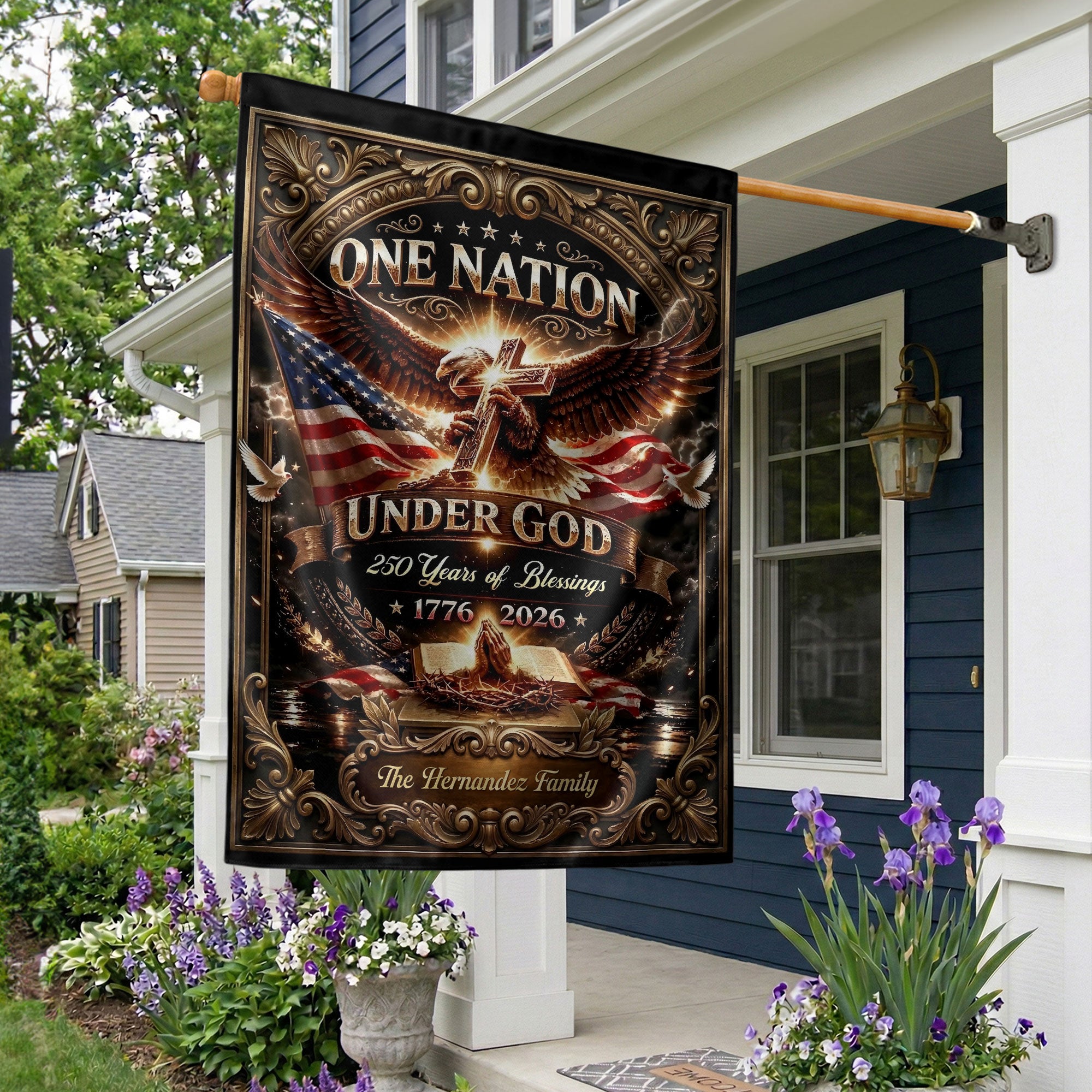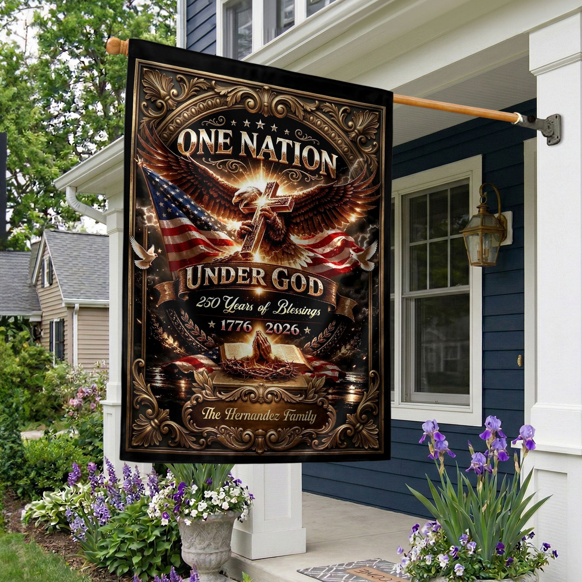 Celebrate America’s 250th anniversary from 1776 to 2026 with this custom family name garden flag. The design features a majestic eagle, Christian cross, open Bible, and the patriotic phrase ‘One Nation Under God.’ Perfect for displaying in your garden, yard, or patio to honor the nation’s spiritual heritage and historical journey. Personalize it with your family name for a unique touch. Made from durable, weather-resistant polyester fabric that withstands outdoor elements. Ideal for patriots, history enthusiasts, churches, and as a thoughtful gift for family gatherings, Independence Day, or Memorial Day. Easy to hang with a standard garden flag pole (not included). Show your pride in America’s blessings and faith-based foundations.