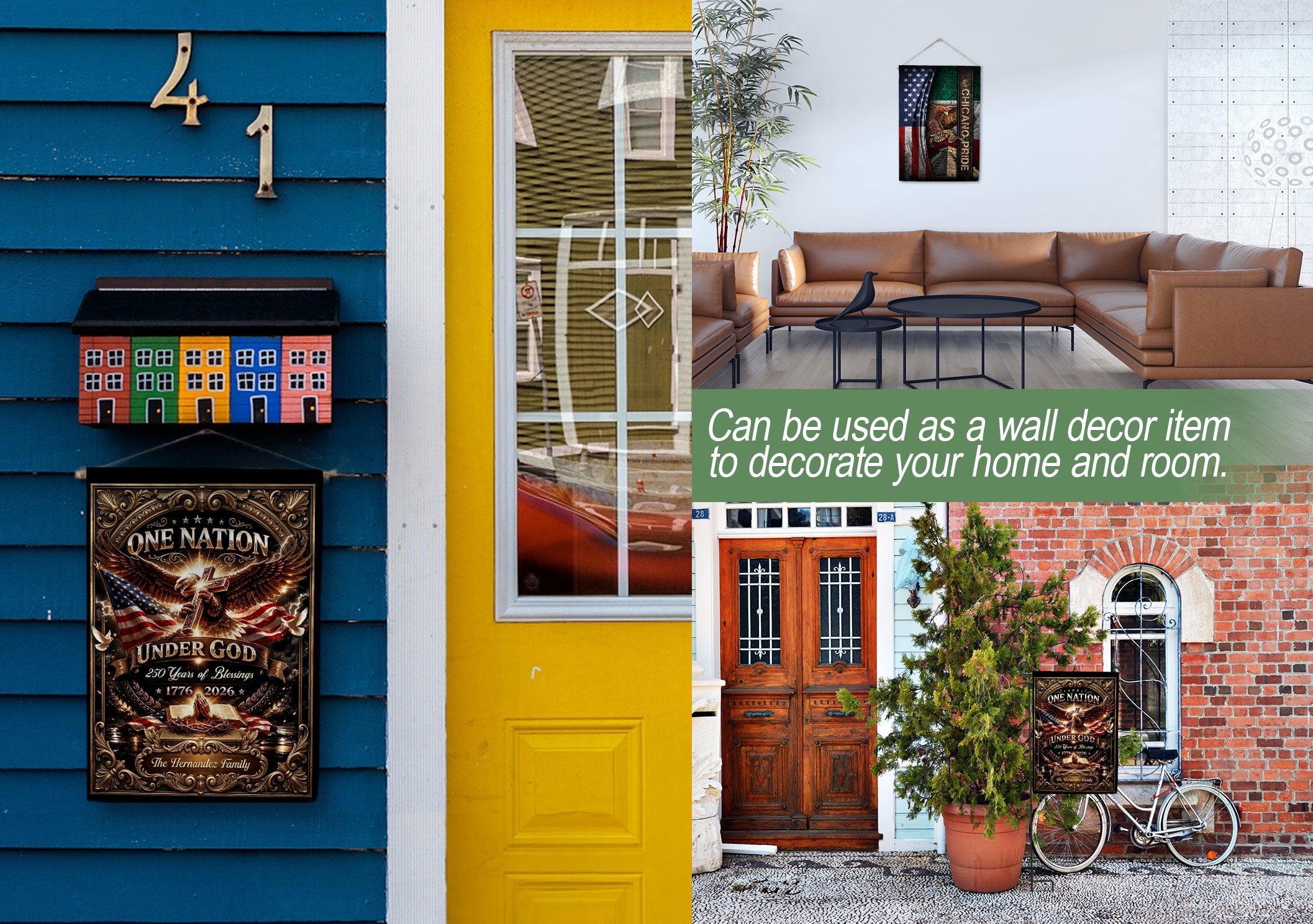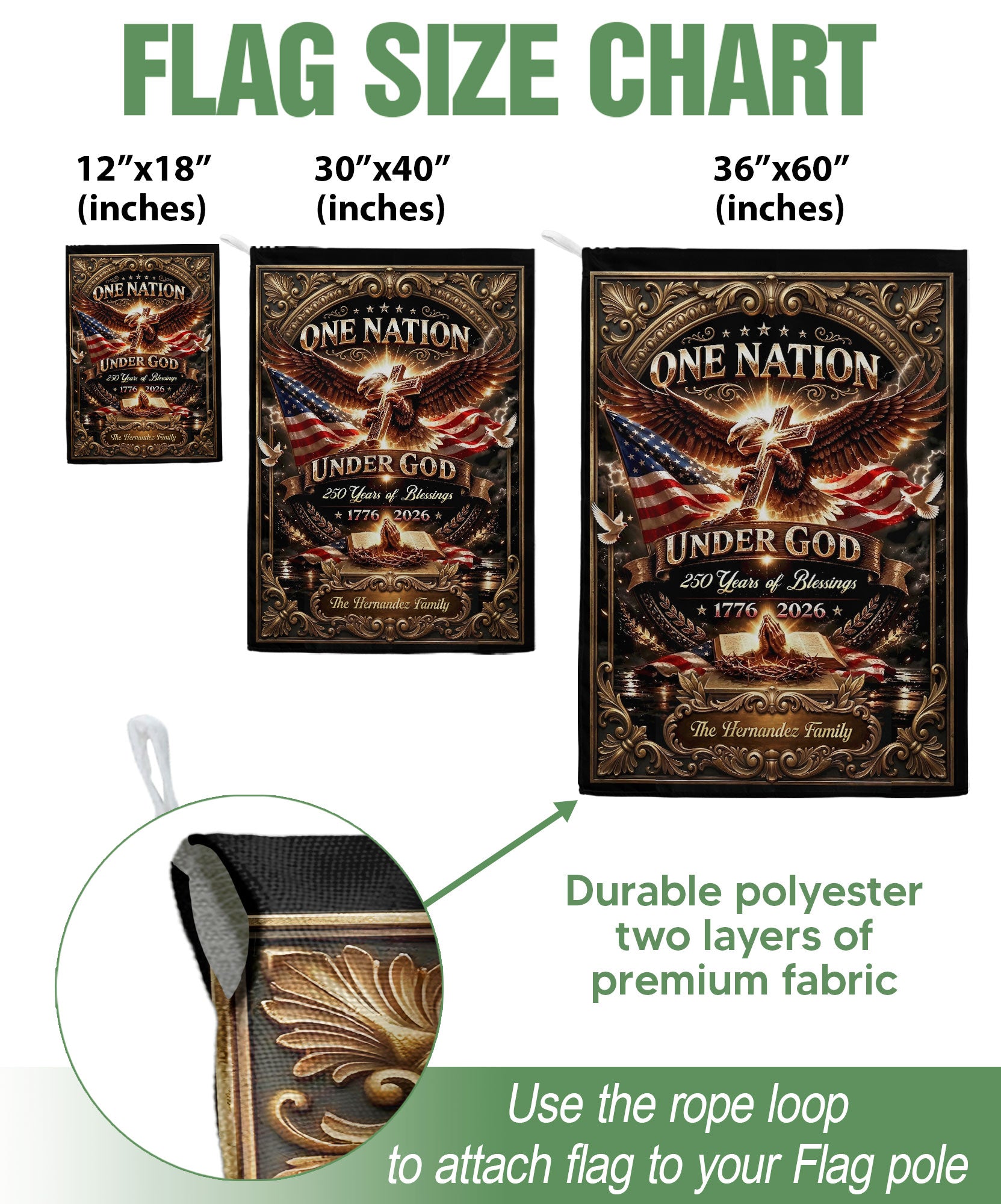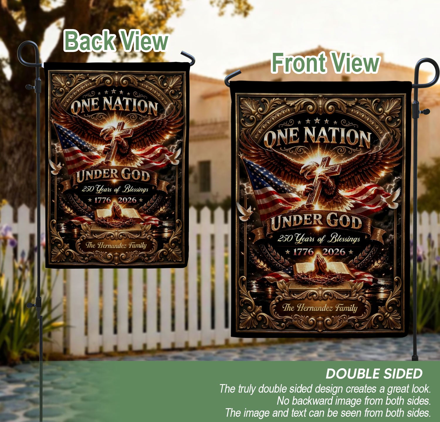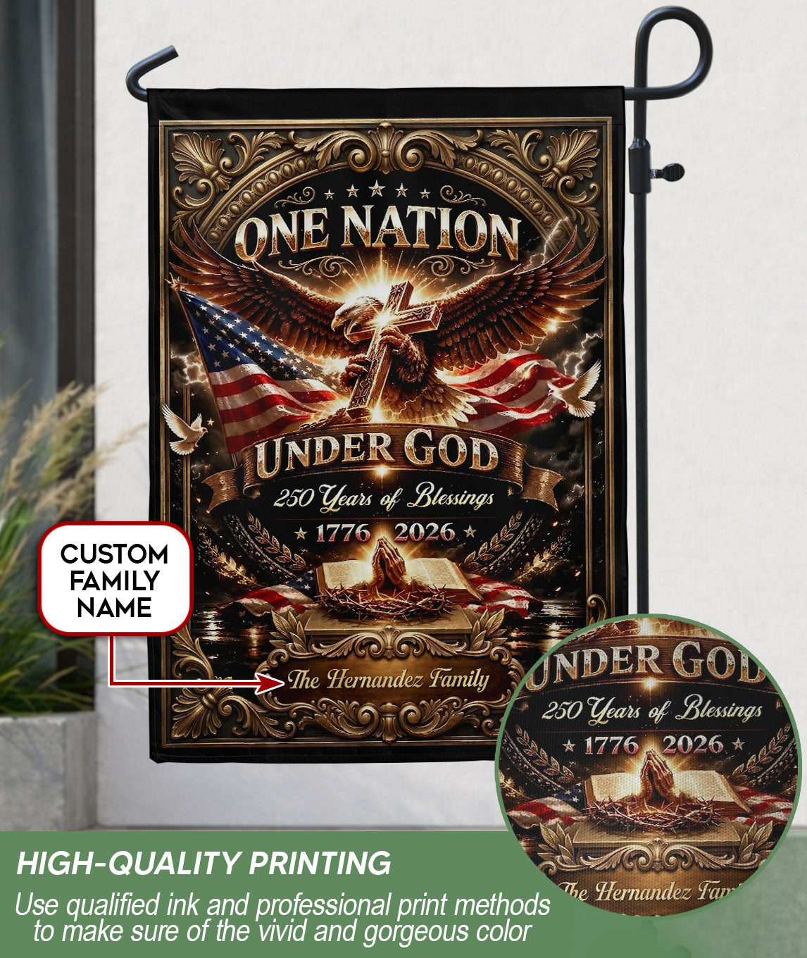 Celebrate America’s 250th anniversary from 1776 to 2026 with this custom family name garden flag. The design features a majestic eagle, Christian cross, open Bible, and the patriotic phrase ‘One Nation Under God.’ Perfect for displaying in your garden, yard, or patio to honor the nation’s spiritual heritage and historical journey. Personalize it with your family name for a unique touch. Made from durable, weather-resistant polyester fabric that withstands outdoor elements. Ideal for patriots, history enthusiasts, churches, and as a thoughtful gift for family gatherings, Independence Day, or Memorial Day. Easy to hang with a standard garden flag pole (not included). Show your pride in America’s blessings and faith-based foundations.