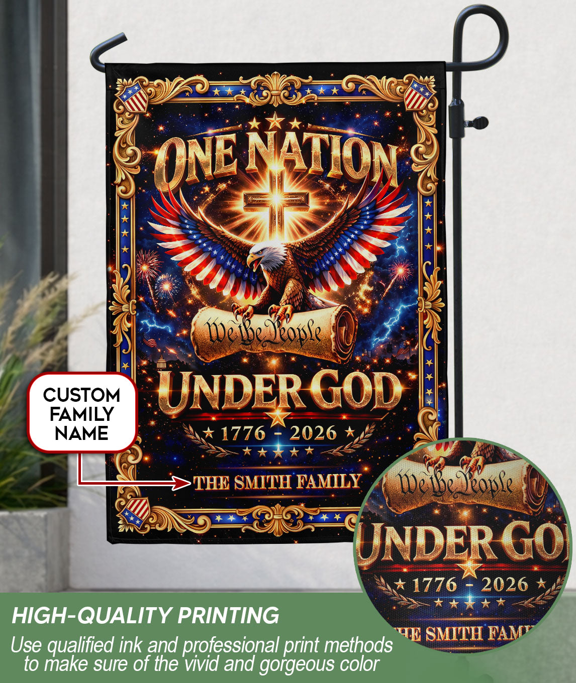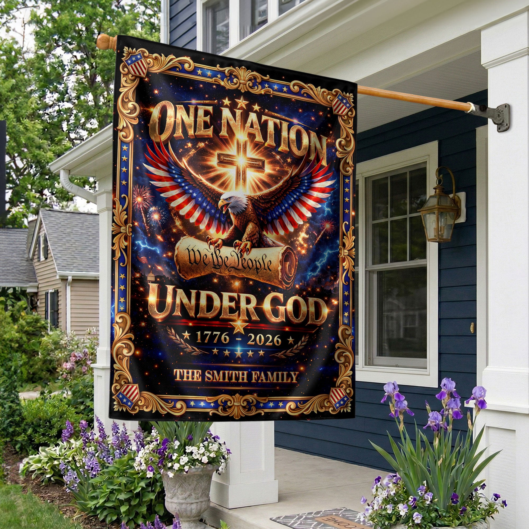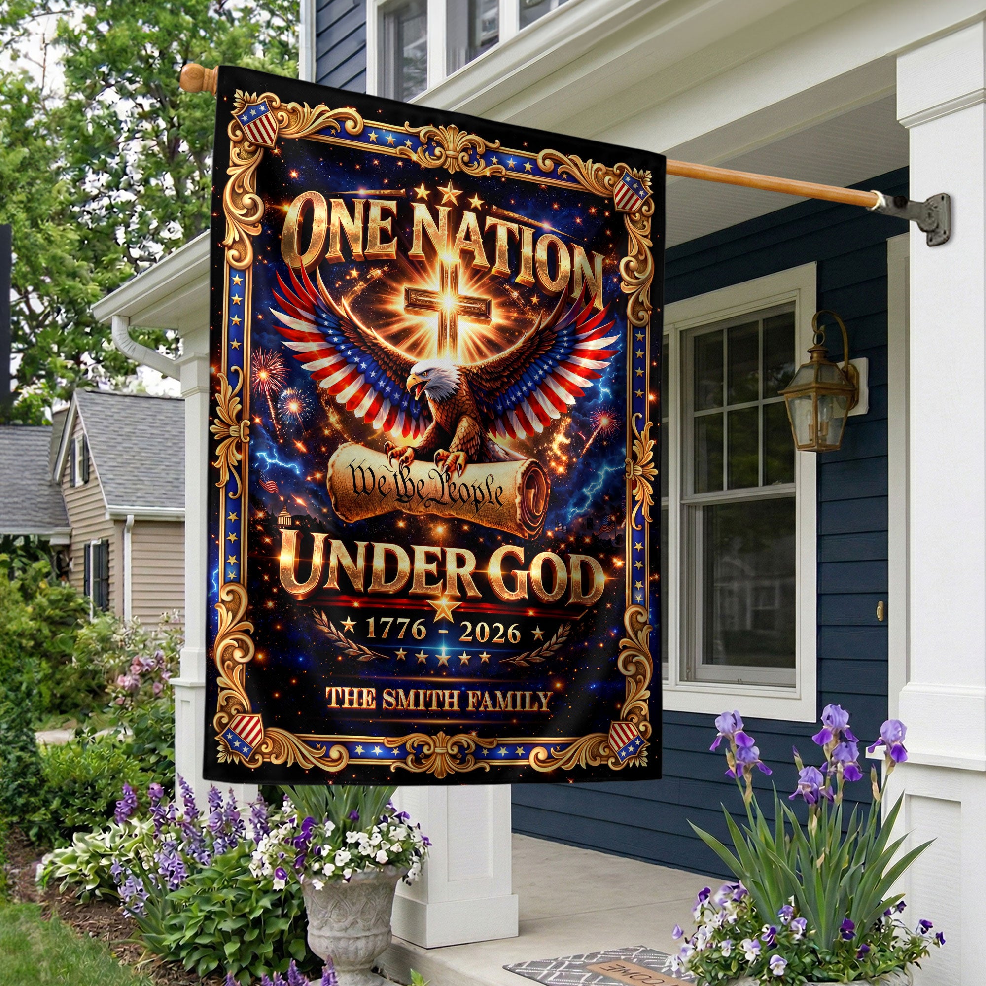 Celebrate America’s 250th anniversary from 1776 to 2026 with this custom family name garden flag. The design features a majestic eagle, sacred cross, ‘We the People’ inscription, and ‘One Nation Under God’ motto, honoring the nation’s spiritual heritage and historical journey. Crafted for outdoor display, this durable garden flag adds patriotic pride to your yard, porch, or garden bed. Personalize it with your family name for a unique touch that commemorates this milestone. Ideal for history enthusiasts, veterans, and families cherishing faith and freedom. Easy to install on garden stakes or poles, weather-resistant for long-lasting vibrancy.