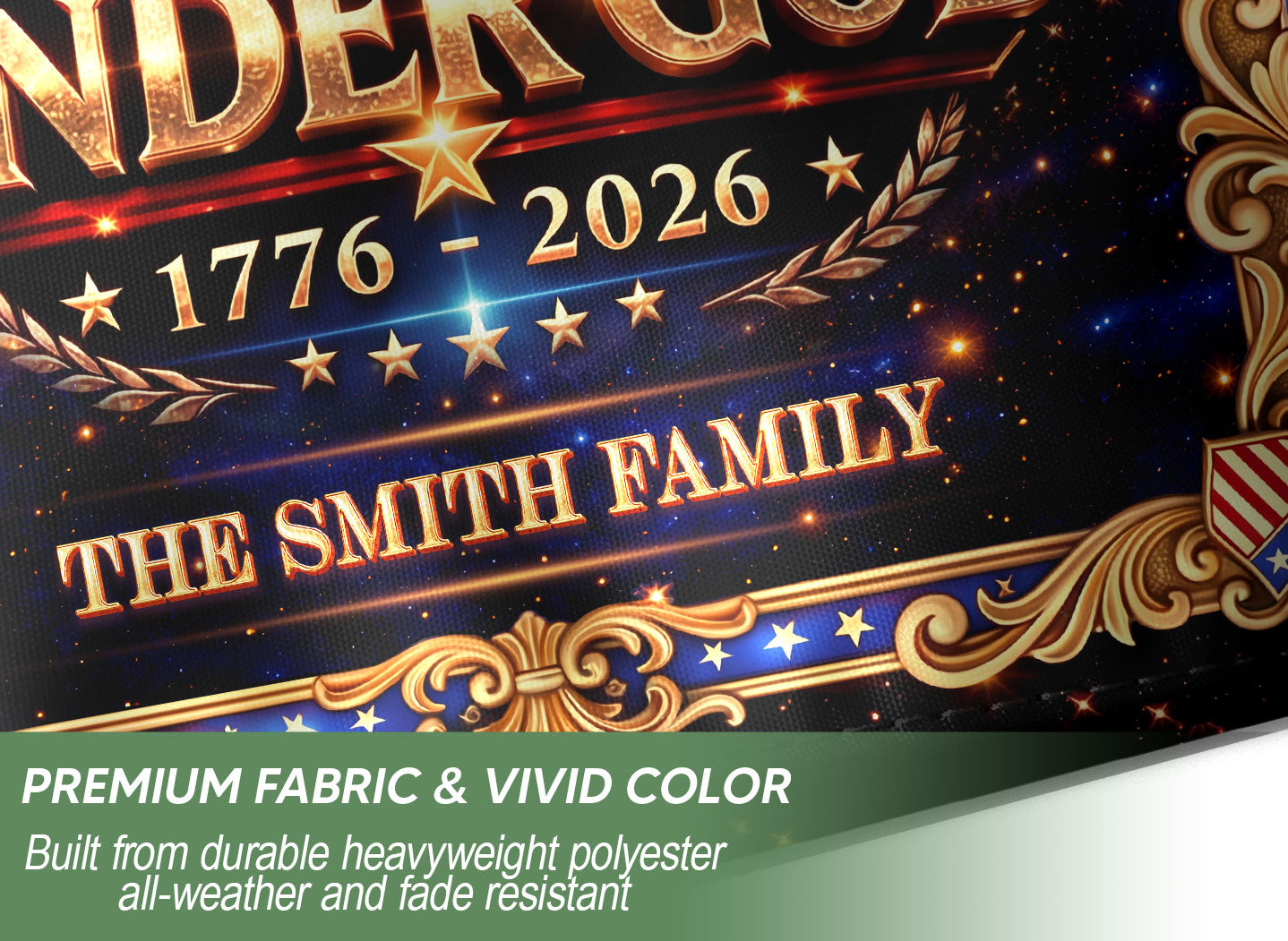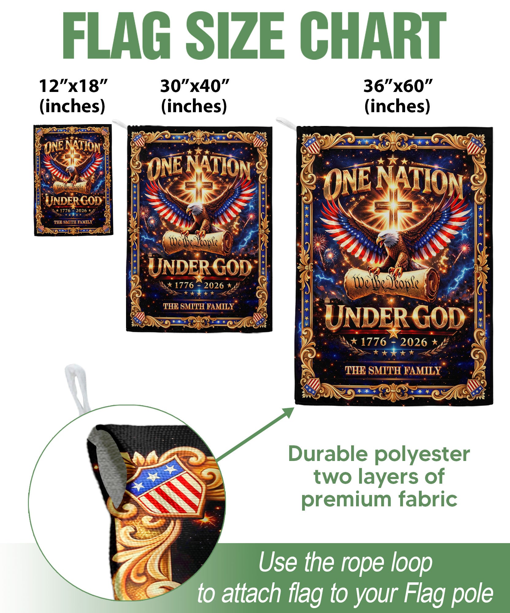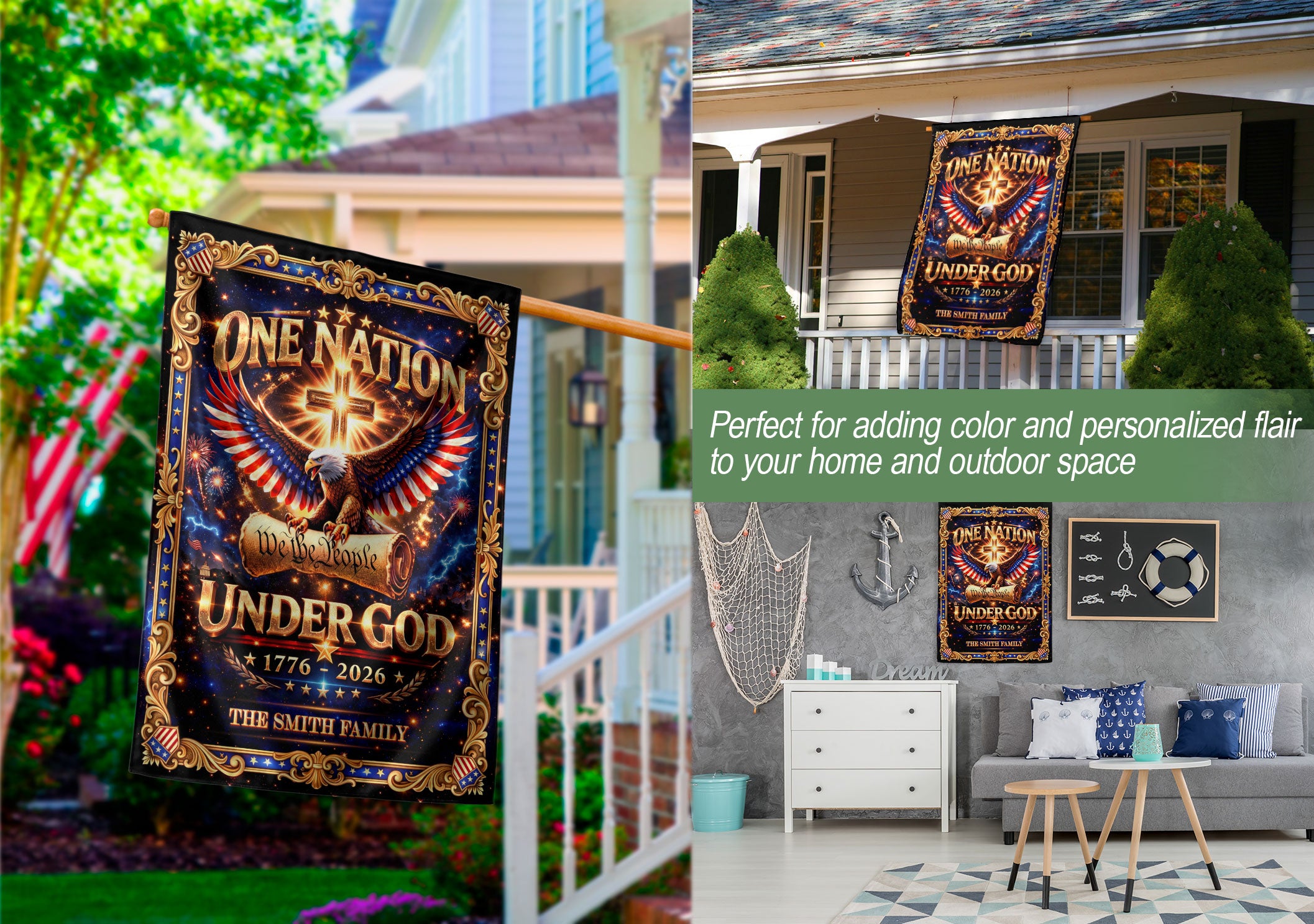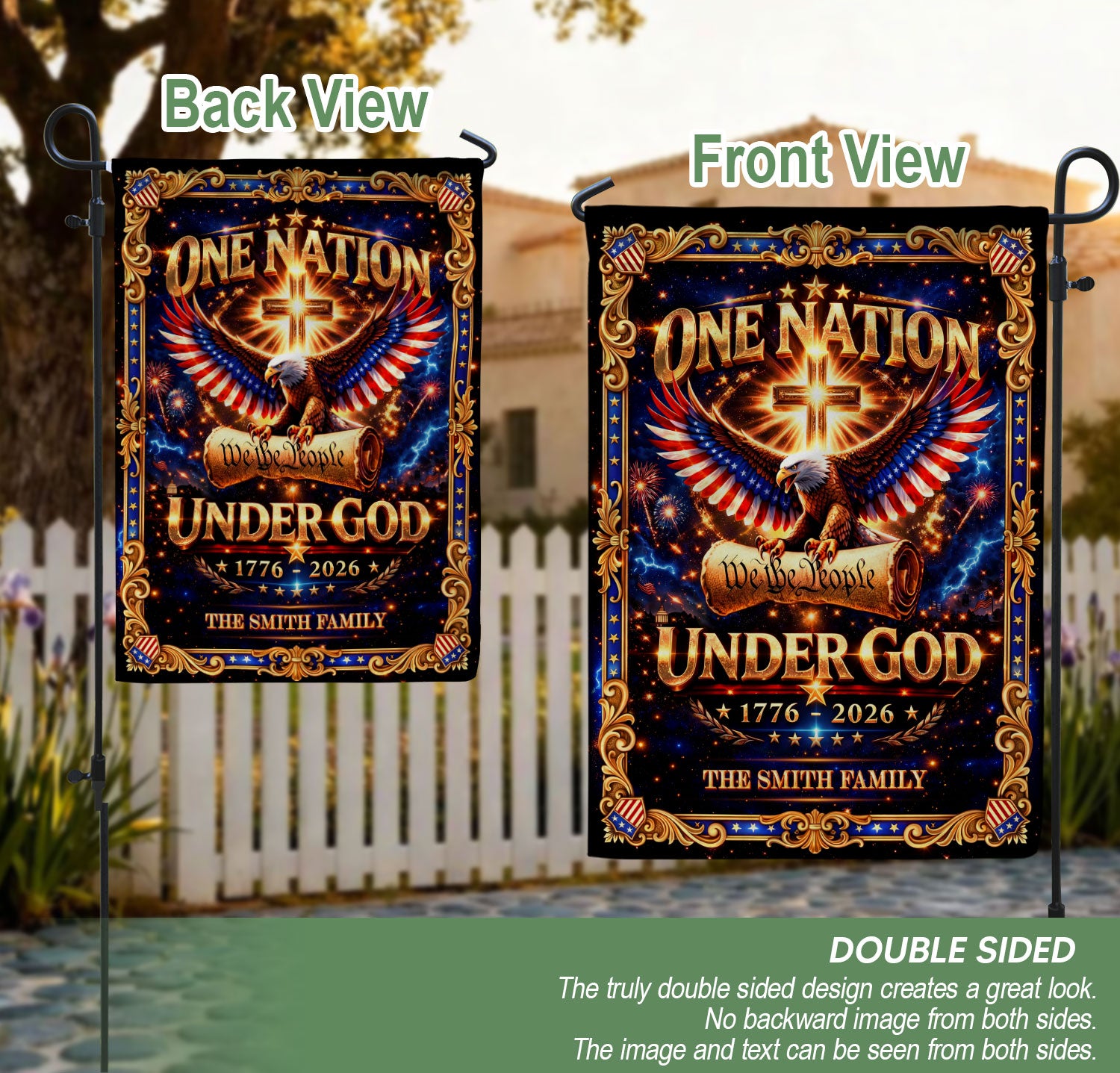 Celebrate America’s 250th anniversary from 1776 to 2026 with this custom family name garden flag. The design features a majestic eagle, sacred cross, ‘We the People’ inscription, and ‘One Nation Under God’ motto, honoring the nation’s spiritual heritage and historical journey. Crafted for outdoor display, this durable garden flag adds patriotic pride to your yard, porch, or garden bed. Personalize it with your family name for a unique touch that commemorates this milestone. Ideal for history enthusiasts, veterans, and families cherishing faith and freedom. Easy to install on garden stakes or poles, weather-resistant for long-lasting vibrancy.