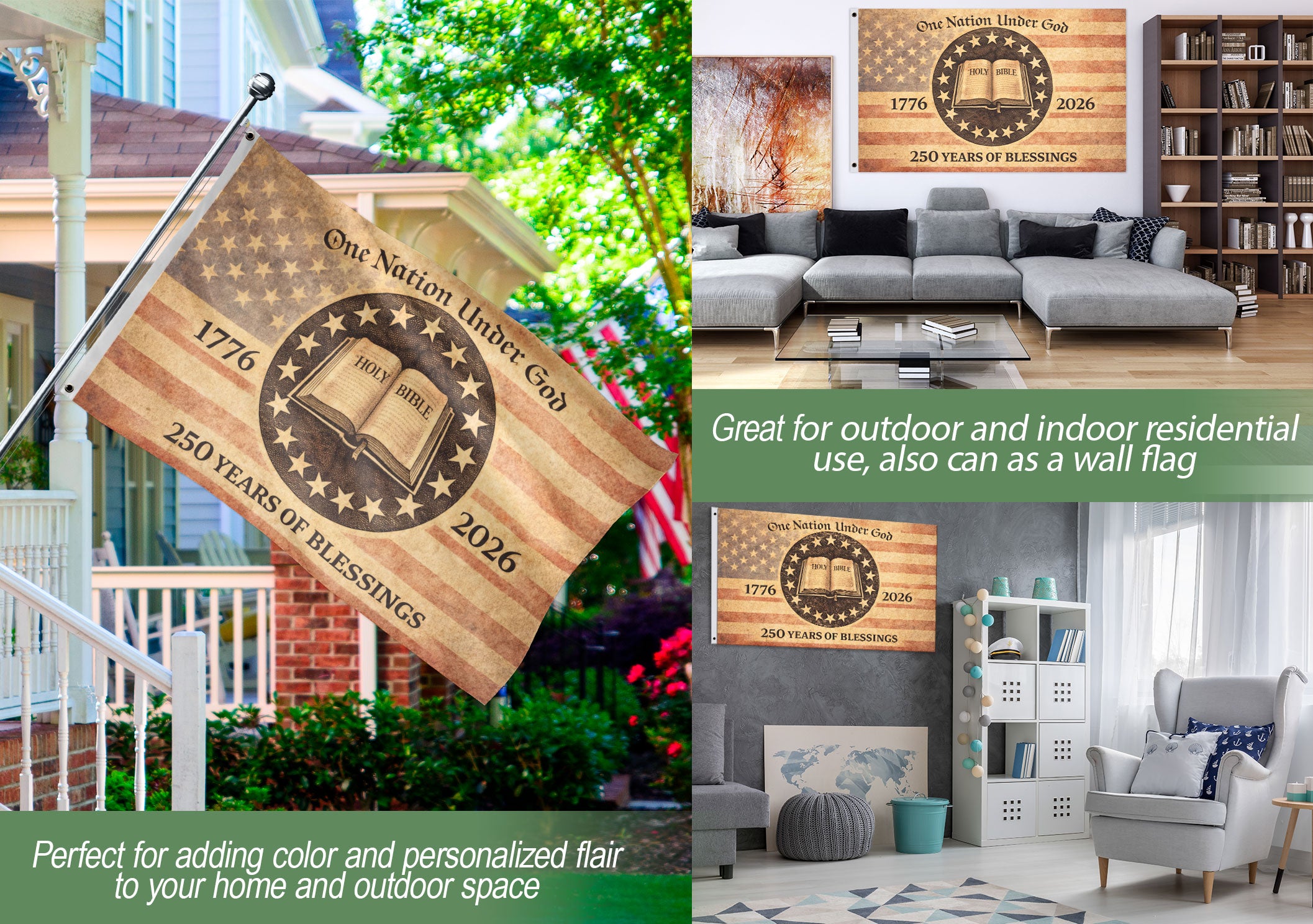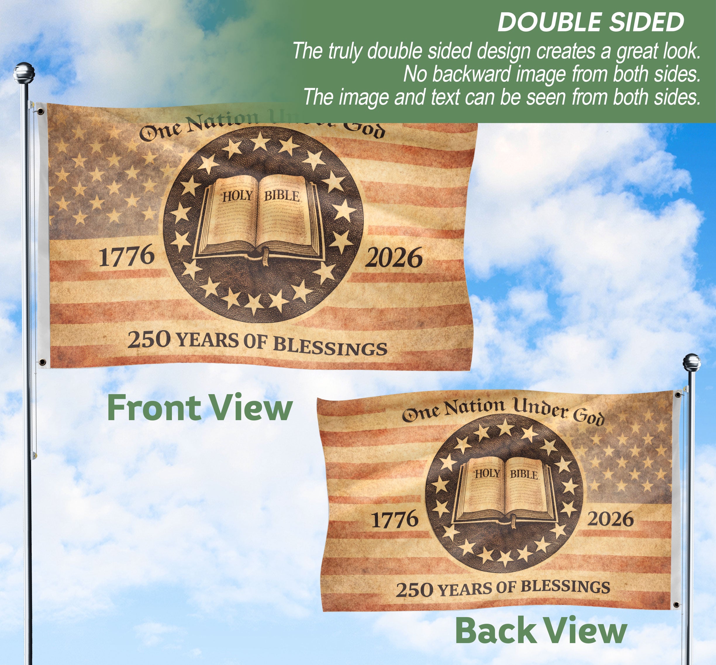 Celebrate America’s 250th anniversary with the One Nation Under God Christian Patriotic Flag, featuring the Holy Bible and Cross banner. This double-sided flag spans 1776-2026, honoring 250 years of blessings, faith, and freedom. Crafted for powerful outdoor display, it reflects spiritual conviction, gratitude, and unwavering American pride. Perfect for homes, gardens, porches, or events, this durable patriotic banner stands as a bold symbol of national heritage and Christian values. Hang it high to showcase your devotion to God and country during Independence Day, Memorial Day, or everyday patriotism.