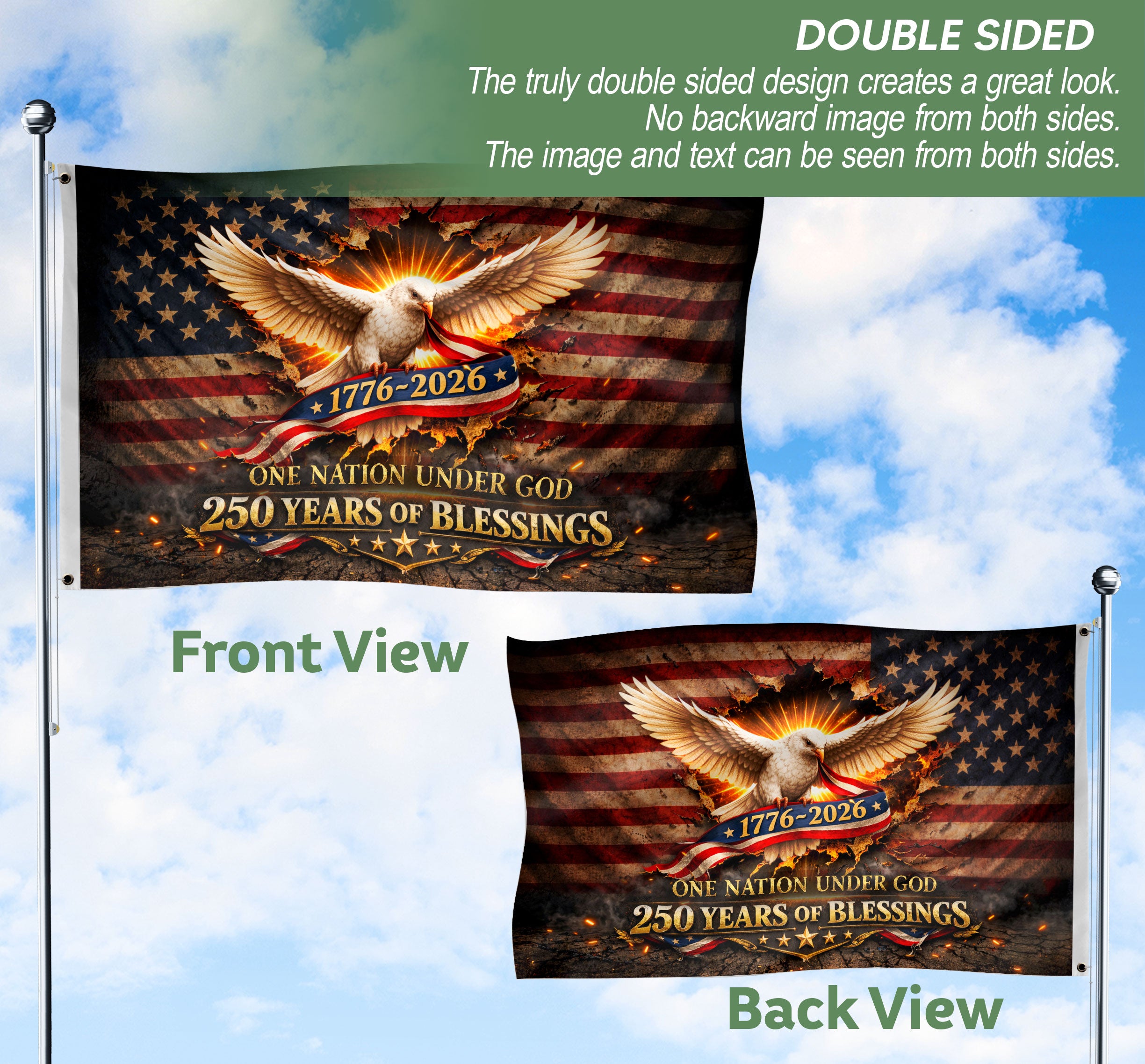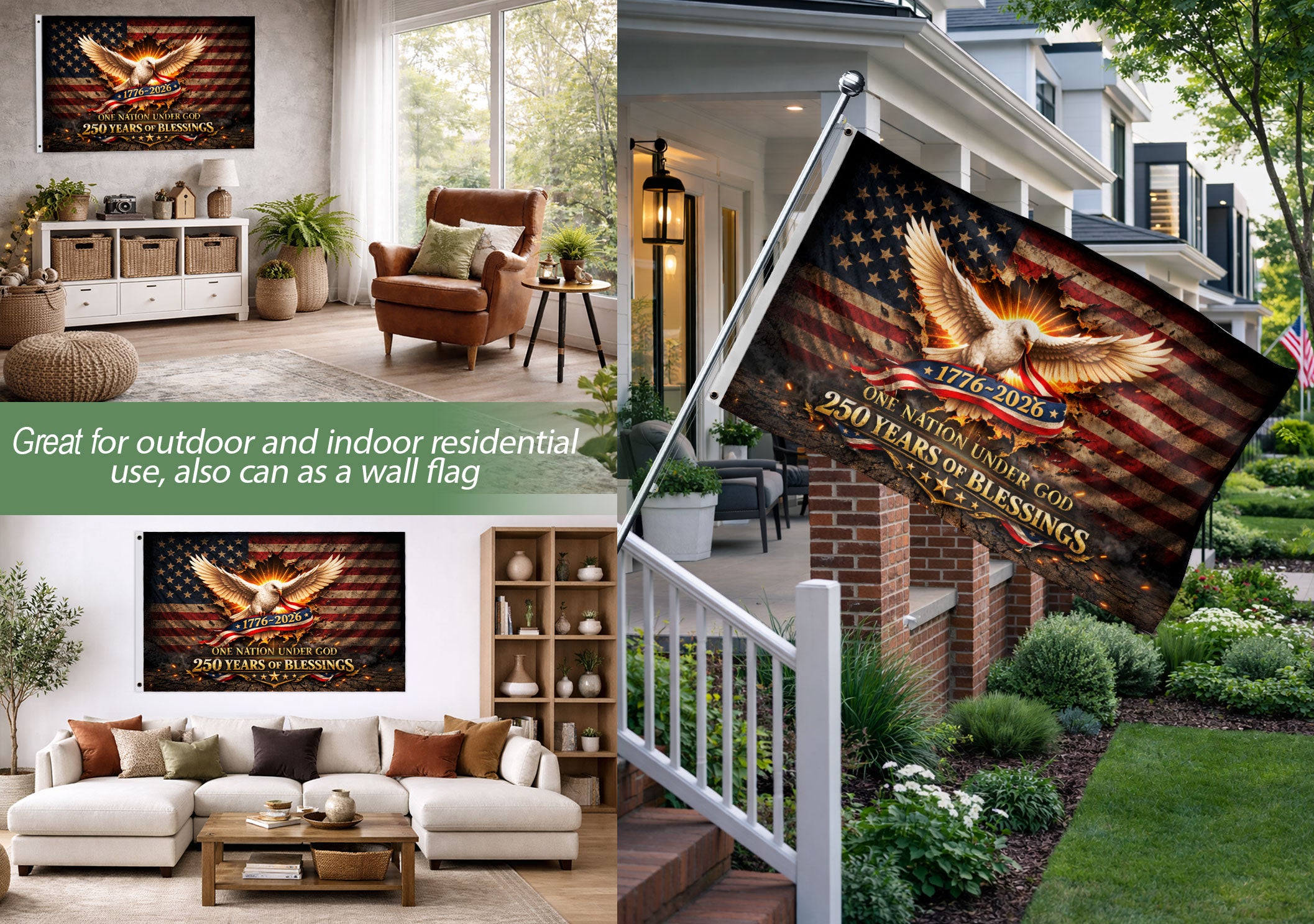 Celebrate America’s 250th anniversary with this One Nation Under God house flag, spanning 1776-2026. The design features a majestic white eagle soaring proudly against a backdrop of stars and stripes, symbolizing freedom, faith, and national pride. Perfect for patriotic decor on porches, gardens, or homes during holidays, Independence Day, or everyday display. Crafted for outdoor durability, this commemorative flag withstands weather while showcasing blessings and American heritage. Ideal for patriots honoring 250 years of USA history.