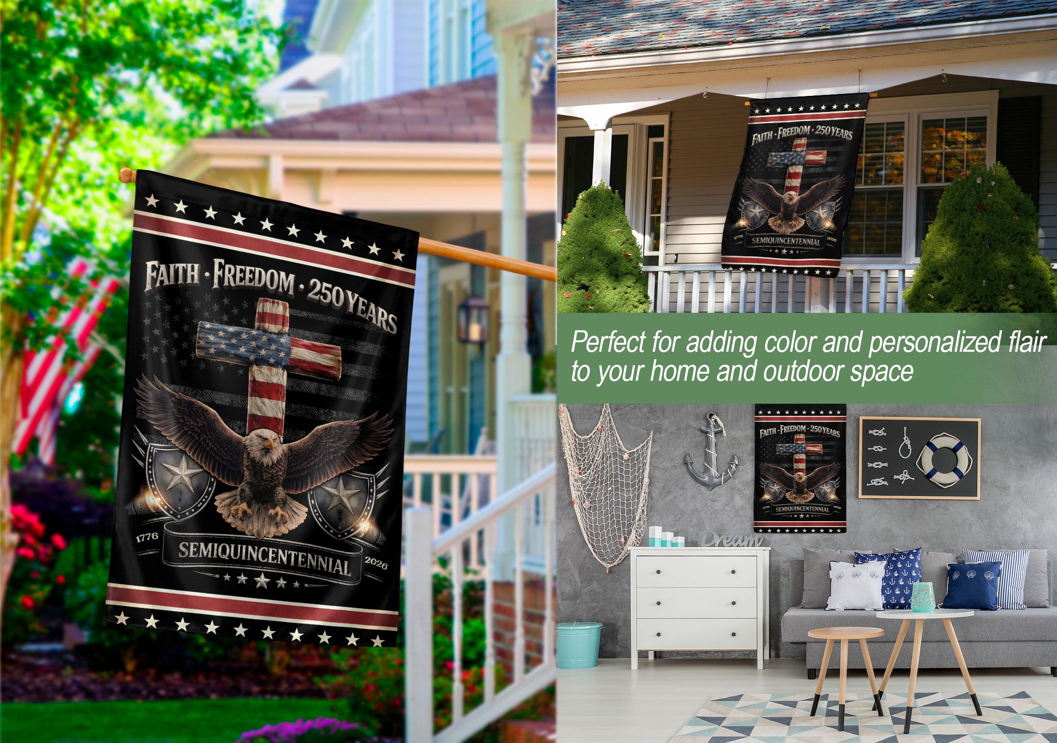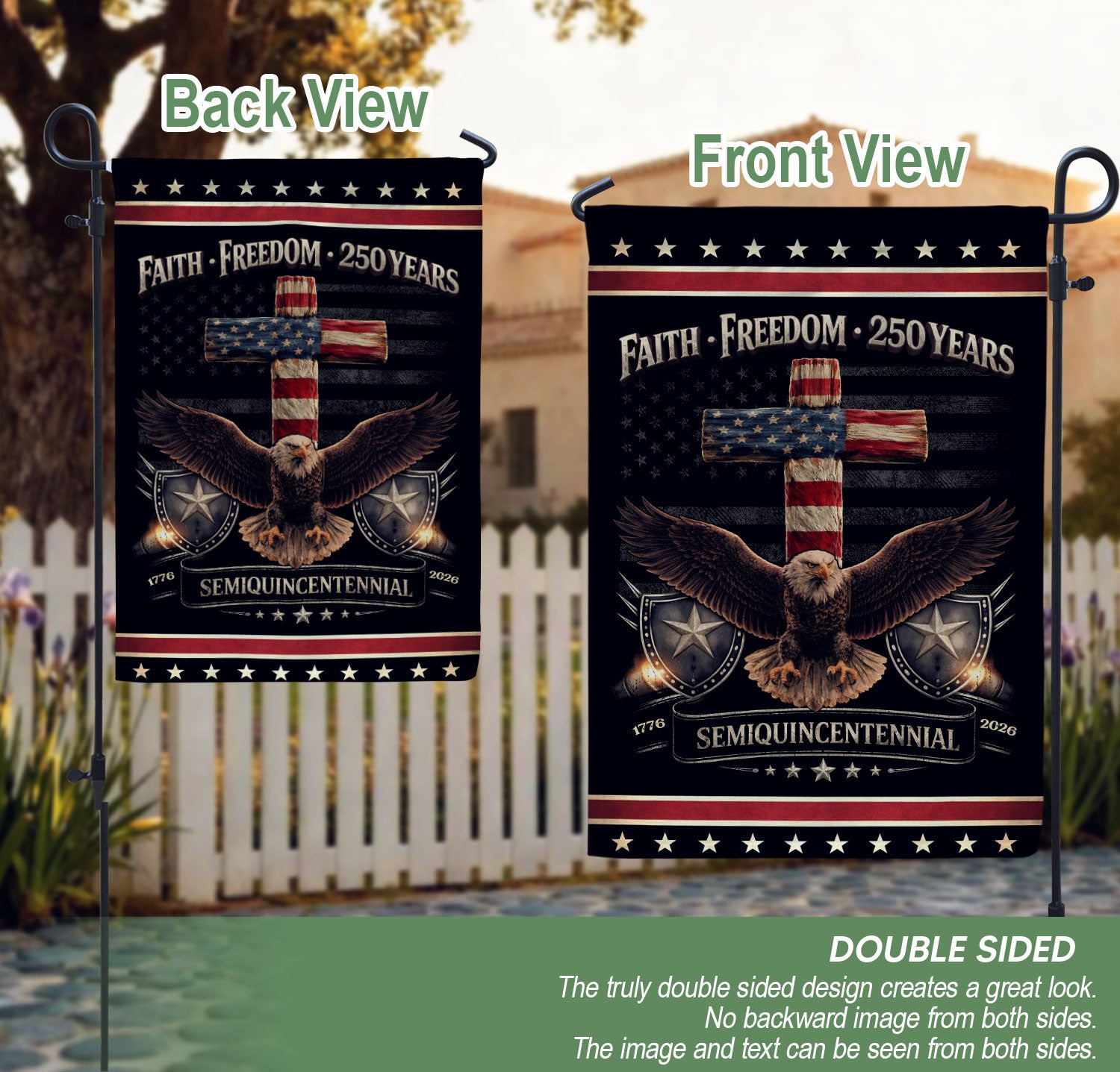 Celebrate the 250th anniversary of the United States with this double-sided patriotic house flag featuring the bold message ‘One Nation Under God.’ The striking design showcases a powerful eagle and cross symbolizing courage, faith, freedom, and the enduring promise of liberty. Perfect for yard decor, porches, or garden flags, this high-quality flag stands proudly to honor American heritage and values like ‘We The People.’ Durable construction ensures it withstands outdoor conditions while displaying vibrant colors on both sides. Ideal for Independence Day, Memorial Day, or everyday display of patriotism and belief.