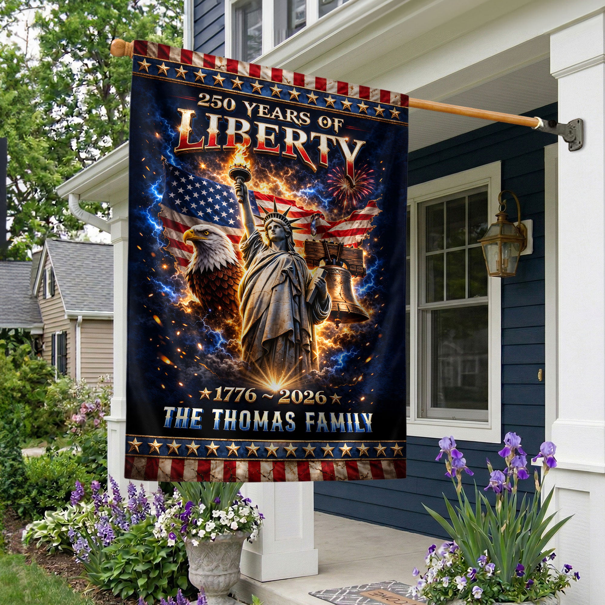 Custom Family Name Patriotic Garden Flag 250 Years Freedom 1776-2026 Torch Statue Liberty