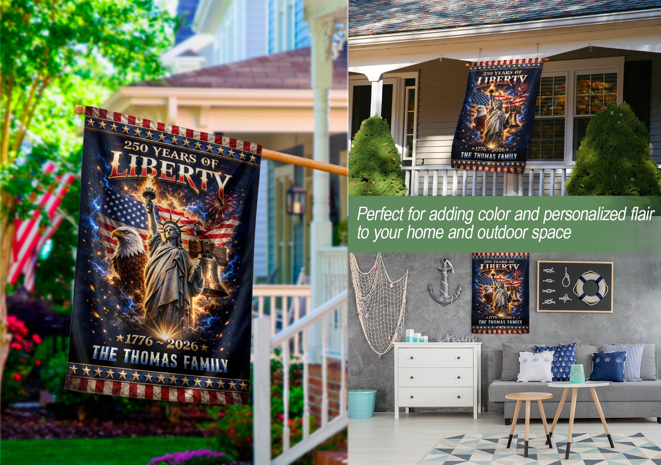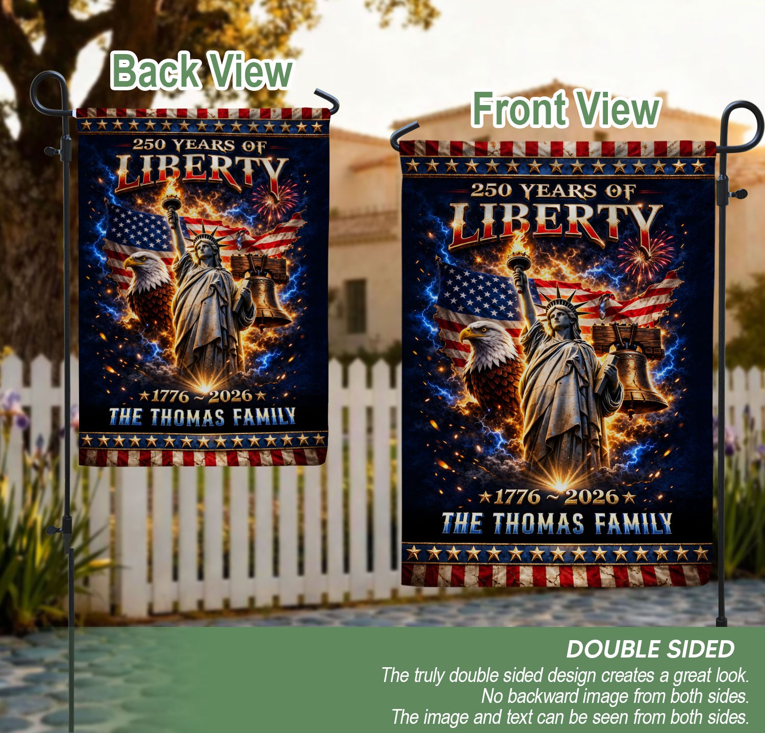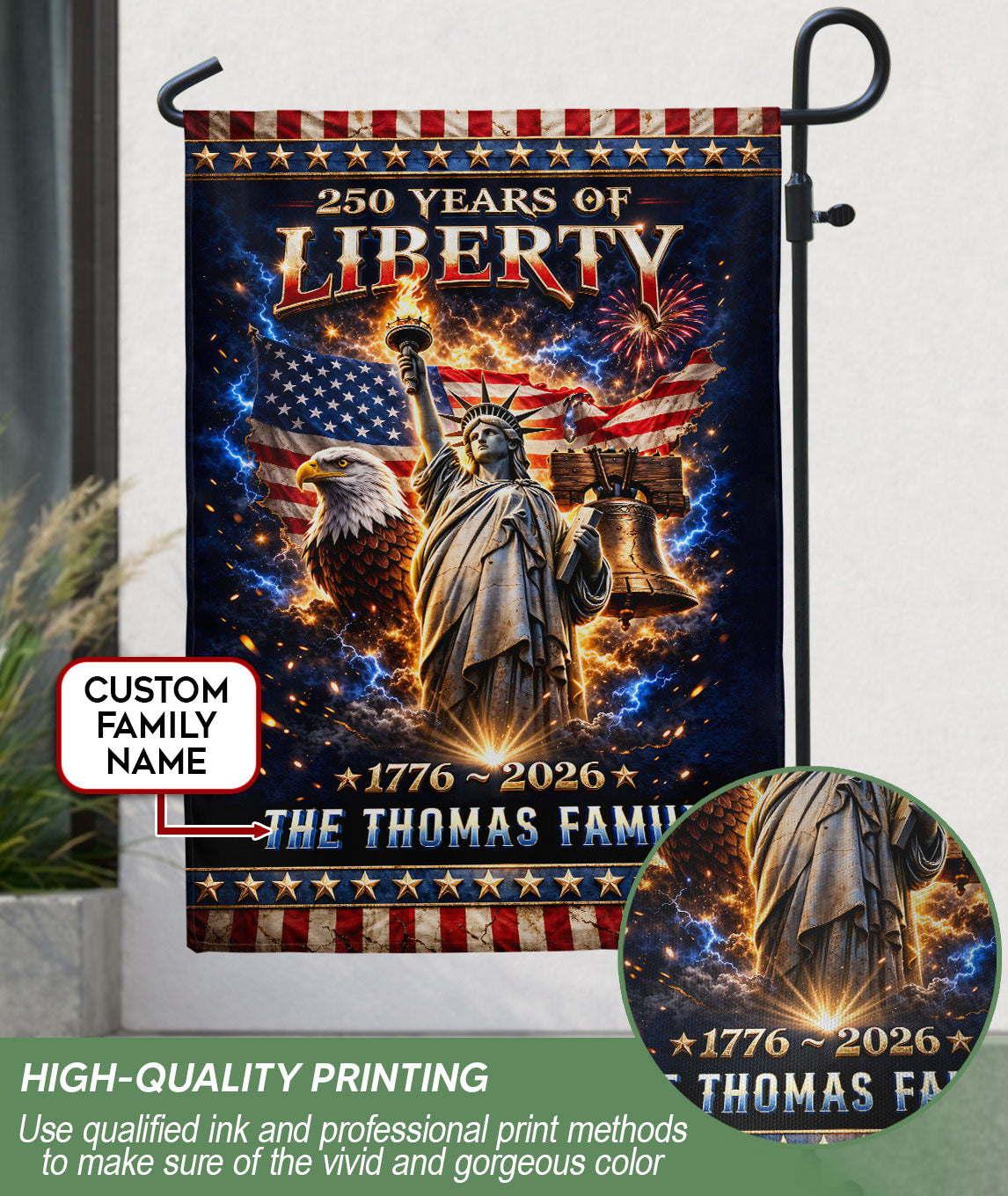 Celebrate America’s 250th anniversary from 1776 to 2026 with this personalized garden flag. Customize it with your family name for a unique patriotic display. The vibrant design features the iconic Statue of Liberty, majestic American Eagle, historic Liberty Bell, and bursting fireworks, capturing the spirit of freedom and national pride. Crafted for outdoor use, this durable garden flag is perfect for yards, porches, gardens, or patios. Ideal for Independence Day celebrations, historical commemorations, or as a thoughtful personalized gift for family and friends who cherish American heritage. Easy to hang and weather-resistant to showcase your patriotism year-round.