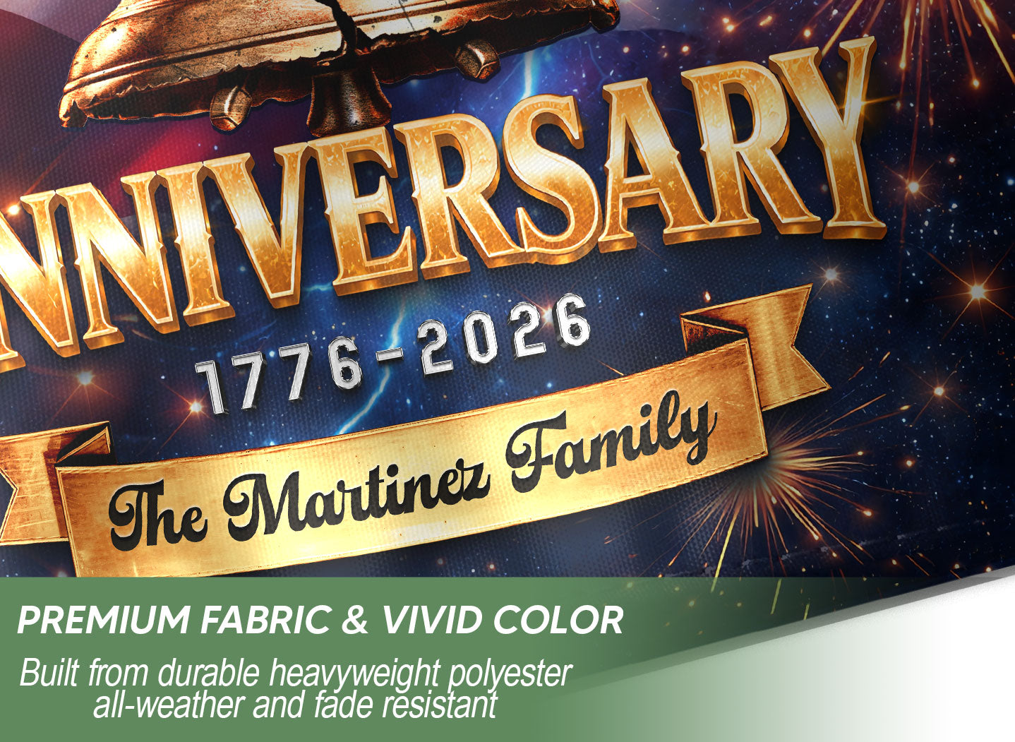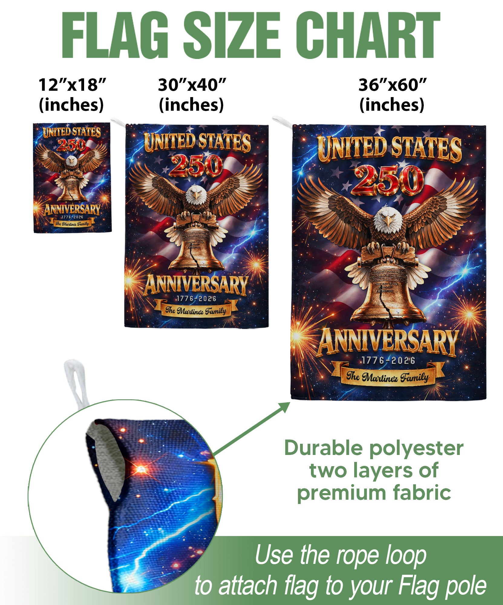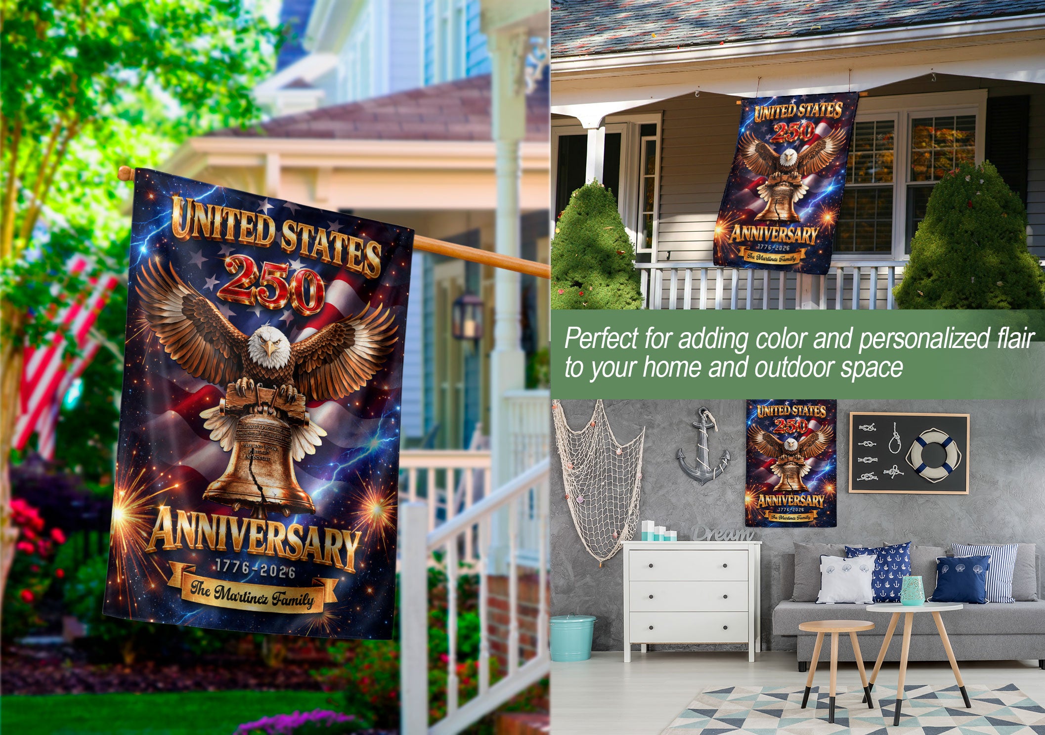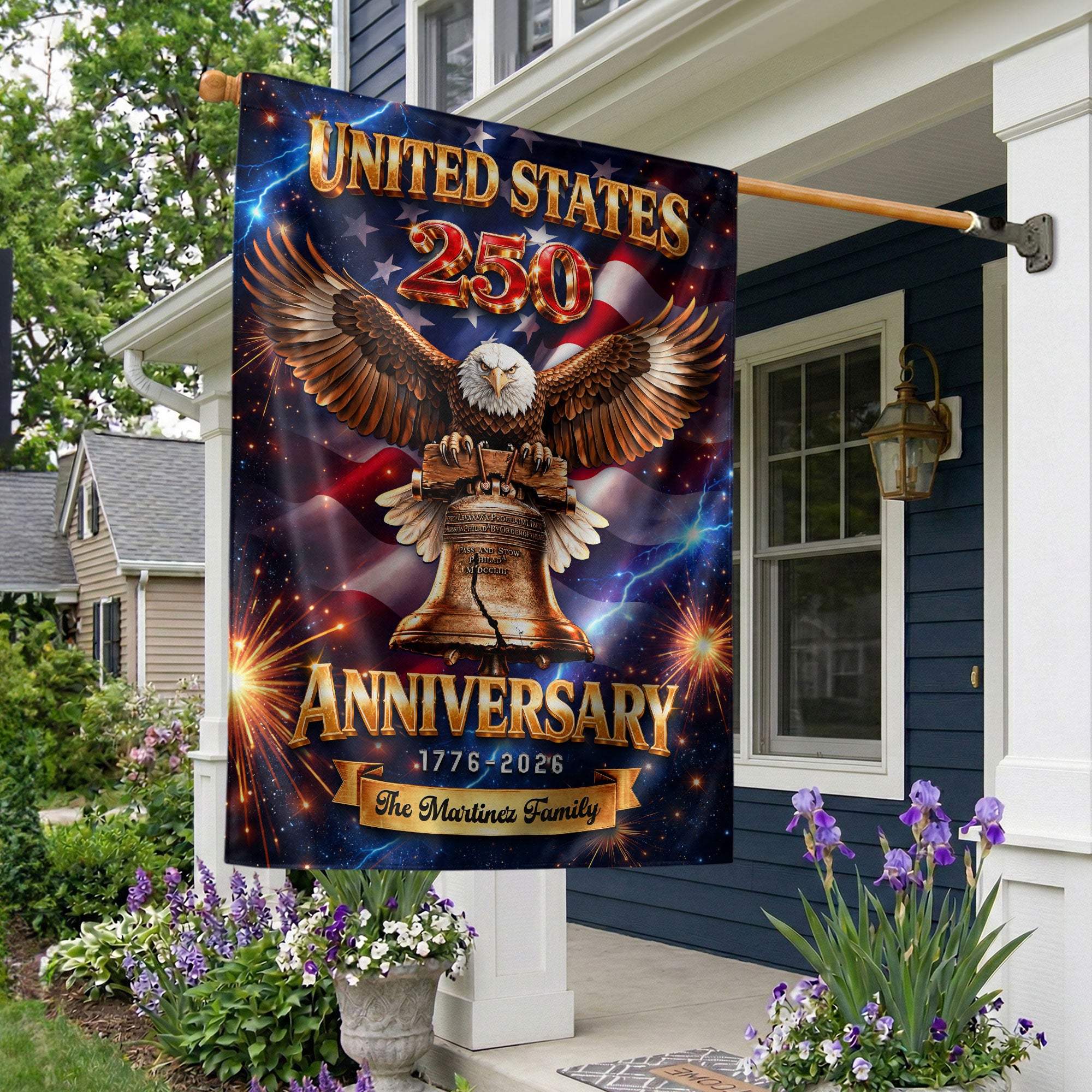Celebrate America’s 250th anniversary from 1776 to 2026 with this personalized garden flag. Customize it with your family name for a unique patriotic display. The design features a majestic eagle, the iconic Liberty Bell, and vibrant fireworks symbolizing freedom and national pride. Made from durable, weather-resistant fabric, this double-sided garden flag measures standard size for easy setup in your yard, garden, or porch. Perfect for Independence Day celebrations, historical commemorations, or as a thoughtful gift for family and friends. Show your American spirit with this high-quality, custom-printed flag that withstands outdoor conditions year-round.