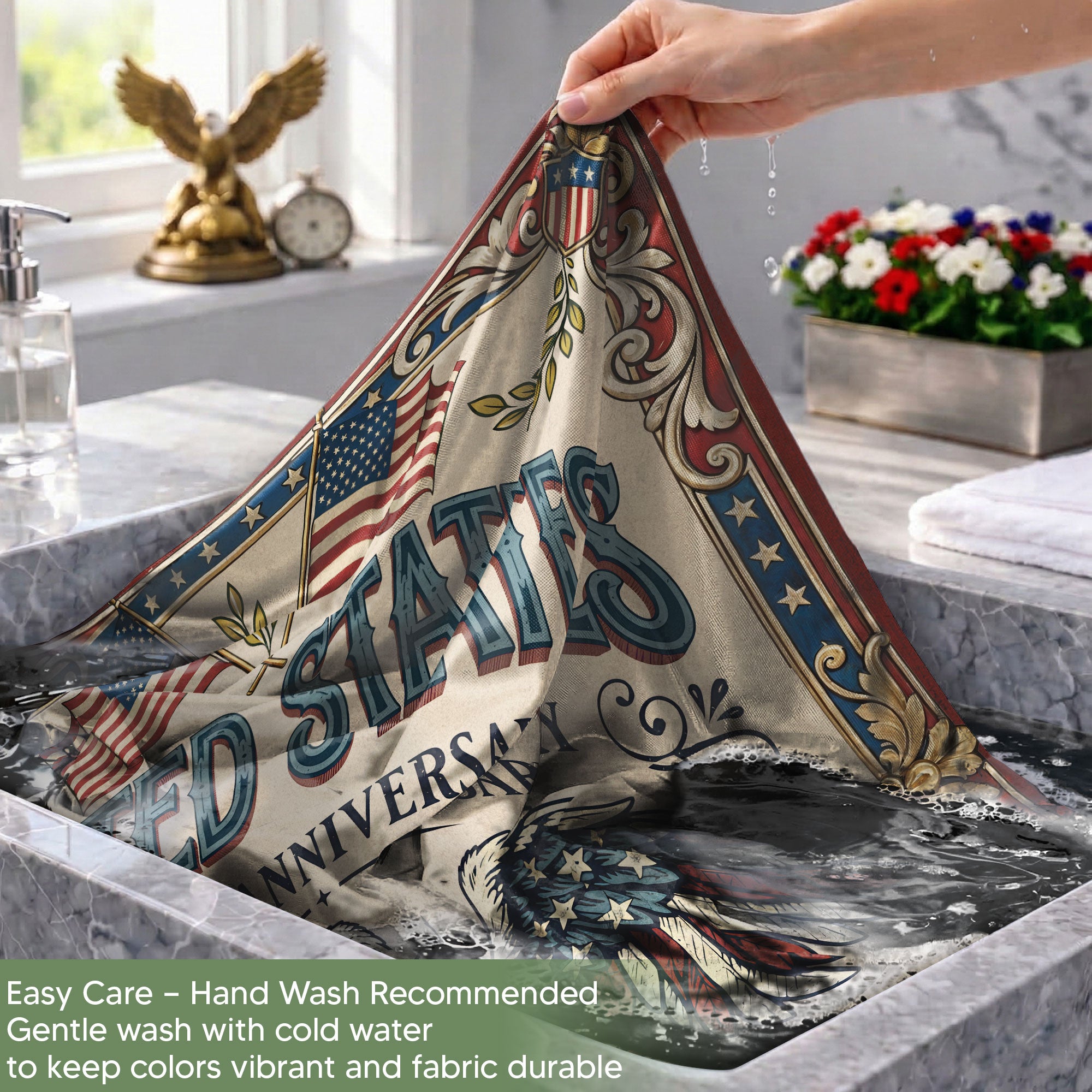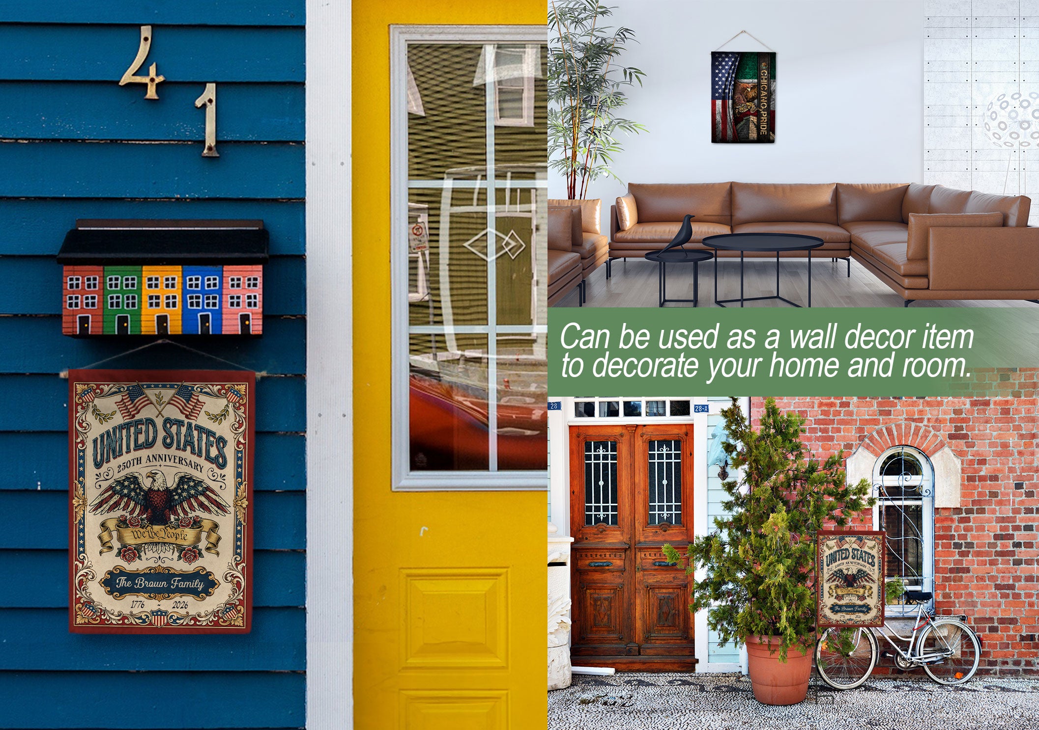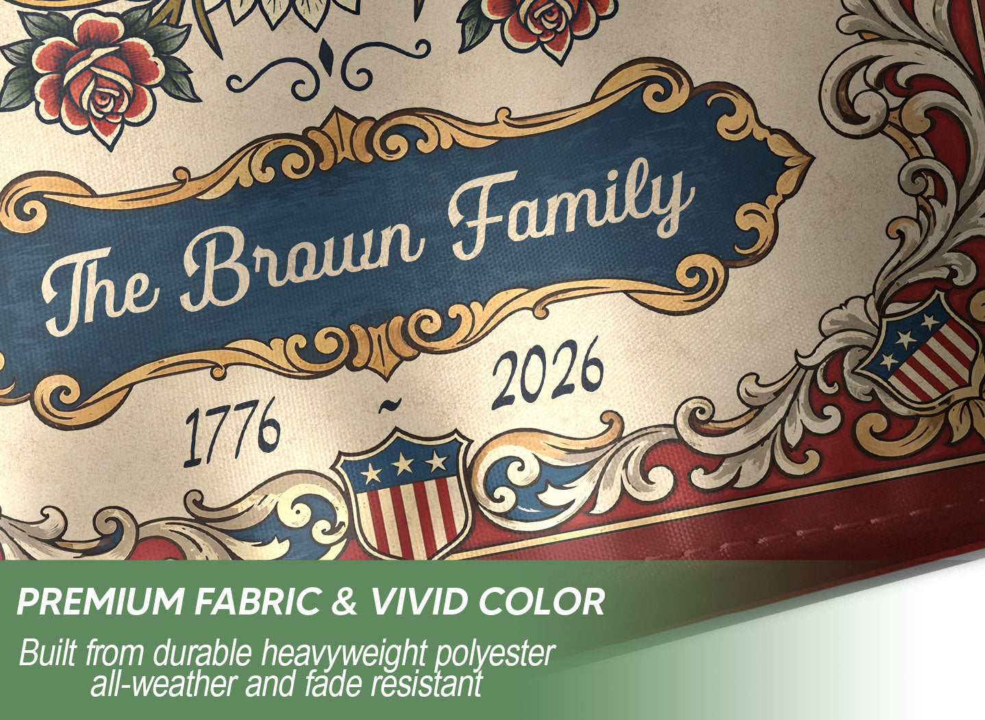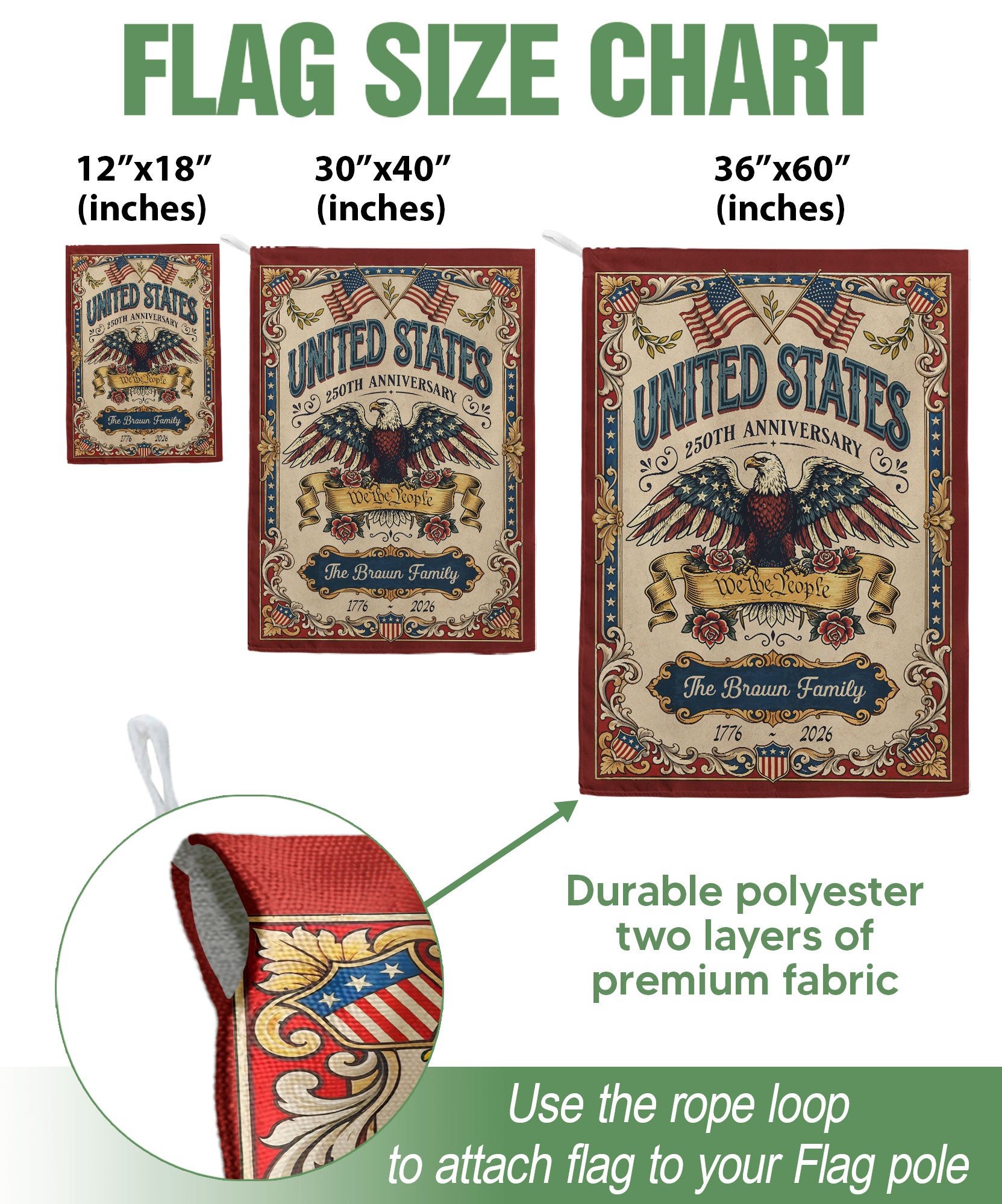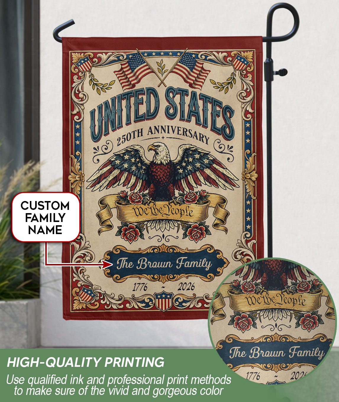 Celebrate America’s 250th anniversary with this personalized garden flag featuring a majestic American eagle, the iconic ‘We the People’ scroll, and vintage American flag elements. Customizable with your family name, it commemorates the journey from 1776 to 2026. Crafted for durability, this garden flag is perfect for displaying in your yard, garden, or patio to honor national pride and history. Ideal as a unique gift for patriots, history enthusiasts, or family gatherings. Easy to hang and weather-resistant for year-round use.