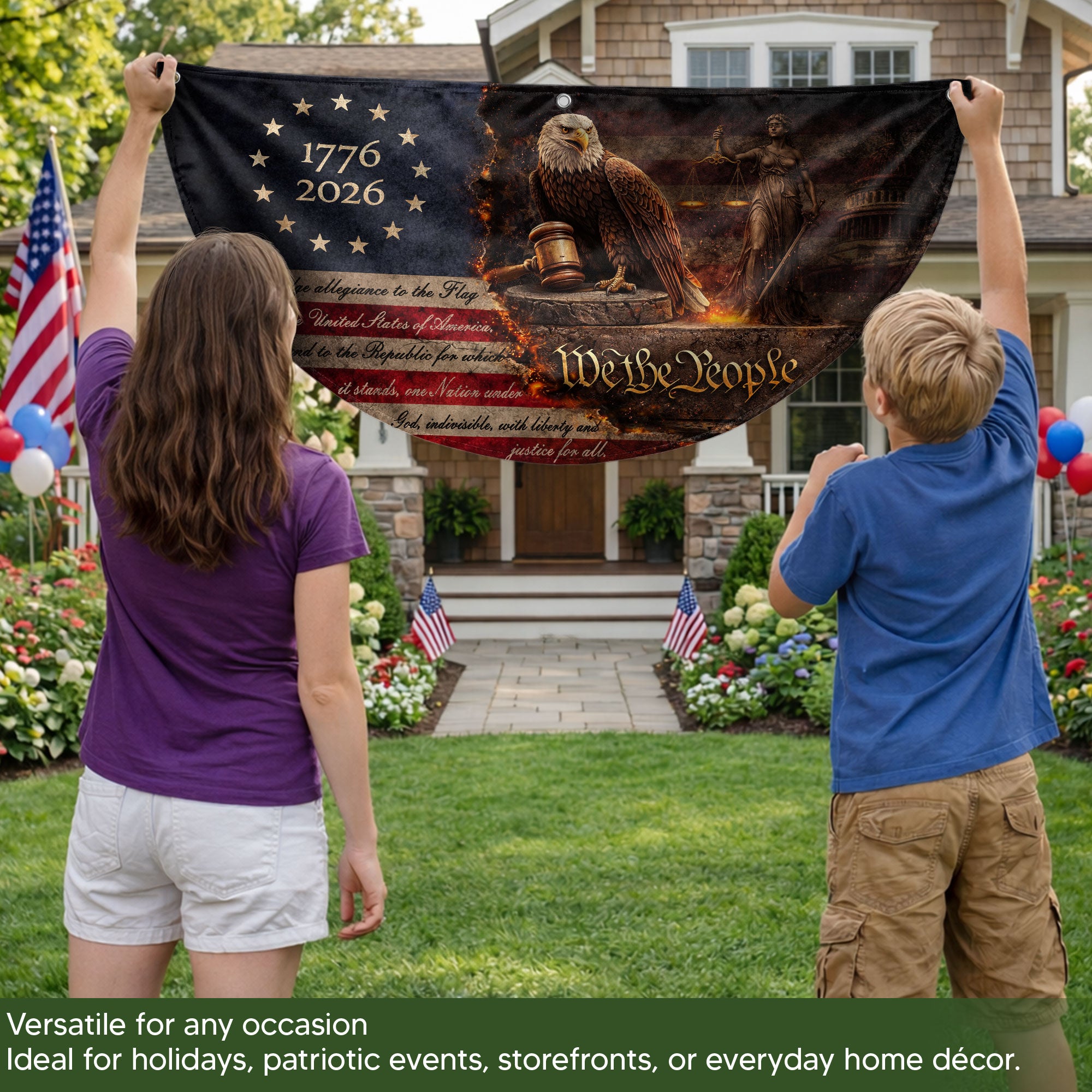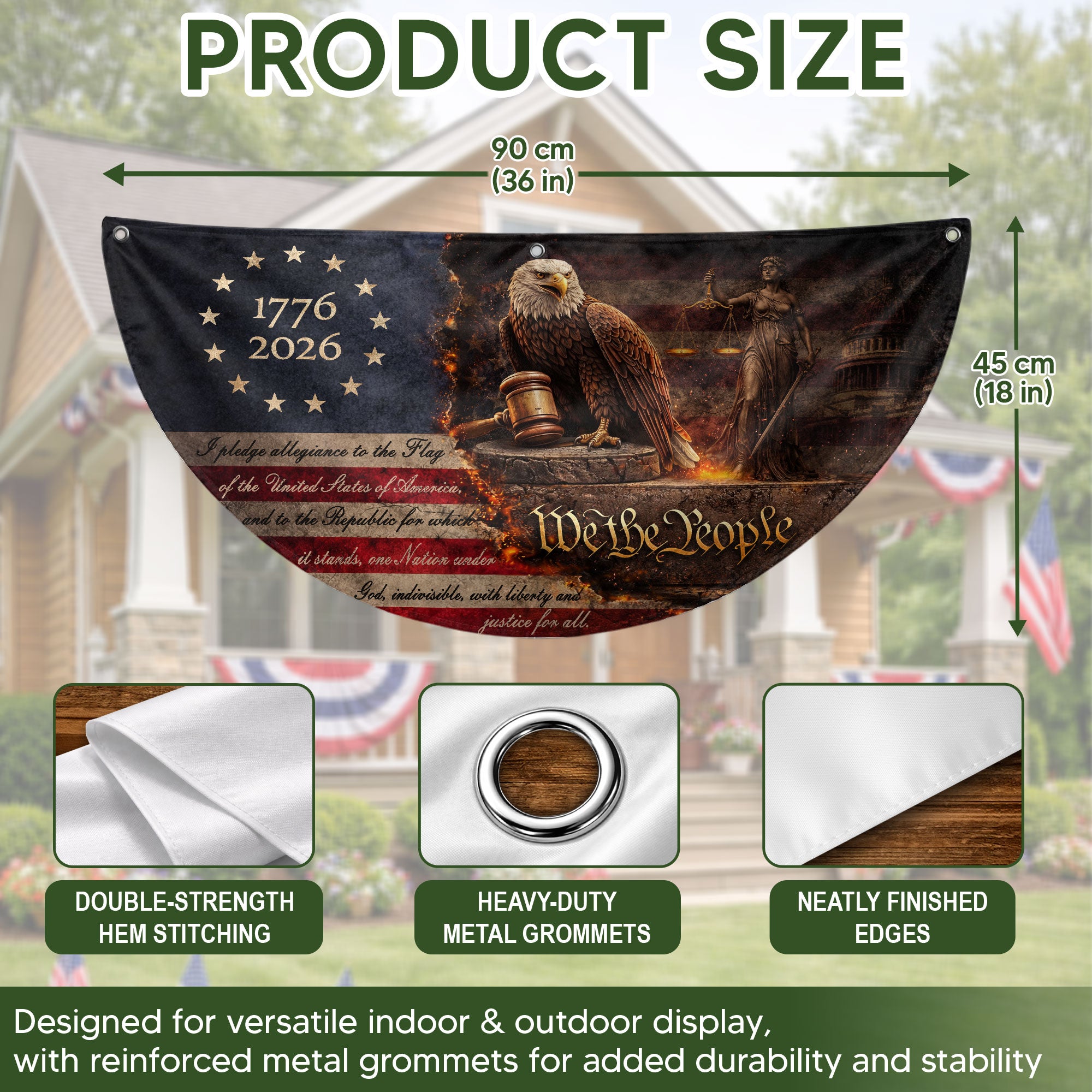 Honor America’s 250th anniversary with this detailed fence flag featuring a majestic bald eagle and Lady Justice. The design prominently displays the full Pledge of Allegiance text, iconic ‘We The People’ script, and 13 stars for the original colonies. Perfect for outdoor decor on fences, porches, or gardens, this patriotic flag celebrates core national values and historical milestones from 1776 to 2026. Durable construction ensures weather resistance for long-lasting display during holidays, events, or everyday pride.