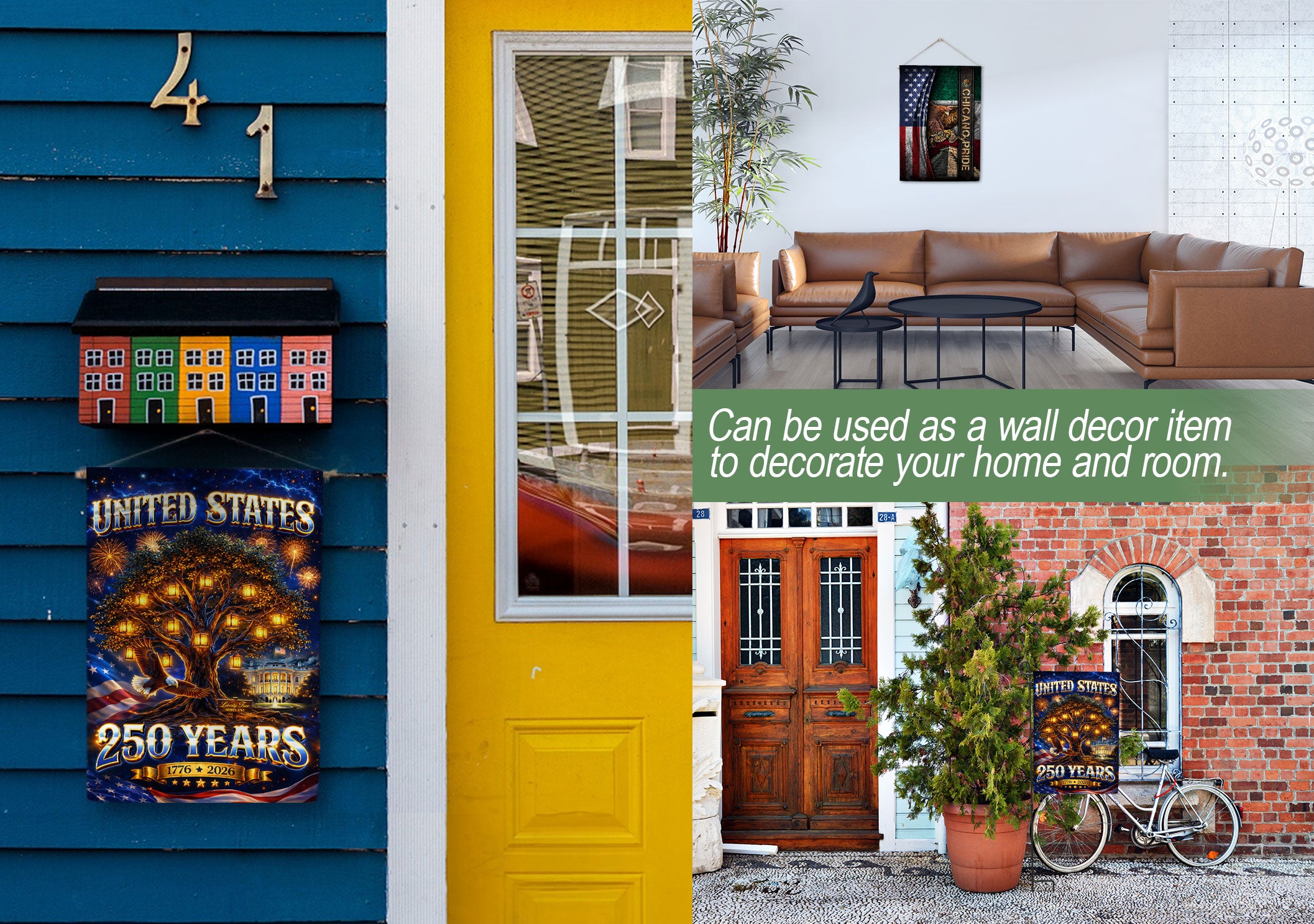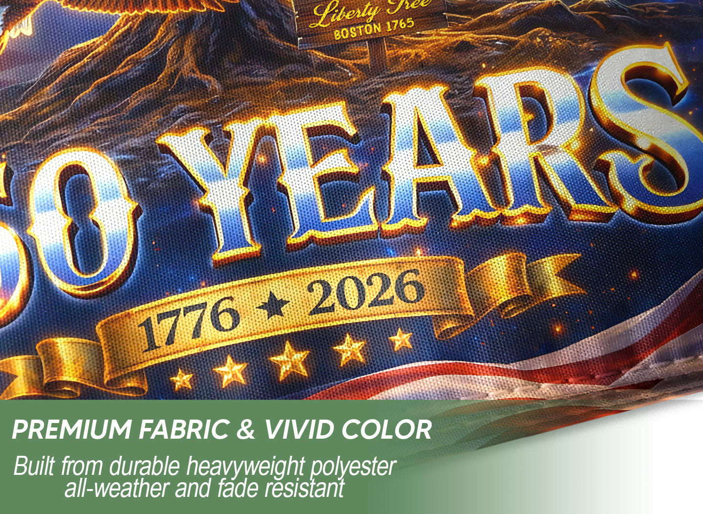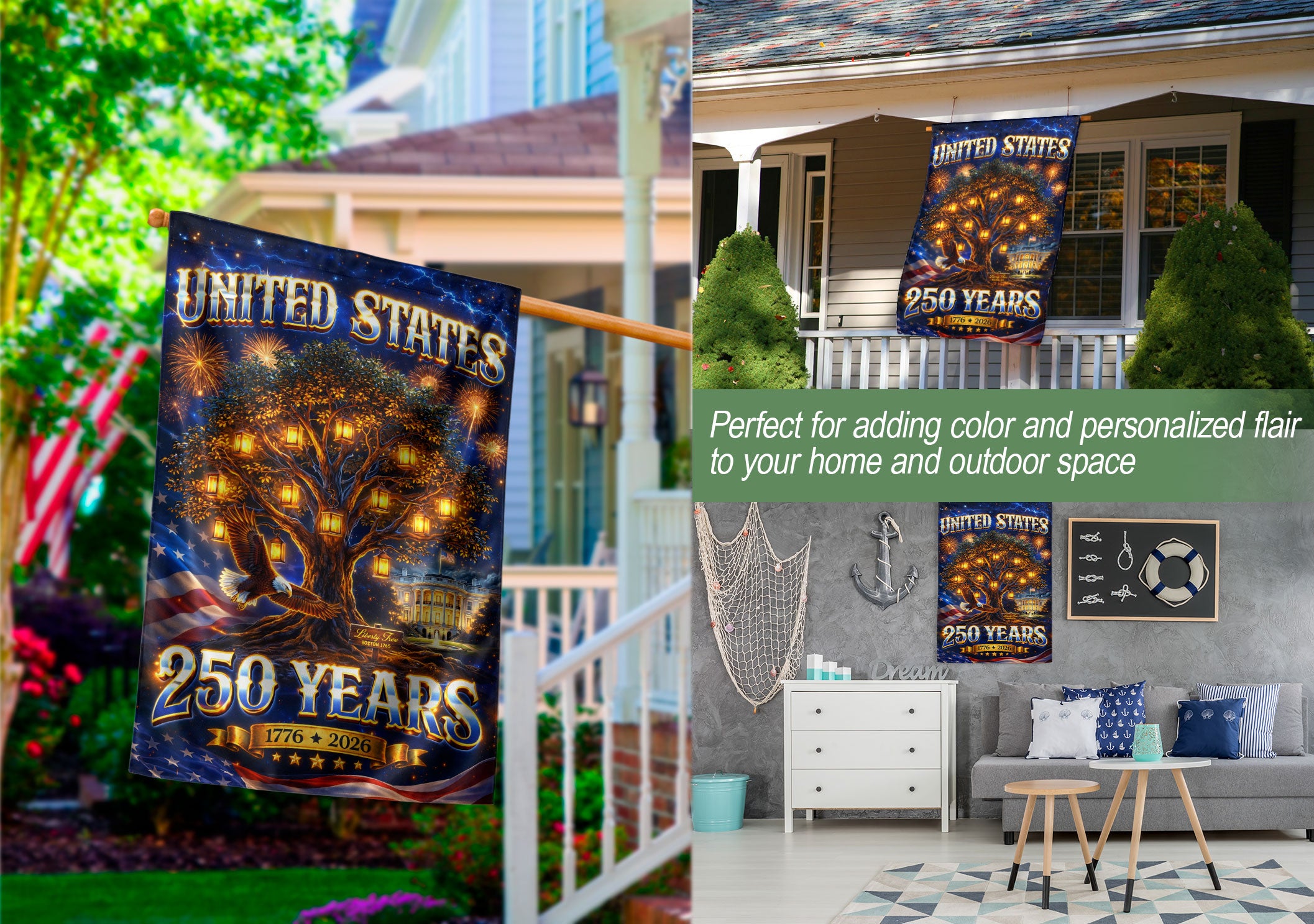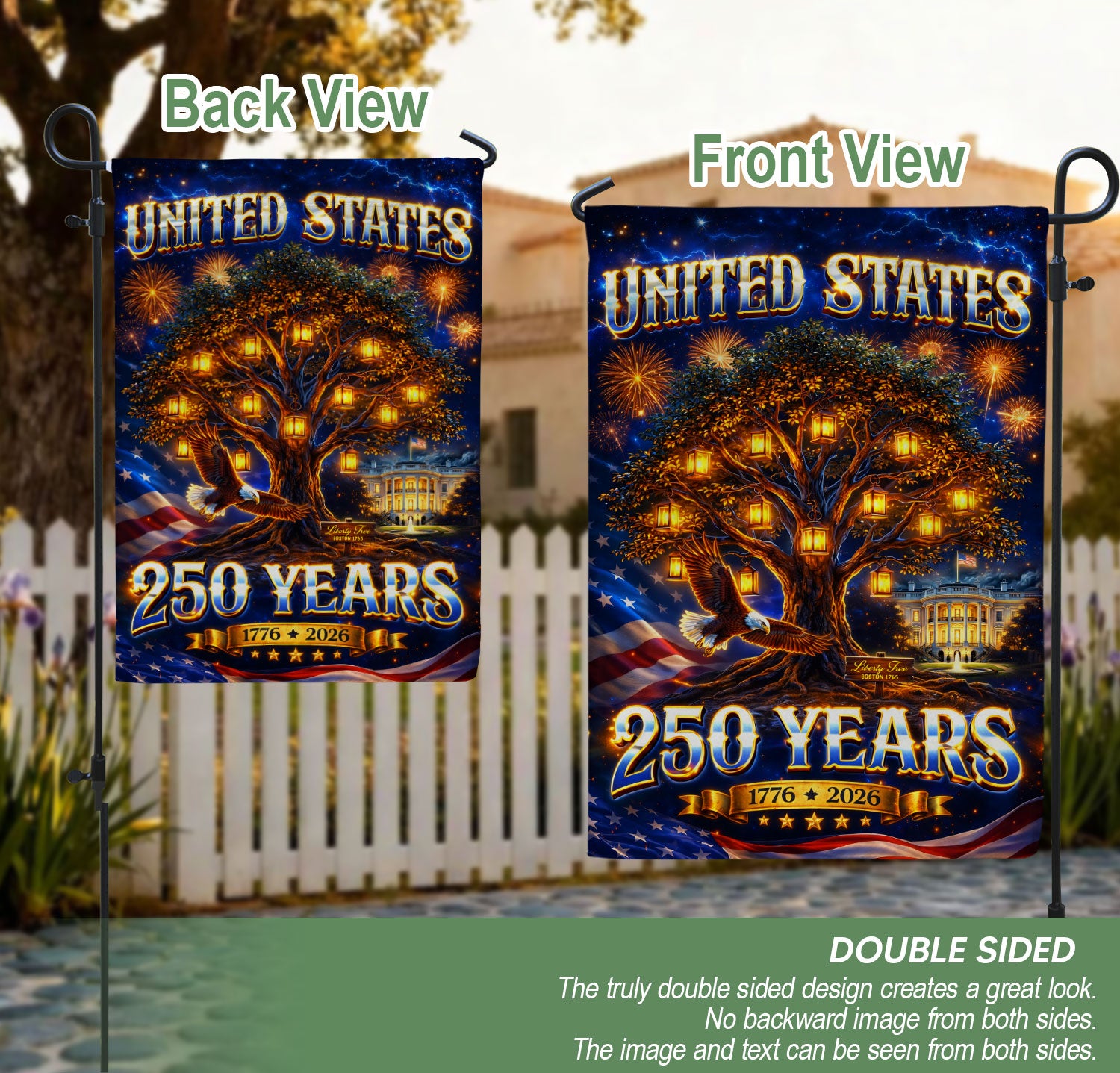 Celebrate America’s 250th anniversary with this striking United States house flag featuring a glowing freedom tree, soaring eagle, and bold patriotic elements from 1776 to 2026. Crafted for durability and vibrant outdoor display, this banner symbolizes strength, unity, liberty, and national heritage. Ideal for porches, gardens, or patios during Independence Day, Memorial Day, Fourth of July, or year-round to showcase your American pride. Double-sided printing ensures visibility from all angles, with reinforced edges for wind resistance. Easy to hang with standard flagpole hardware. Perfect for patriots honoring U.S. history and freedom.