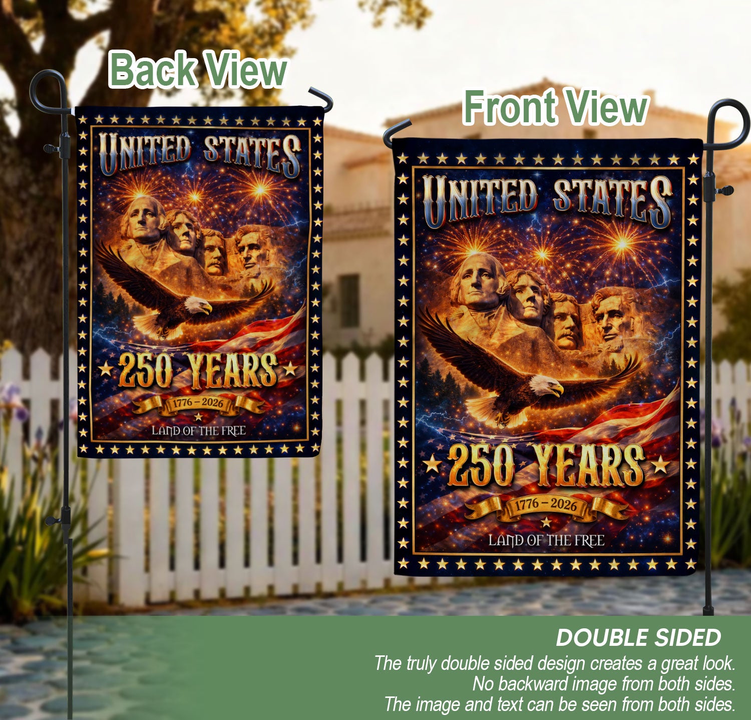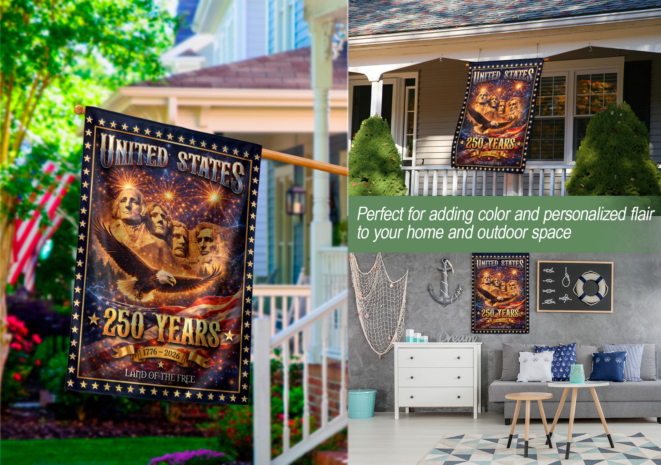 Celebrate 250 years of American independence with this striking United States house flag. Featuring the iconic Mount Rushmore presidents, a majestic soaring eagle, and bold patriotic elements from 1776 to 2026, this banner embodies national pride, strength, and unity. Crafted for durable outdoor display, it’s perfect for porches, patios, or gardens. The vibrant design adds a powerful, meaningful accent to your home decor, honoring U.S. history and freedom. Easy to hang and weather-resistant, ideal for patriots showcasing their love for America during holidays, anniversaries, or everyday.