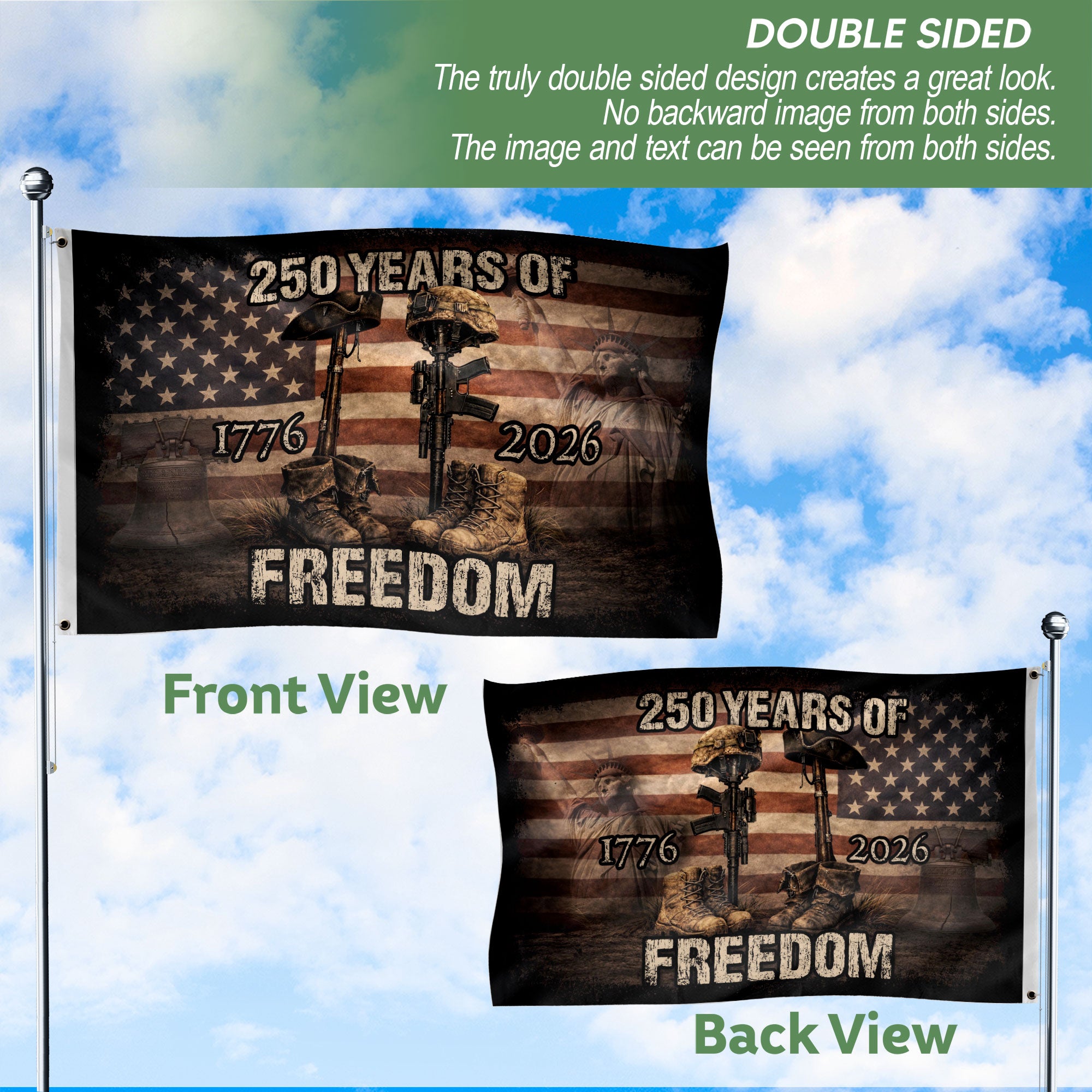 Celebrate America’s 250th anniversary from 1776 to 2026 with this striking United States patriotic flag. The bold design features an iconic eagle emblem symbolizing freedom, strength, and national pride, making it a timeless tribute to American heritage. Crafted from durable, weather-resistant polyester fabric, this banner maintains vibrant colors in all conditions. Ideal for outdoor display on poles, indoor wall decor, or special events like parades, Independence Day celebrations, and historical commemorations. The classic red, white, and blue palette with gold accents embodies unity, tradition, and enduring patriotism. Perfect for veterans, history enthusiasts, and patriots honoring the nation’s journey. Easy to hang with reinforced grommets for secure, versatile installation. Standard flag size ensures broad usability for homes, events, or public displays.