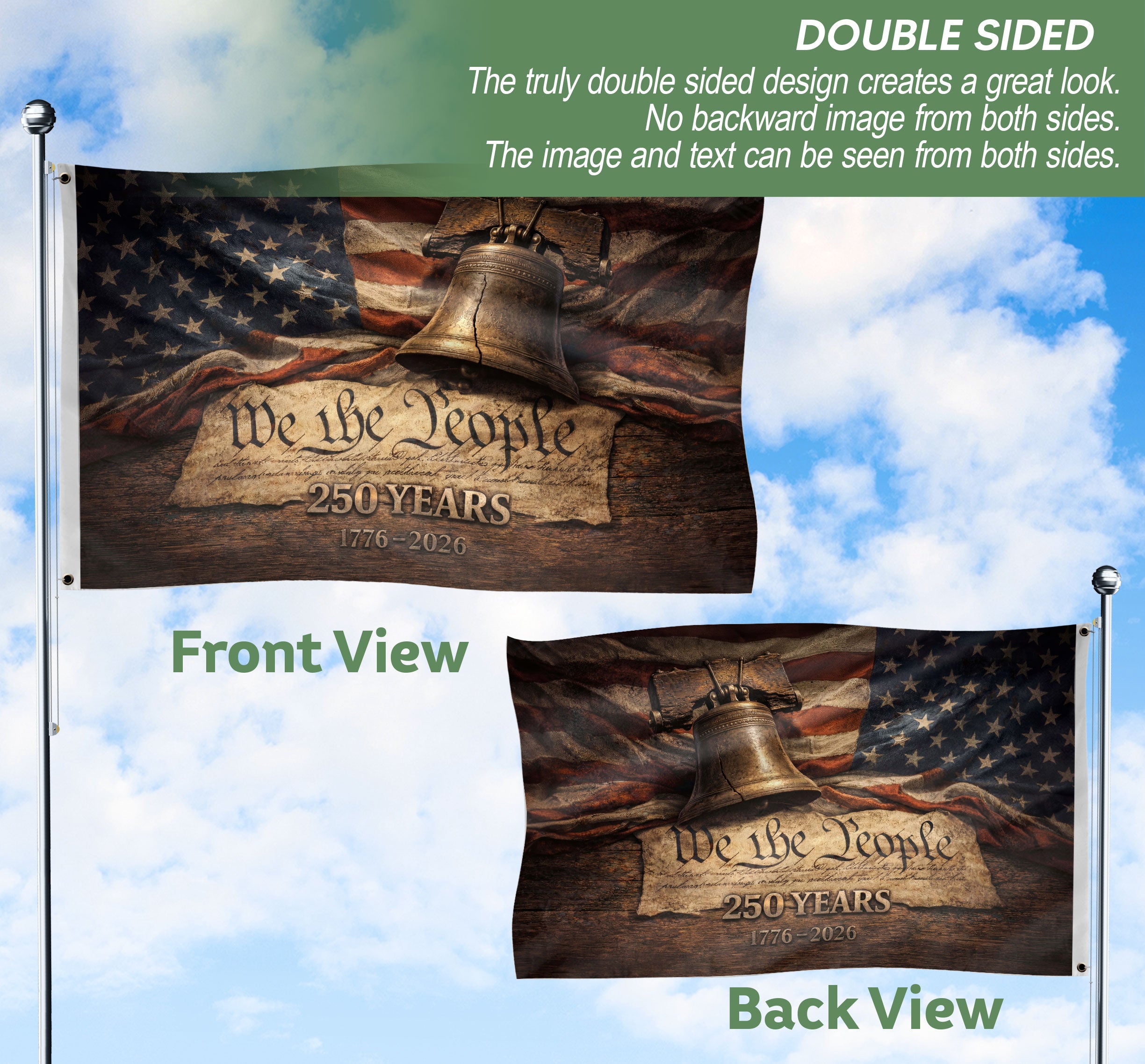United States 250th Anniversary Flag 1776-2026 Vintage Constitution Liberty Bell Double Sided