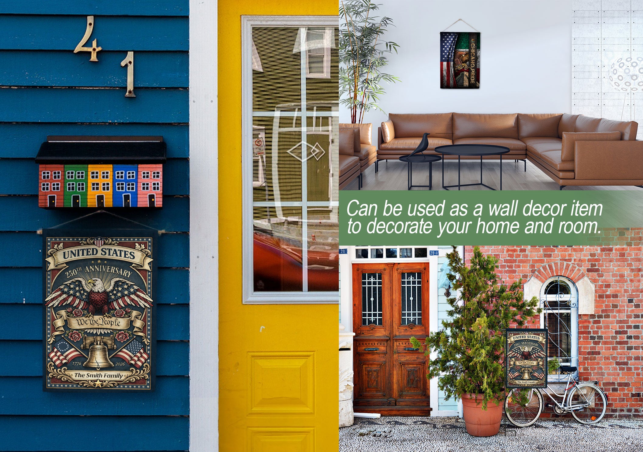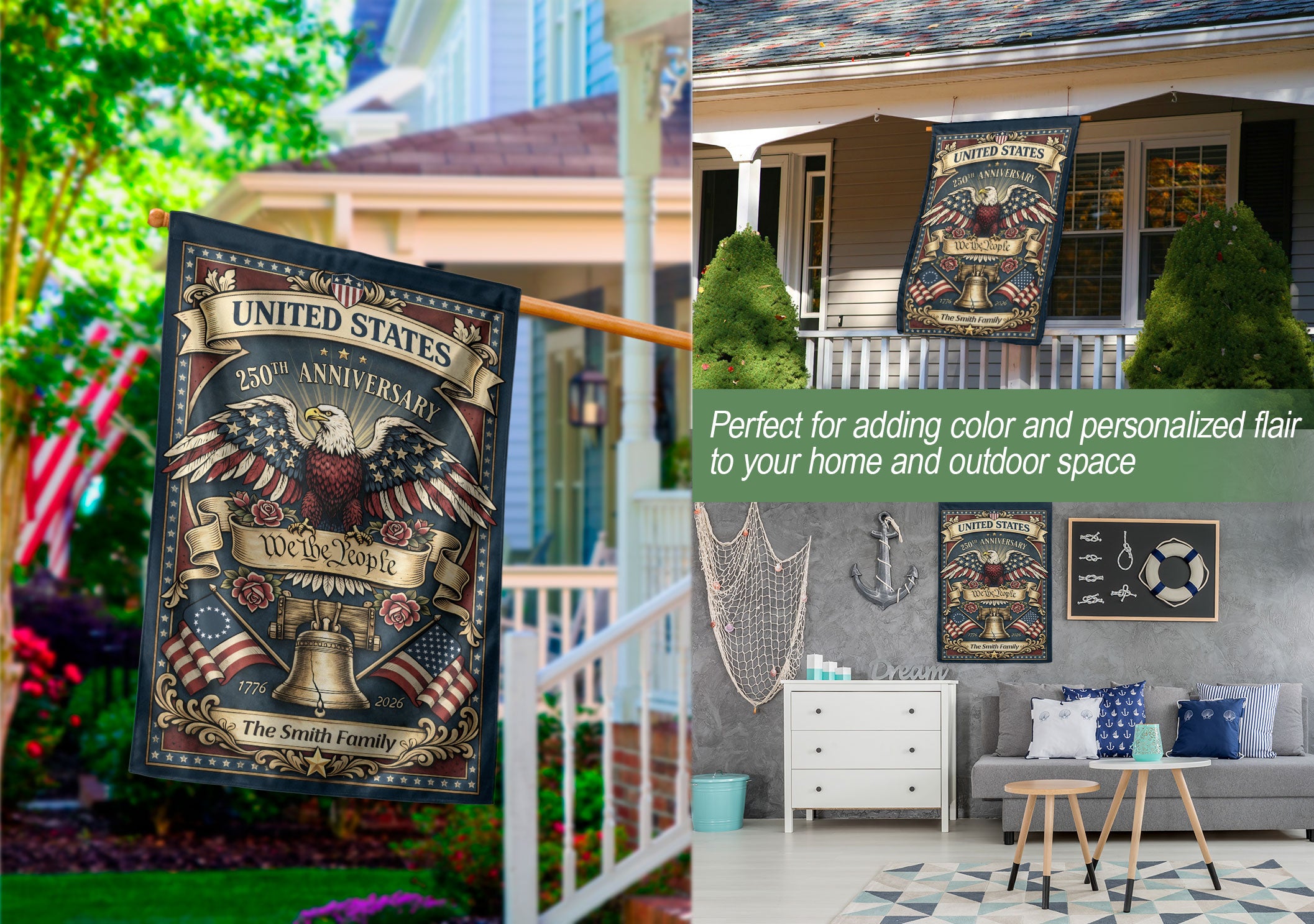 Celebrate America’s 250th anniversary with this custom family name garden flag. The design features a majestic eagle, iconic Liberty Bell, ‘We the People’ text, and American flags, spanning from 1776 to 2026. Perfect for patriotic garden displays, porches, or yards to honor the nation’s founding legacy. Personalize with your family name for a unique touch. Durable outdoor fabric withstands weather, easy to hang with sleeve or grommets. Ideal for Independence Day, historical commemorations, or as a thoughtful personalized gift for family and friends who love American history.