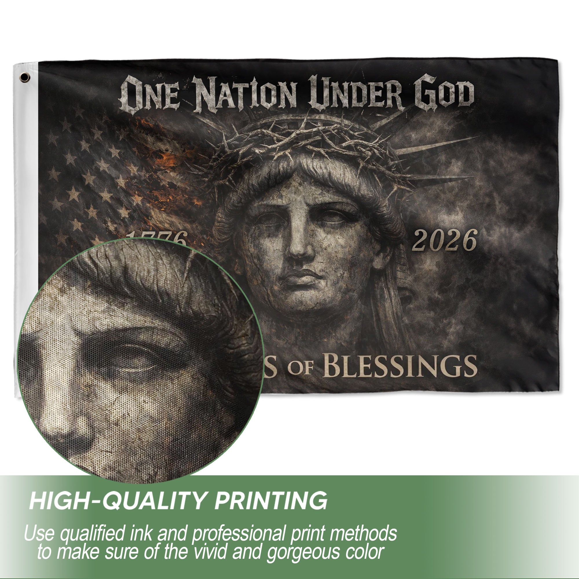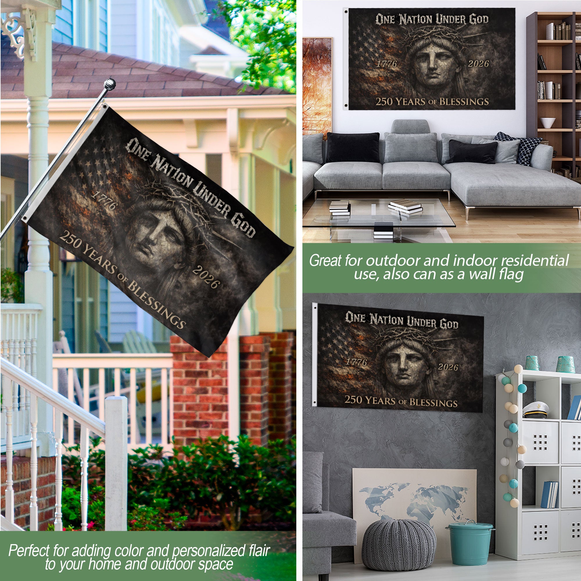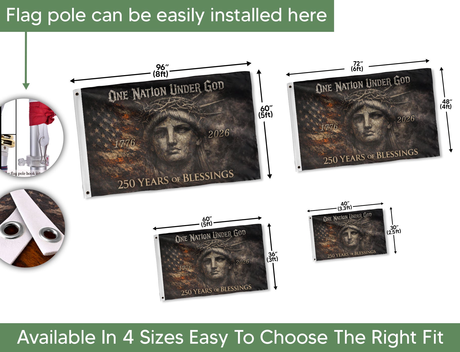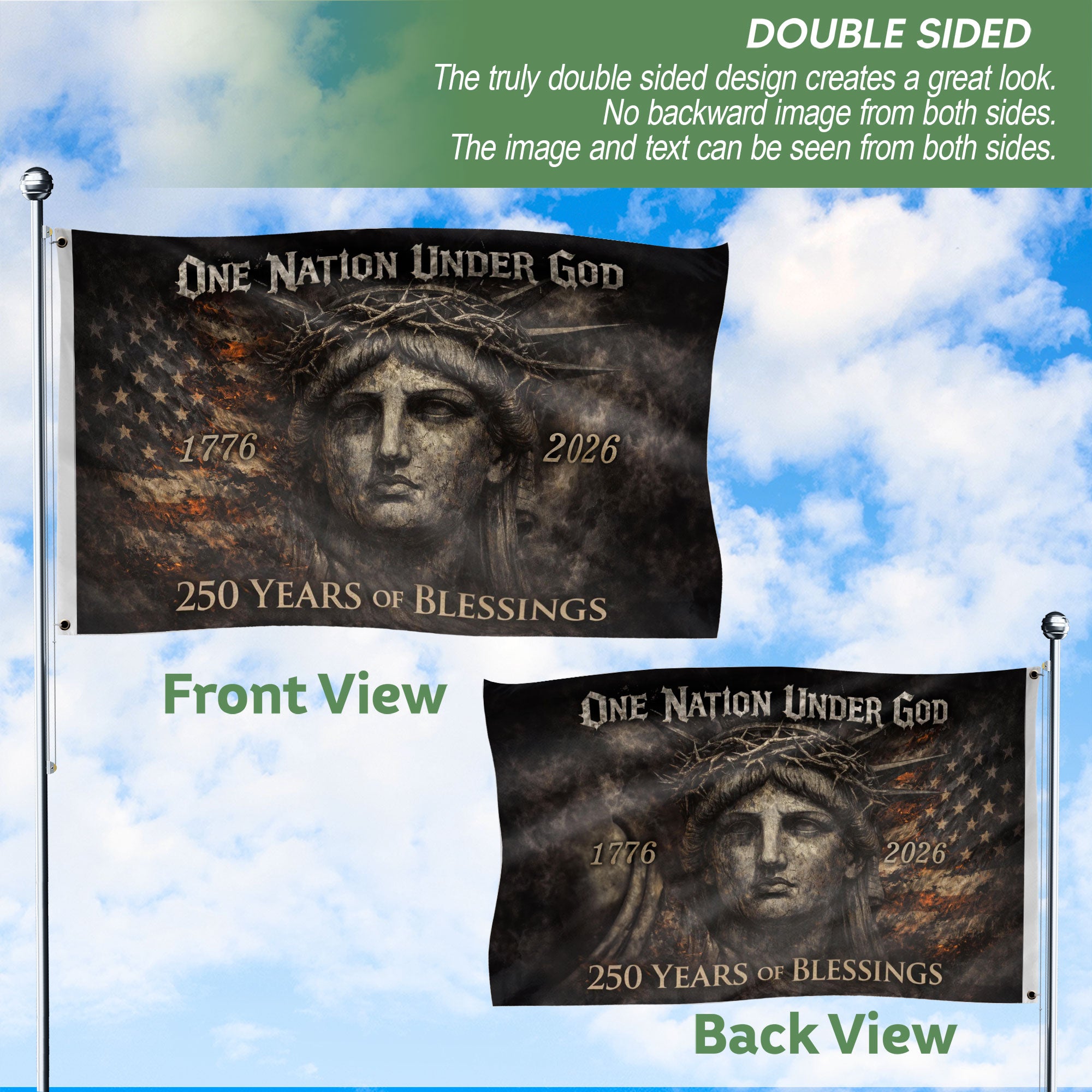 Celebrate America’s 250th anniversary from 1776 to 2026 with this double-sided patriotic flag banner. The striking design features a tactical Lady Liberty skull with a crown of thorns and the bold ‘One Nation Under God’ motto, symbolizing 250 years of independence, sacrifice, faith, and freedom. Crafted from durable, weather-resistant polyester fabric with reinforced edges and brass grommets for easy hanging, this flag ensures long-lasting display in various conditions. The high-quality double-sided print provides vivid colors and clear visibility from both sides, making it perfect for homes, porches, garages, events, rallies, parades, or outdoor spaces. Ideal for veterans, history buffs, patriots, and anyone proud of America’s heritage of strength, liberty, and divine providence. Express your unwavering support for the nation’s journey with this powerful symbol of gratitude and conviction.