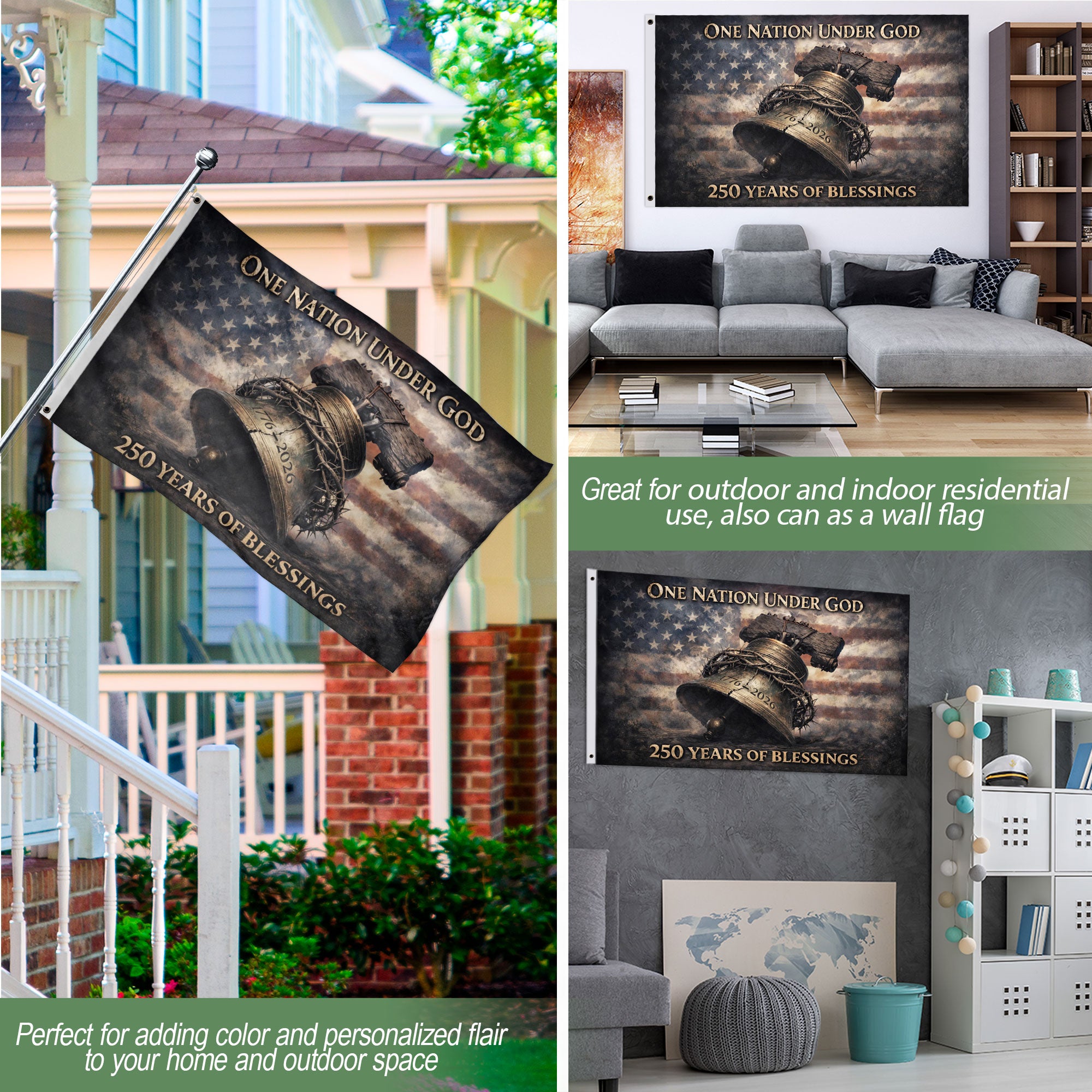 Celebrate America’s 250th anniversary from 1776 to 2026 with this double-sided patriotic flag banner. It features striking imagery of the Liberty Bell, Crown of Thorns, and the iconic phrase ‘One Nation Under God,’ symbolizing faith, unity, freedom, and national pride. Crafted from durable, weather-resistant polyester fabric, the double-sided print ensures vibrant colors and clear details visible from both sides. Perfect for home display, parades, outdoor events, Fourth of July celebrations, or patriotic gatherings. Measuring approximately 3×5 feet, this banner includes reinforced grommets for easy hanging on poles, porches, or fences. Ideal for patriots honoring American heritage and spiritual values during this historic milestone. Show your steadfast belief and commemorate generations of blessings with this timeless USA flag.