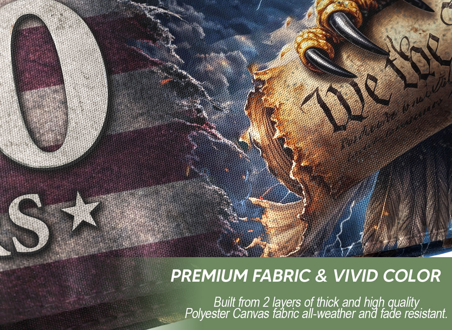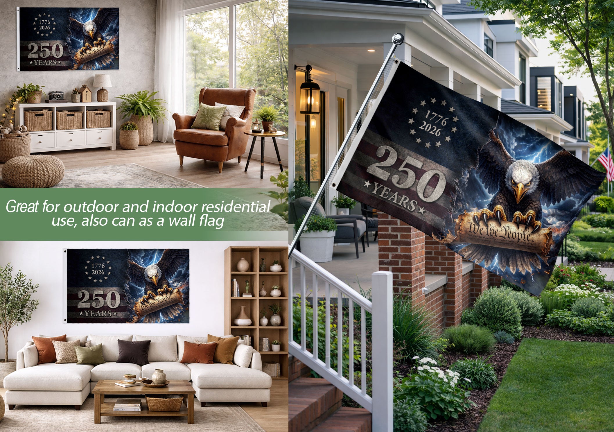 Celebrate the United States’ 250th anniversary from 1776 to 2026 with this premium double-sided house flag. The striking vintage bootleg eagle design features dramatic lightning accents and the iconic ‘We The People’ slogan, embodying the fierce spirit and resilience of America over two and a half centuries. Crafted for outdoor durability, this flag withstands wind, rain, and sun, making it ideal for porches, garages, gardens, or patios. Perfect for history buffs, veterans, patriots, and anyone honoring the semiquincentennial with bold, dynamic style. High-quality polyester construction ensures vibrant colors on both sides that won’t fade, allowing you to proudly display your American pride year-round.