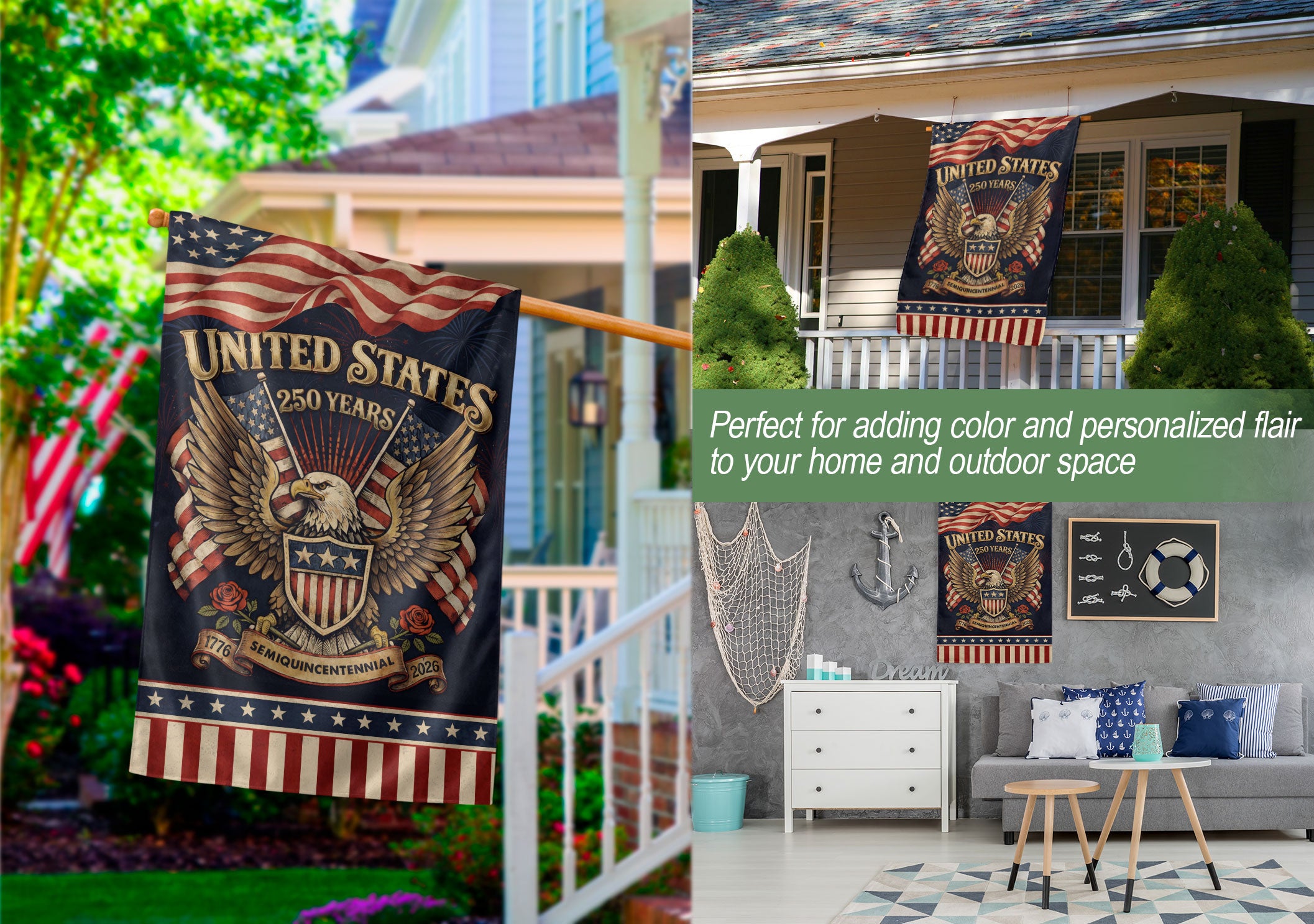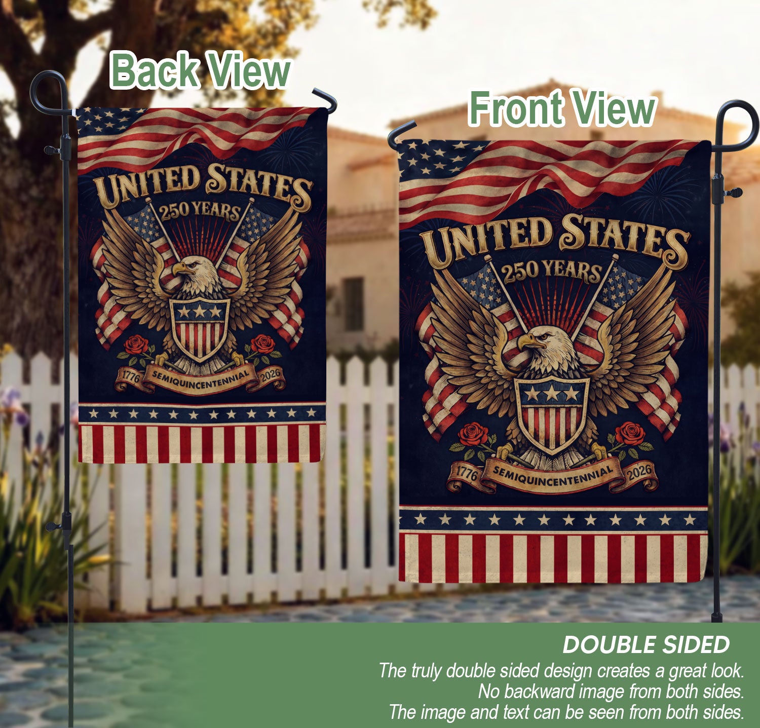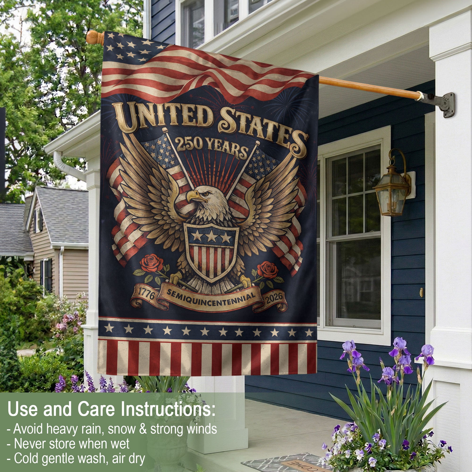 Celebrate America’s 250th anniversary from 1776 to 2026 with this striking double-sided house flag featuring a powerful patriotic eagle and classic roses. Symbolizing courage, sacrifice, and national heritage, this yard decor captures the timeless beauty of the nation’s journey. Perfect for outdoor display on porches, gardens, or patios, it withstands weather elements while proudly showcasing your patriotic spirit. Crafted with high-quality, durable fabric for vibrant colors and clear visibility from both sides. Ideal for Independence Day, Memorial Day, Fourth of July, or everyday display to honor American history and pride.