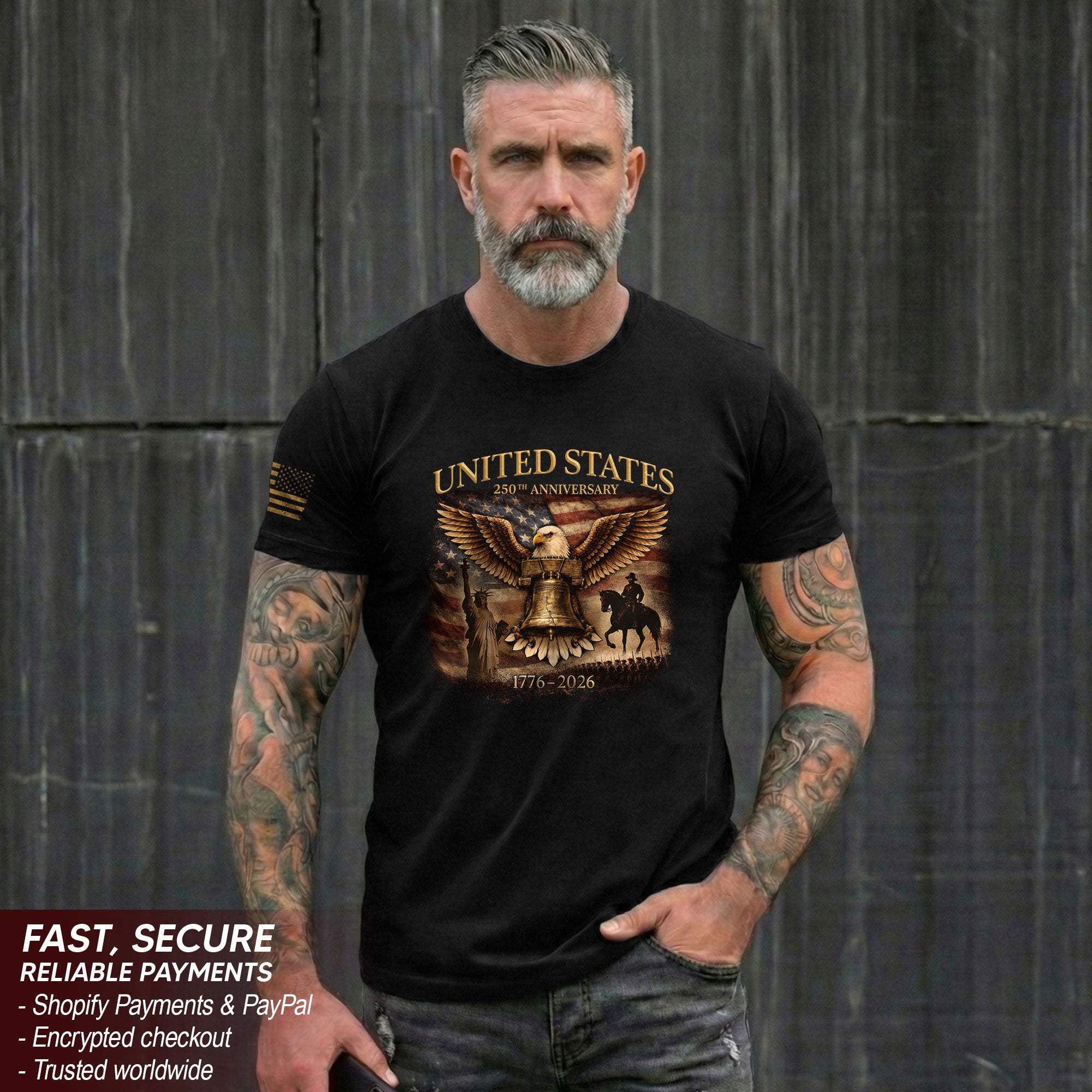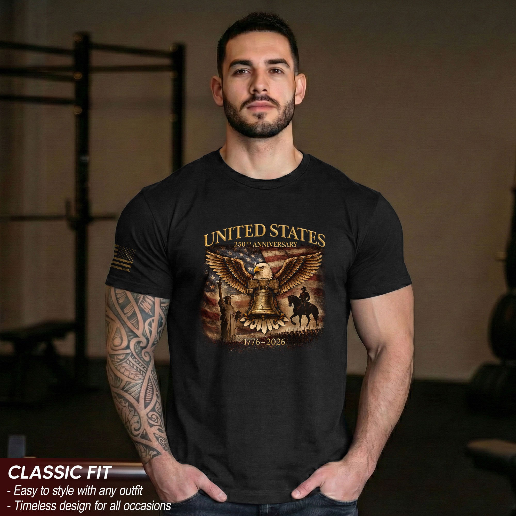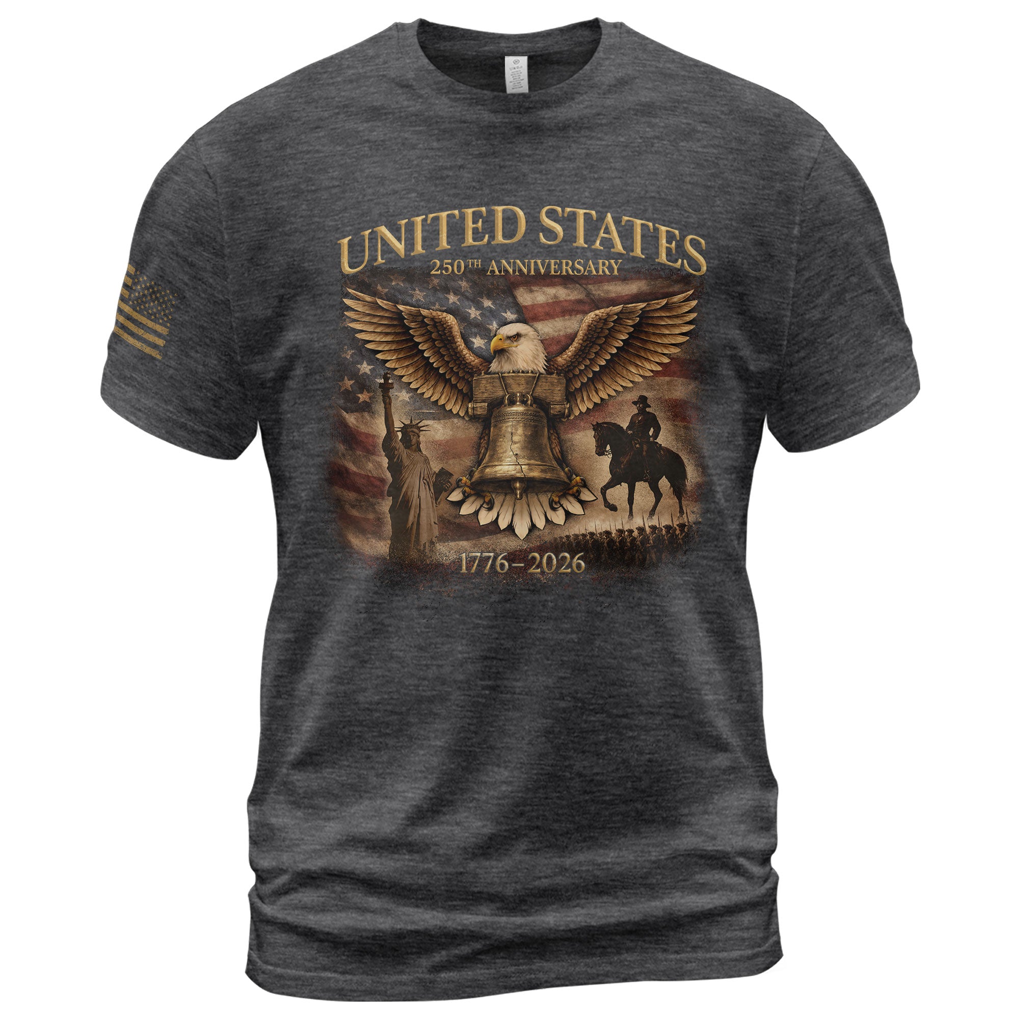 Historic voice. Fearless strength.Liberty Bell paired with a powerful eagle symbolizes the birth of freedom and the enduring strength of the nation. A bold patriotic shirt made to commemorate America’s 250-year legacy.