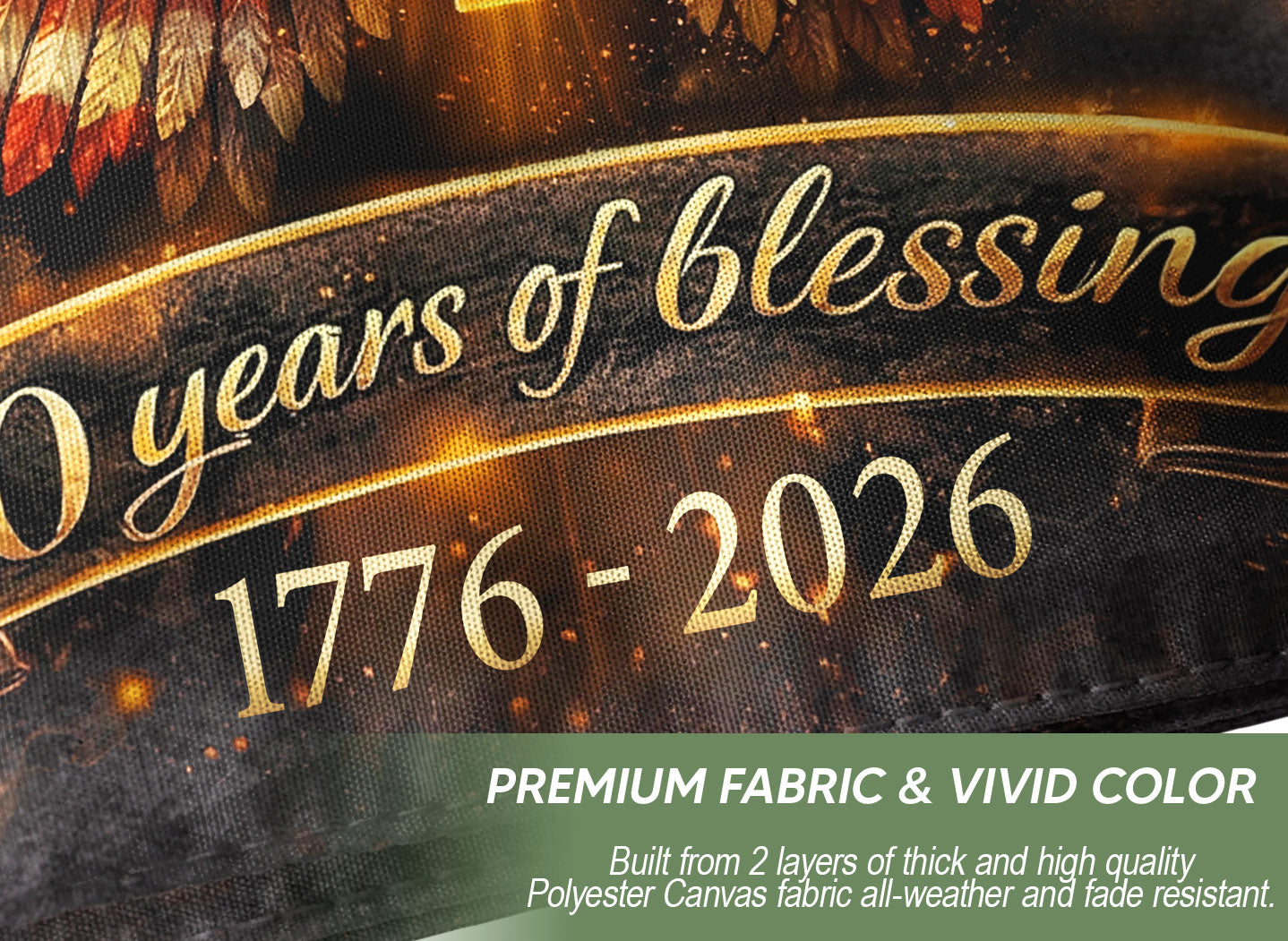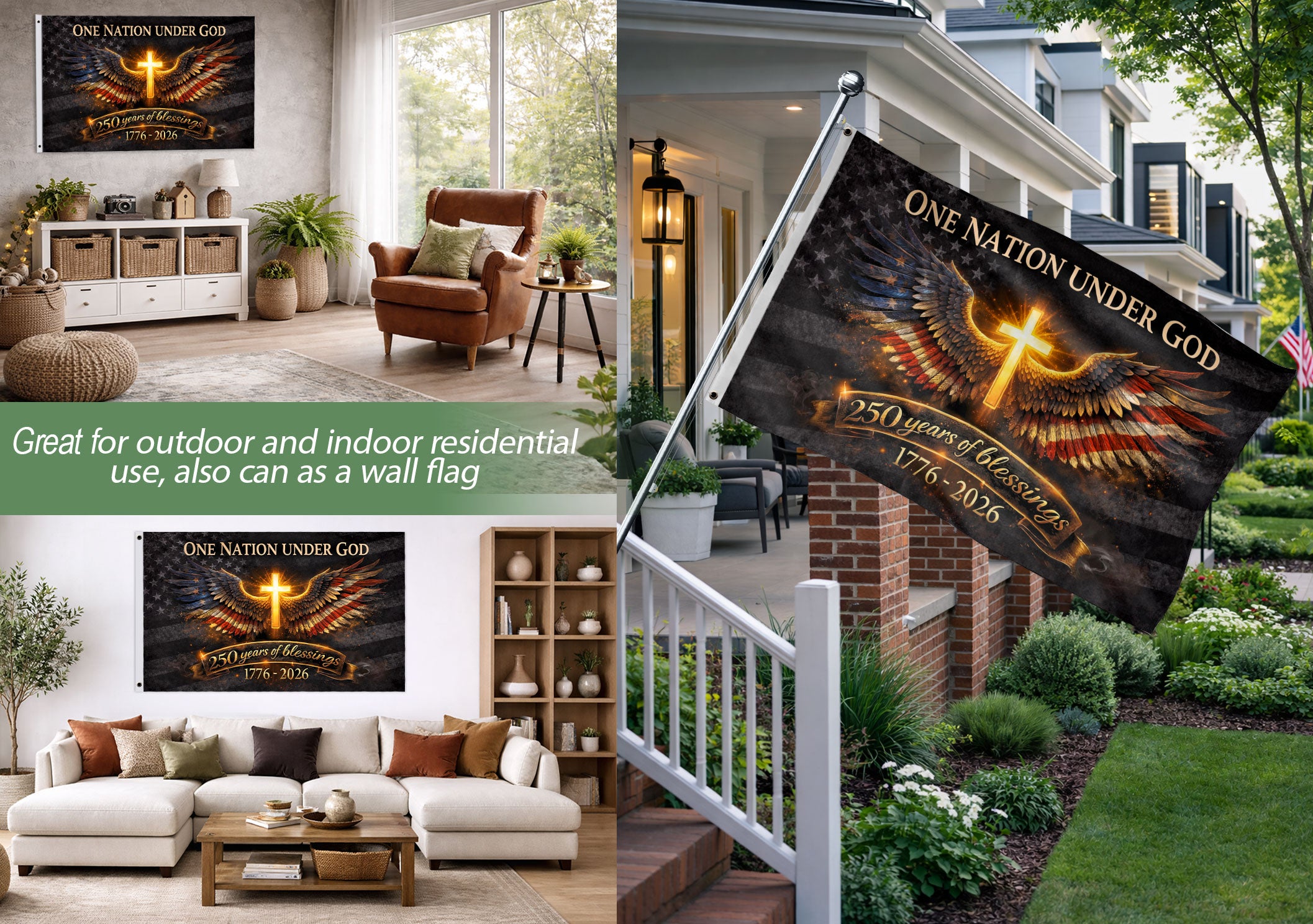 Celebrate America’s 250th anniversary from 1776 to 2026 with this striking double-sided Christian banner featuring a glowing cross and majestic angel wings. This high-quality flag honors the profound connection between American history, Christian faith, and the spirit of freedom that defines our nation. Perfect for display at home, church services, patriotic events, outdoor gatherings, or historical commemorations, it serves as a powerful symbol of hope, devotion, and spiritual heritage.