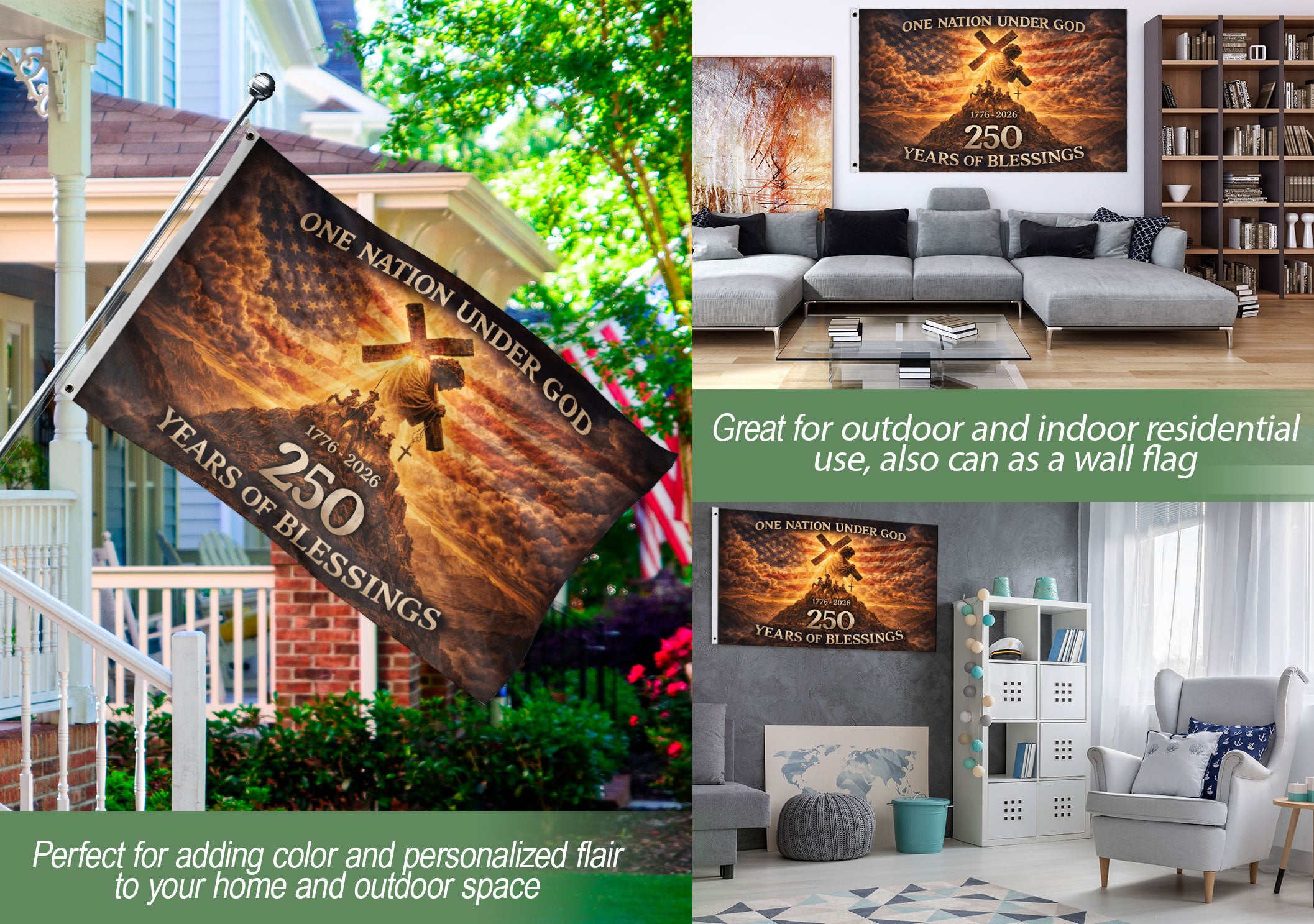 Celebrate America’s 250th anniversary from 1776 to 2026 with this durable double-sided house flag. Featuring Jesus alongside patriotic soldiers and the bold message ‘One Nation Under God,’ it honors faith, sacrifice, and the enduring story of freedom. Perfect for displaying national unity, courage, and devotion on porches, patios, yards, or gardens. Crafted for long-lasting vibrancy with vivid printing visible from both sides, it includes a standard flagpole sleeve for easy hanging. Ideal for veterans, Christians, patriots, and anyone proud of American history and values.