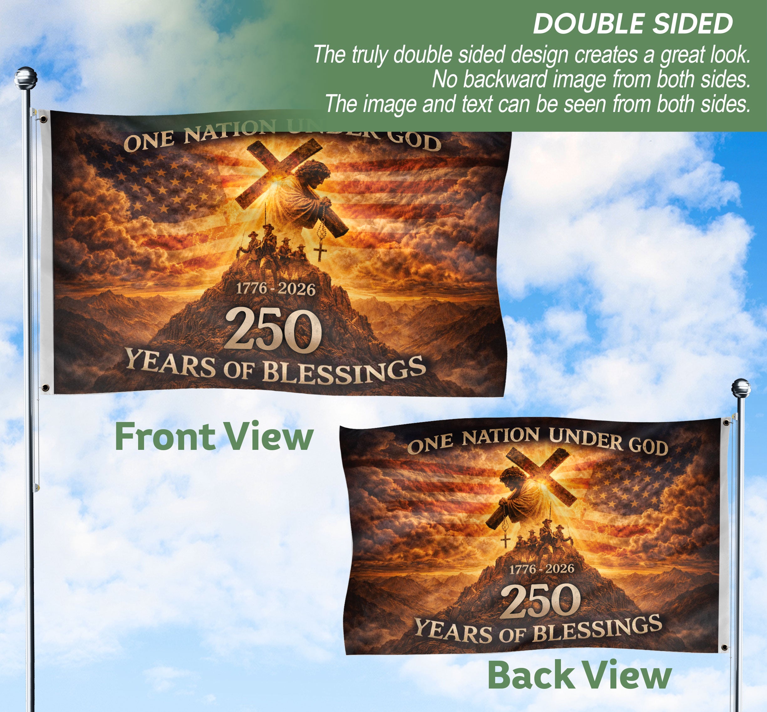 USA 250th Anniversary Double Sided House Flag 1776-2026 One Nation Under God Jesus Soldiers