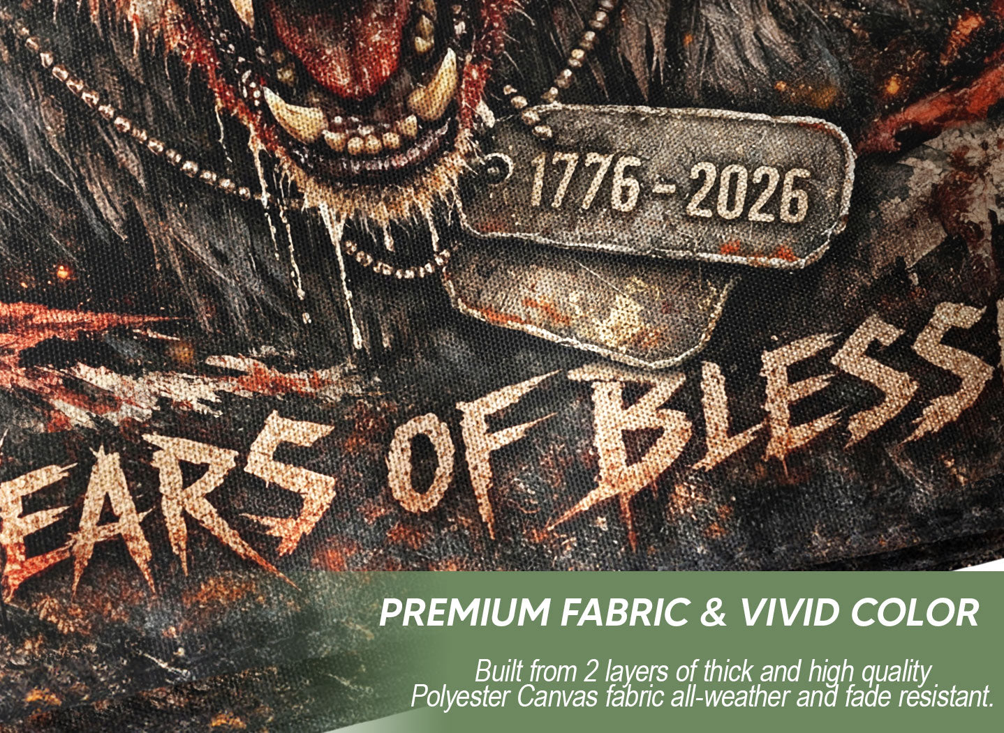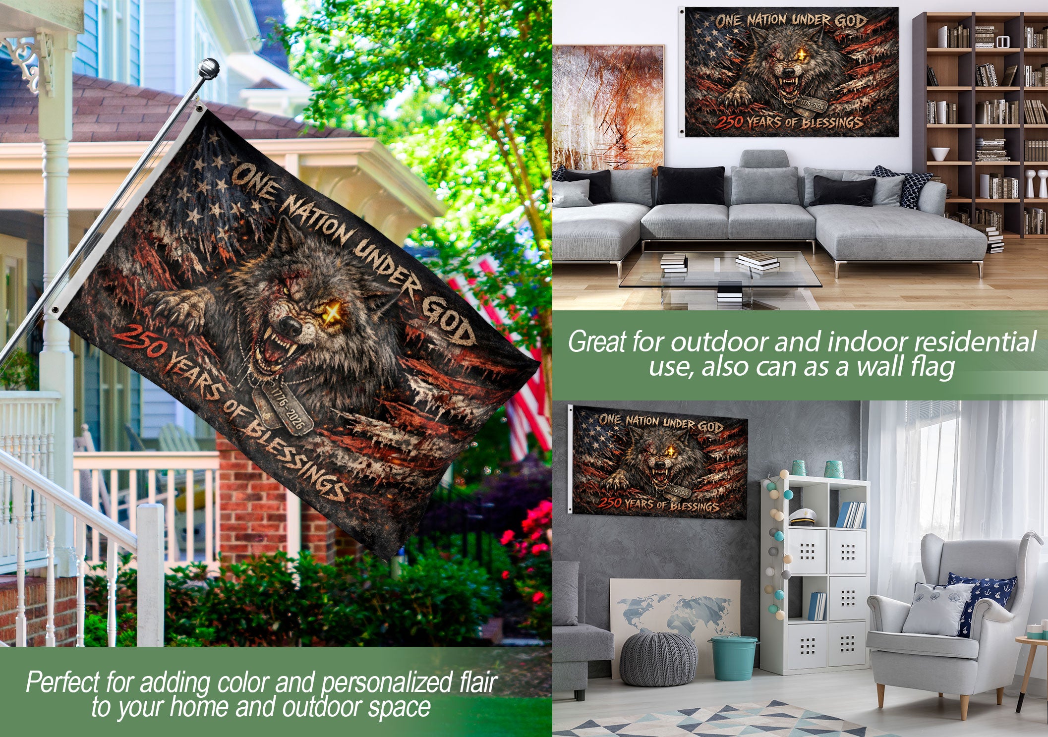 Celebrate America’s 250th anniversary from 1776 to 2026 with this double-sided patriotic wolf flag banner. Featuring a striking wolf design symbolizing strength and guardianship, along with the iconic ‘One Nation Under God’ motto, this high-quality flag honors 250 years of independence, faith, freedom, and national pride. Crafted from durable, weather-resistant polyester fabric with reinforced edges and brass grommets for easy hanging, it withstands outdoor conditions like wind, rain, and sun exposure. The vibrant, fade-resistant graphics are printed on both sides for maximum visibility from any angle, making it perfect for homes, porches, garages, parades, events, Fourth of July celebrations, veterans’ gatherings, or patriotic displays. Measuring a generous size for bold impact, this USA semiquincentennial banner captures the spirit of American resilience and unity. Ideal for patriots, history enthusiasts, and anyone commemorating this historic milestone.