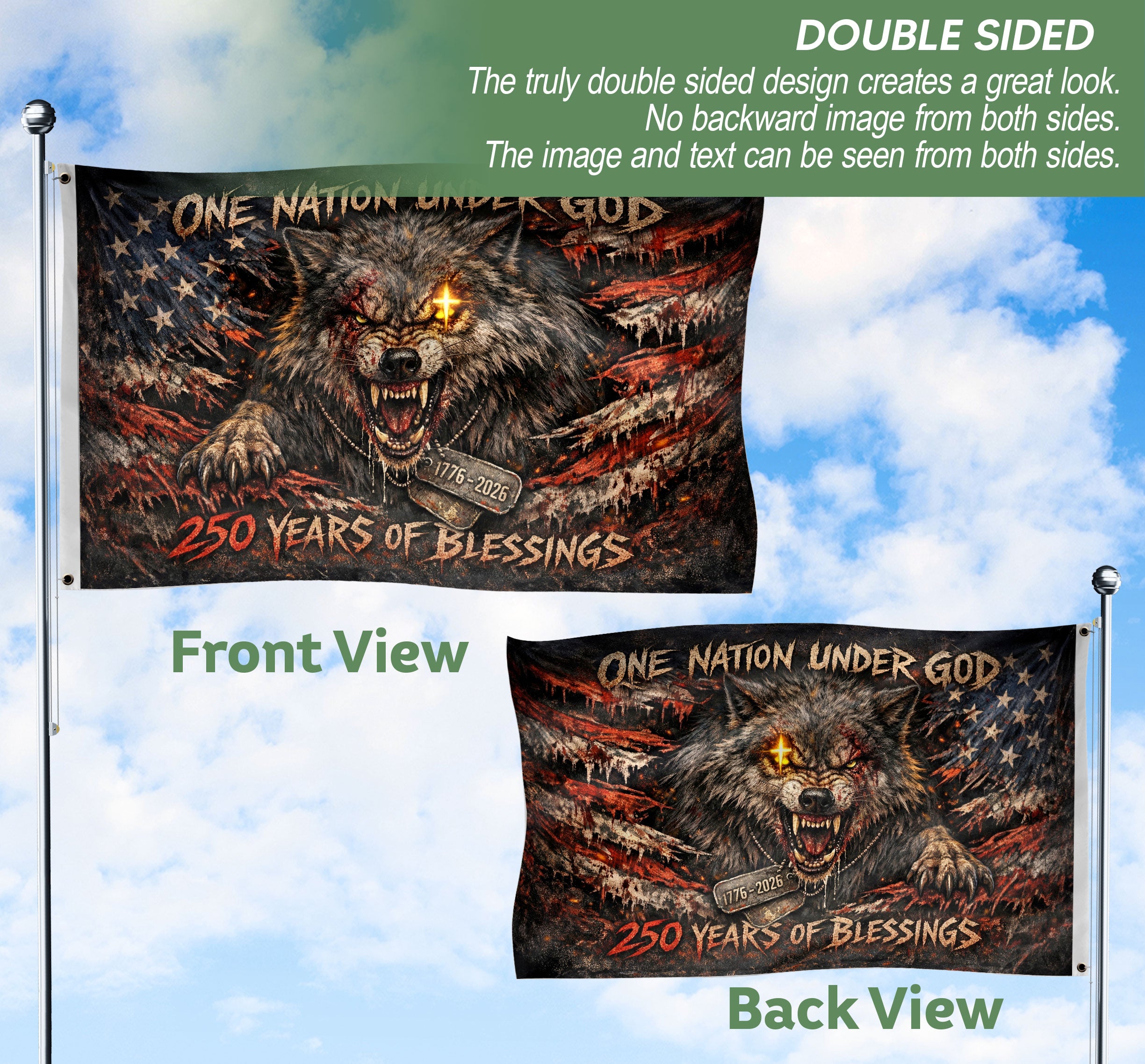 USA 250th Anniversary Double-Sided Patriotic Wolf Flag 1776-2026 One Nation Under God Banner