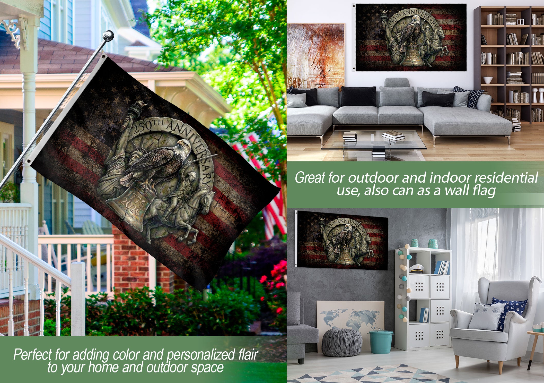 Celebrate 250 years of American independence with this striking USA 250th Anniversary Eagle Flag commemorating 1776-2026. The bold design features a powerful eagle emblem at the center, symbolizing strength, freedom, and national unity, set against a weathered American flag backdrop. Perfect for patriotic displays in homes, offices, patios, or outdoor events like parades and celebrations. Crafted for durability, this heritage flag honors the enduring spirit of the United States and serves as a meaningful tribute to the nation’s milestone anniversary. Ideal for history enthusiasts, veterans, and proud Americans seeking authentic patriotic decor.