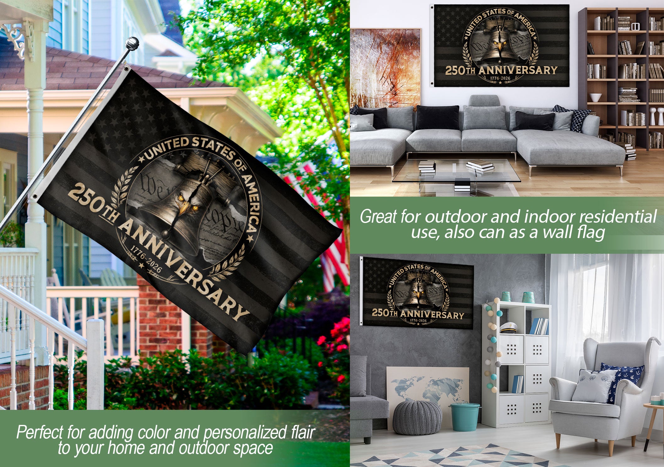 Celebrate 250 years of American independence with the USA 250th Anniversary Flag 1776–2026. This striking flag features a bold black American flag backdrop with a detailed Liberty Bell and majestic eagle centerpiece, symbolizing strength, freedom, and enduring heritage. Perfect for patriotic displays in homes, gardens, patios, or special commemorative events. Crafted for durability and vibrant outdoor use, it’s an ideal decorative accent to honor America’s past and future. Hang it proudly to showcase national pride during the semiquincentennial celebrations.