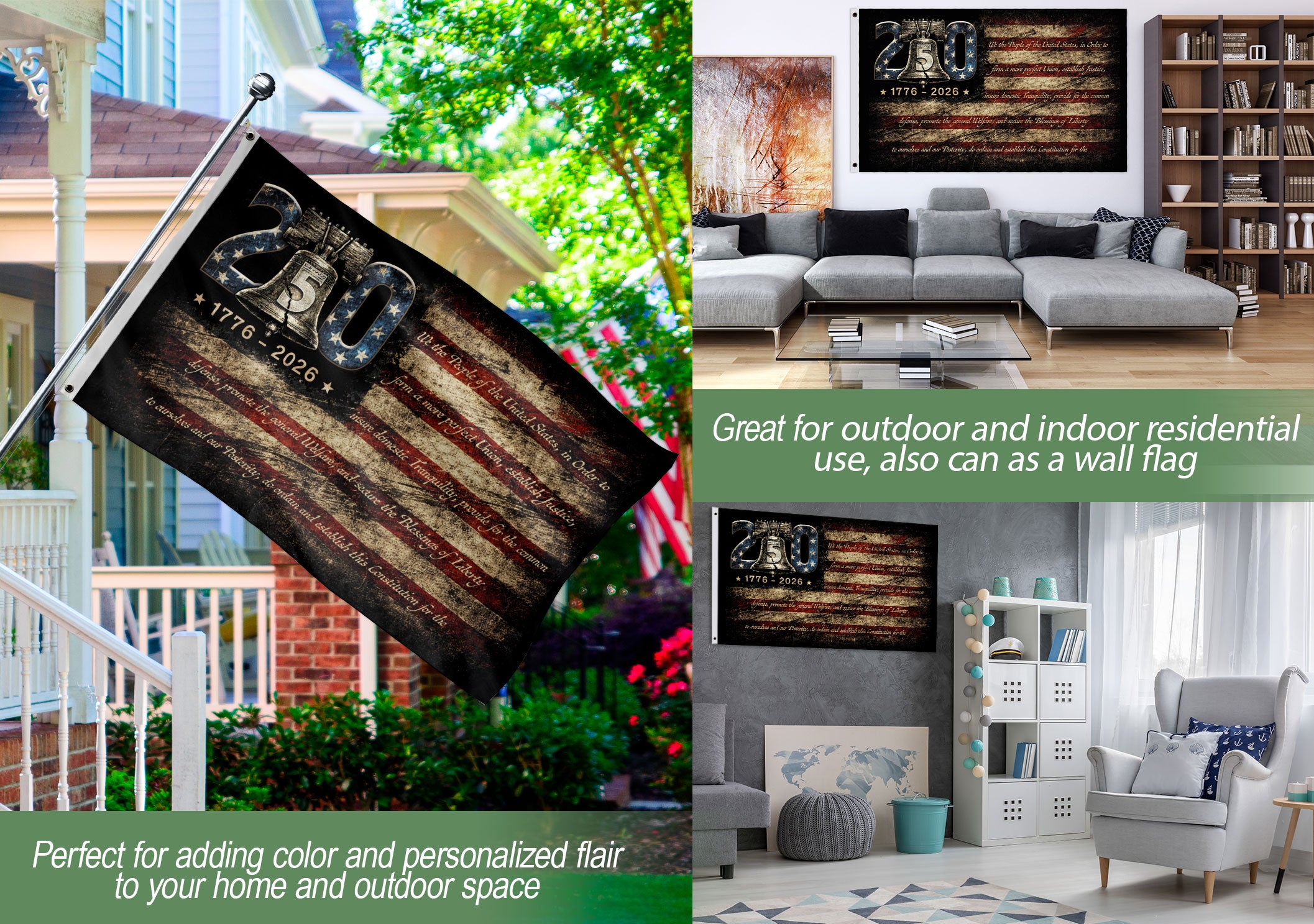 Celebrate America’s 250th anniversary with this striking patriotic flag featuring the iconic Liberty Bell and ‘We The People’ motto. Spanning from 1776 to 2026, this flag honors the historic roots of freedom and the enduring power of the American people. Crafted for durability and vibrant display, it’s perfect for homes, events, parades, or outdoor settings to showcase national pride. The bold design captures the spirit of independence and unity, making it an essential piece for patriots commemorating this milestone. Ideal for flagpoles, walls, or indoor decor, this high-quality USA flag stands as a timeless symbol of liberty.