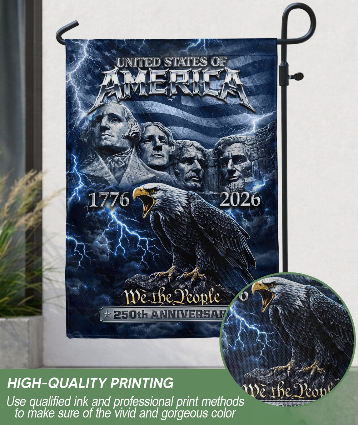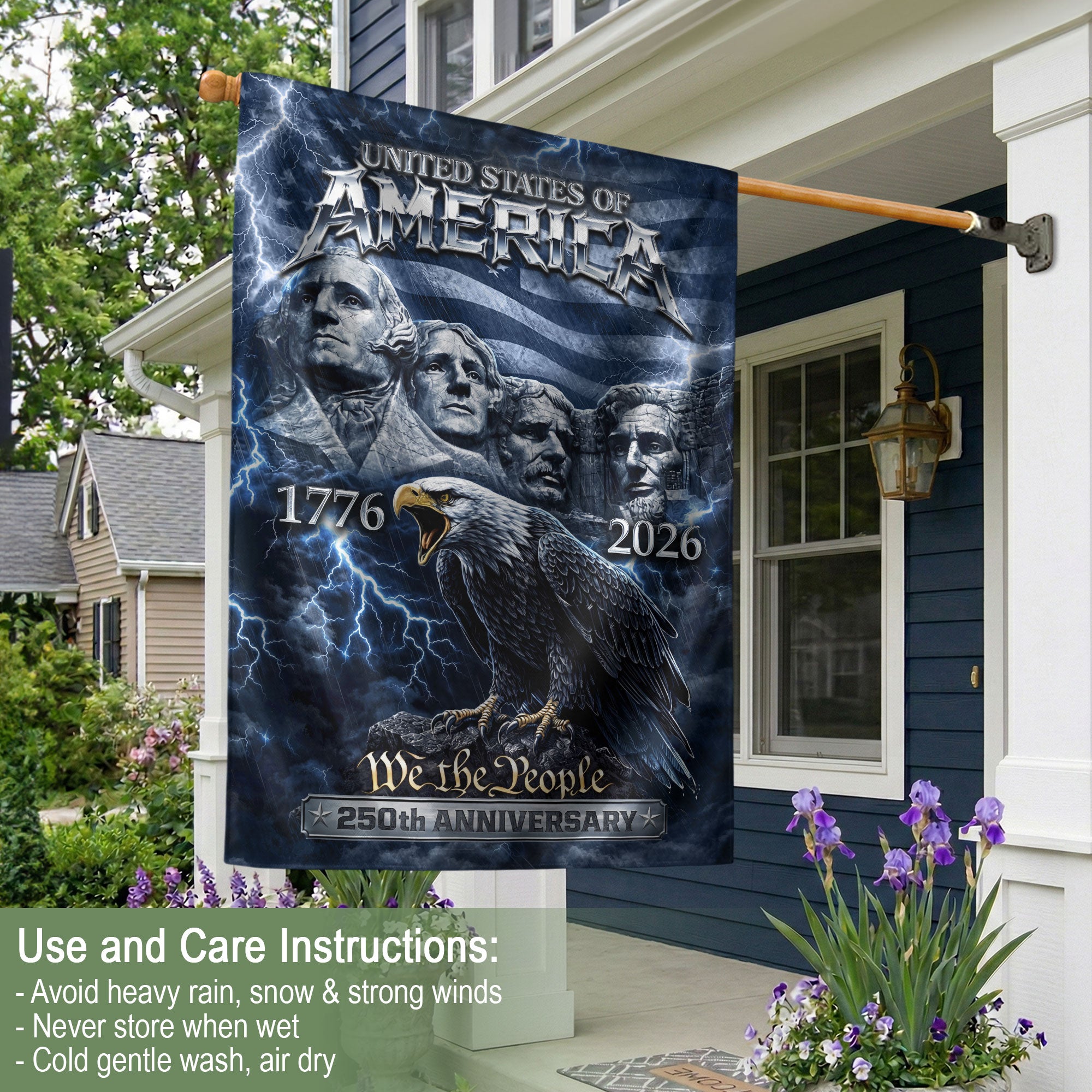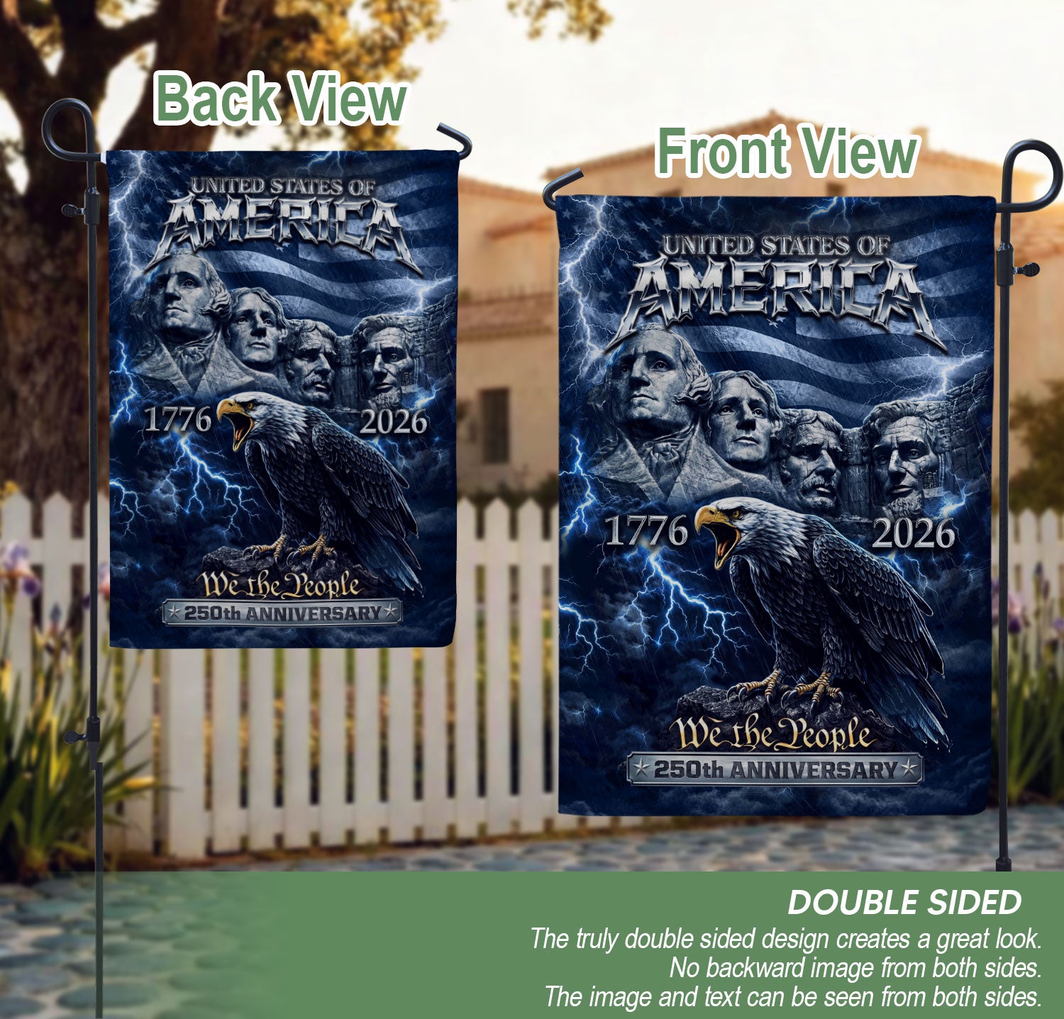 Celebrate America’s 250th anniversary from 1776 to 2026 with this striking double-sided house flag. Featuring the iconic Mount Rushmore presidents beneath a majestic soaring eagle, set against a vibrant American flag backdrop, this patriotic design captures the enduring spirit of the nation. Perfect for outdoor yard or garden decor, it adds bold, meaningful symbolism to any home. Crafted for durability to withstand the elements, the flag measures standard house flag size and is easy to hang on porches, mailboxes, or flagpoles. Ideal for Independence Day celebrations, historical commemorations, or everyday display of American pride. Show your patriotism with this high-quality, weather-resistant flag that honors 250 years of American history.