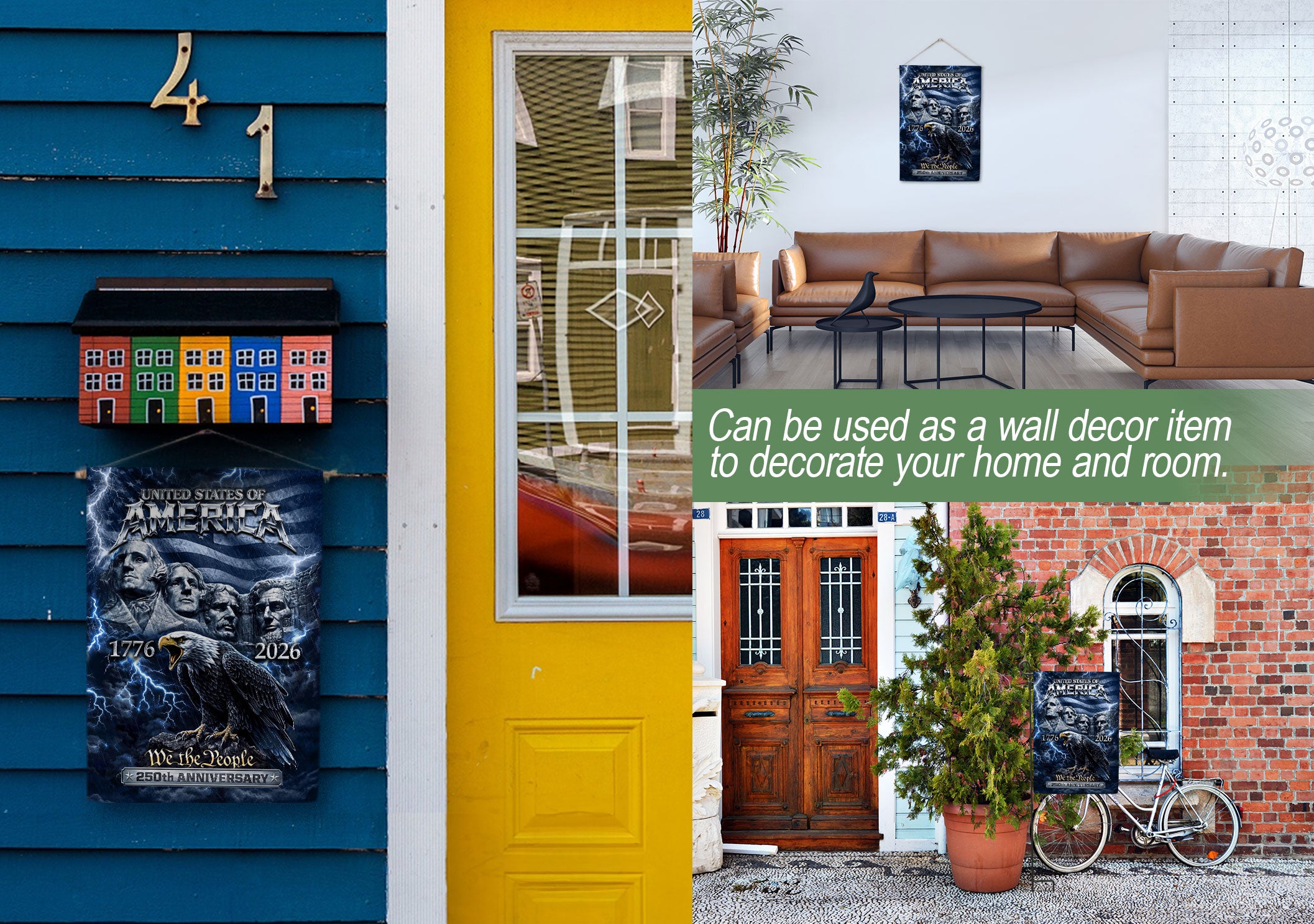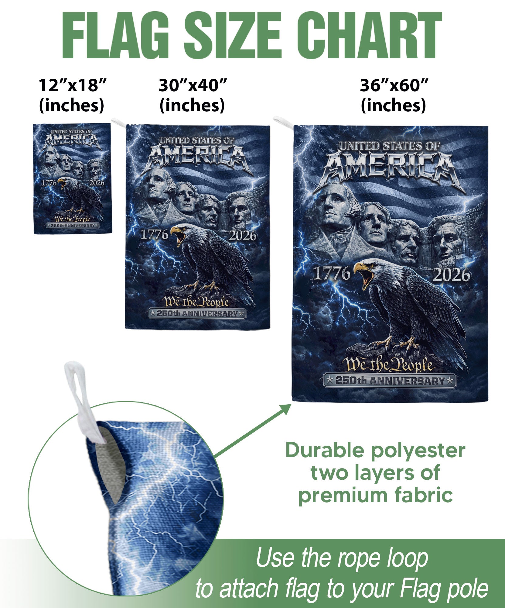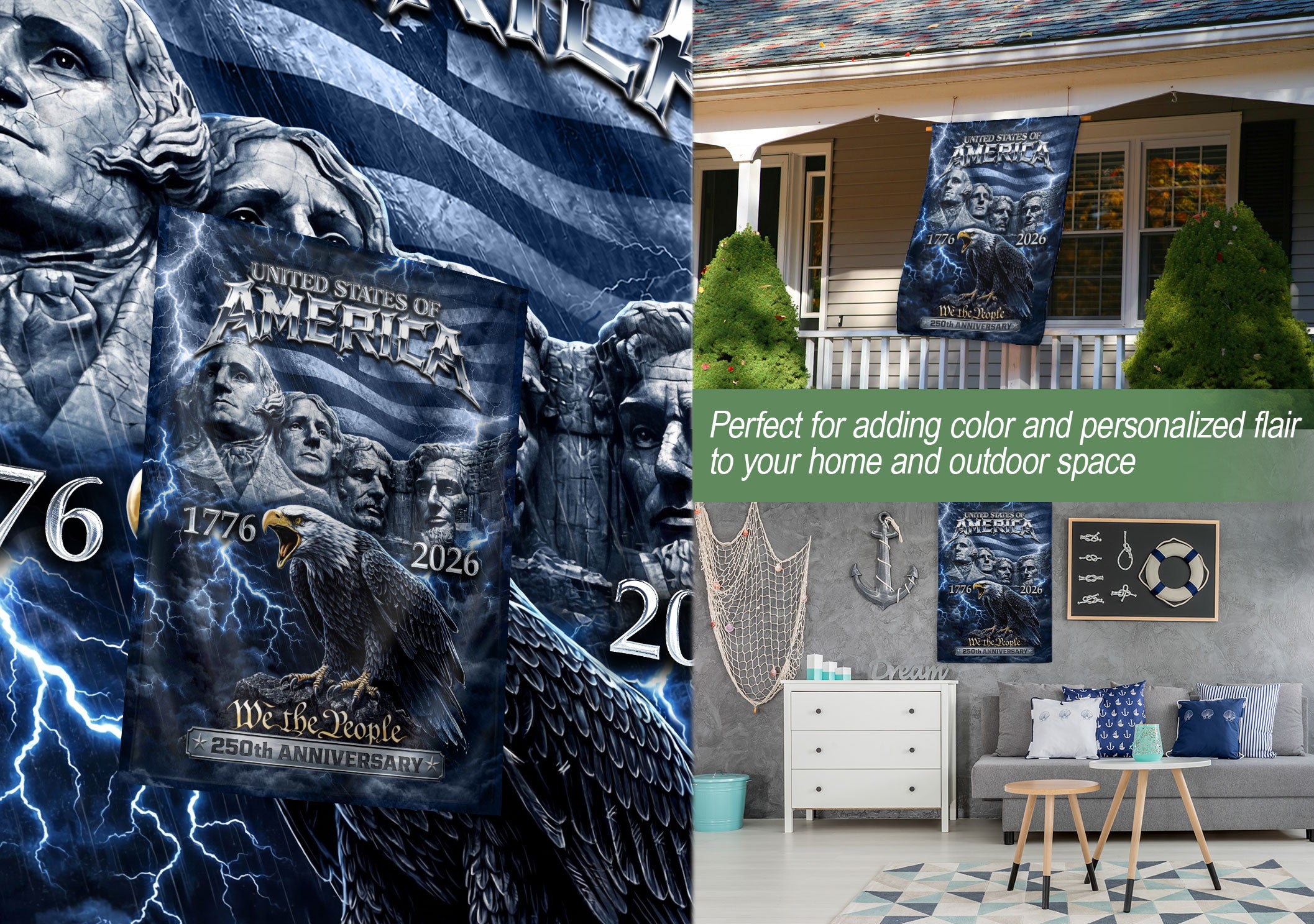 Celebrate America’s 250th anniversary from 1776 to 2026 with this striking double-sided house flag. Featuring the iconic Mount Rushmore presidents beneath a majestic soaring eagle, set against a vibrant American flag backdrop, this patriotic design captures the enduring spirit of the nation. Perfect for outdoor yard or garden decor, it adds bold, meaningful symbolism to any home. Crafted for durability to withstand the elements, the flag measures standard house flag size and is easy to hang on porches, mailboxes, or flagpoles. Ideal for Independence Day celebrations, historical commemorations, or everyday display of American pride. Show your patriotism with this high-quality, weather-resistant flag that honors 250 years of American history.