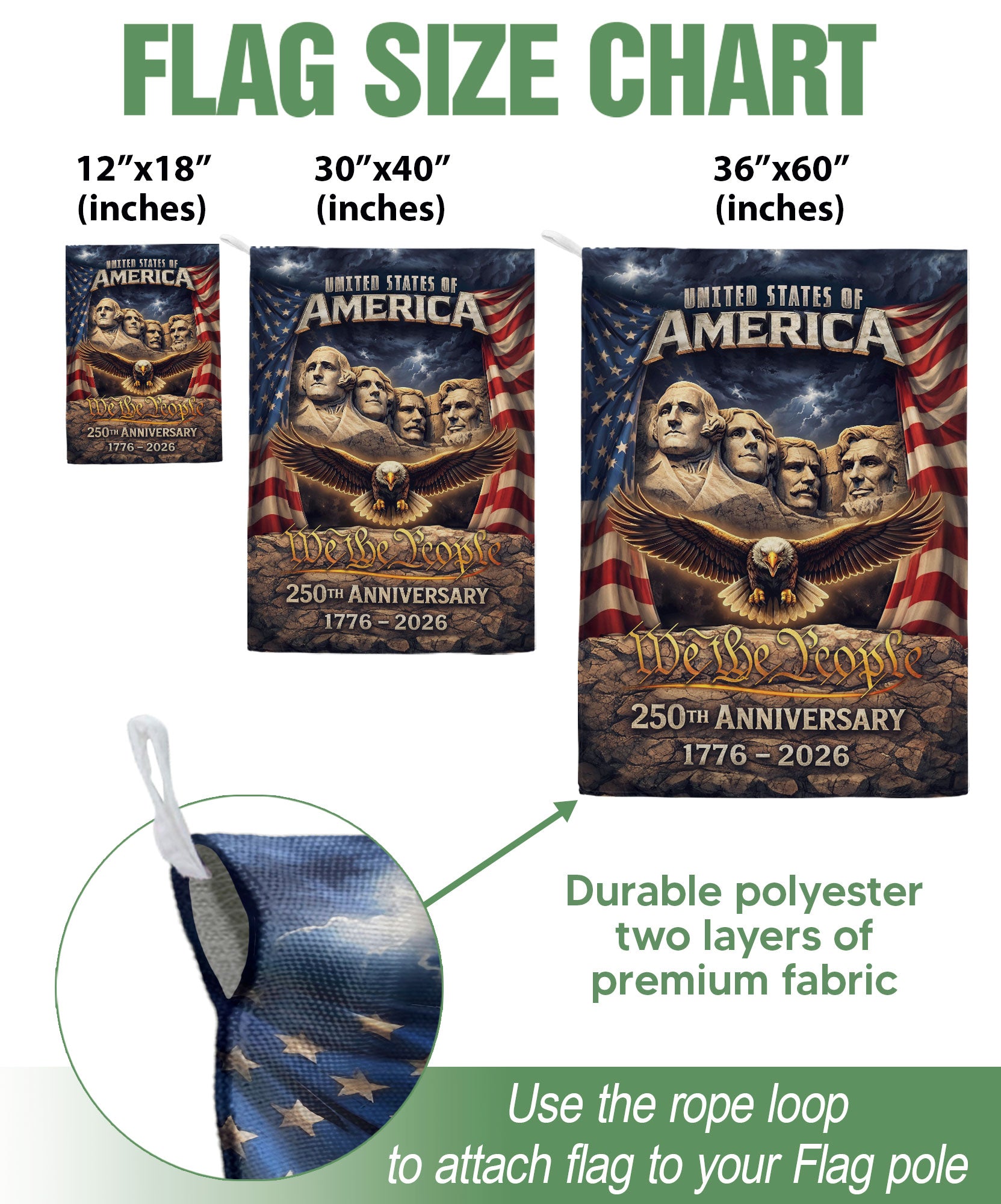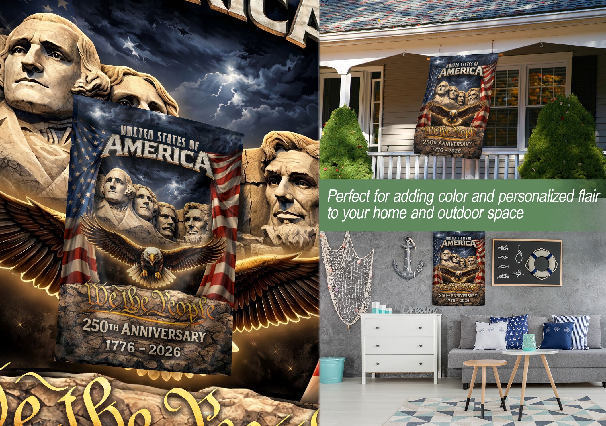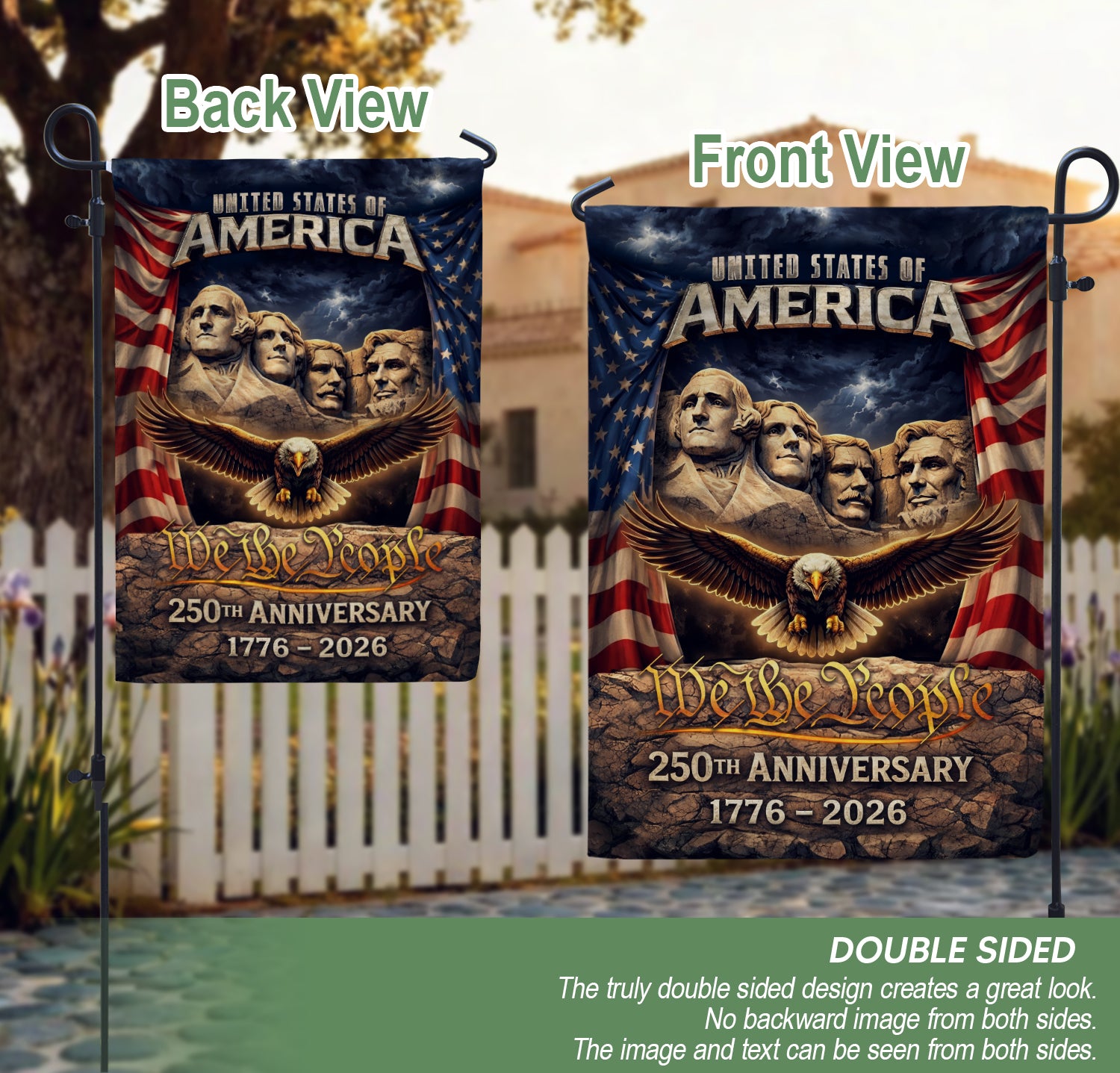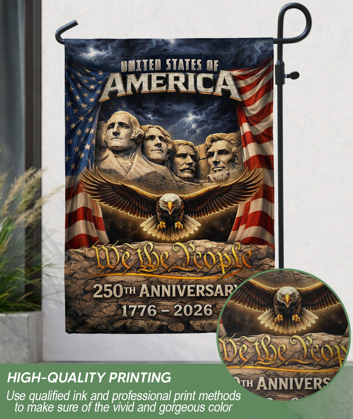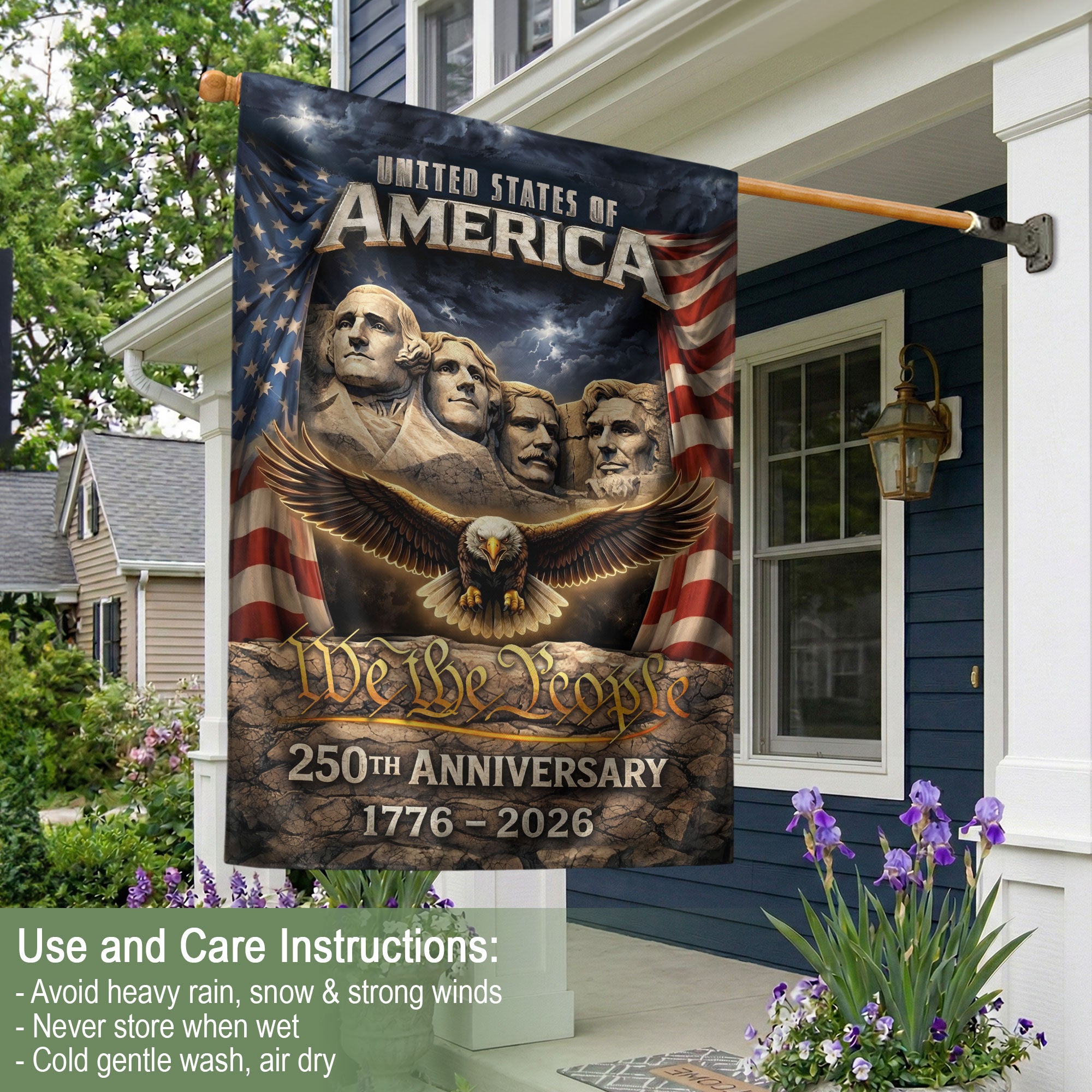 Celebrate America’s 250th anniversary from 1776 to 2026 with this patriotic double-sided house flag. Featuring a striking design with Mount Rushmore, a majestic eagle, and the iconic Stars and Stripes, this outdoor yard decoration proudly displays 250 years of freedom. Perfect for porches, gardens, or any outdoor space, it’s crafted for durability to withstand the elements while showcasing national pride. Ideal for Independence Day, Memorial Day, or everyday display of American heritage.
