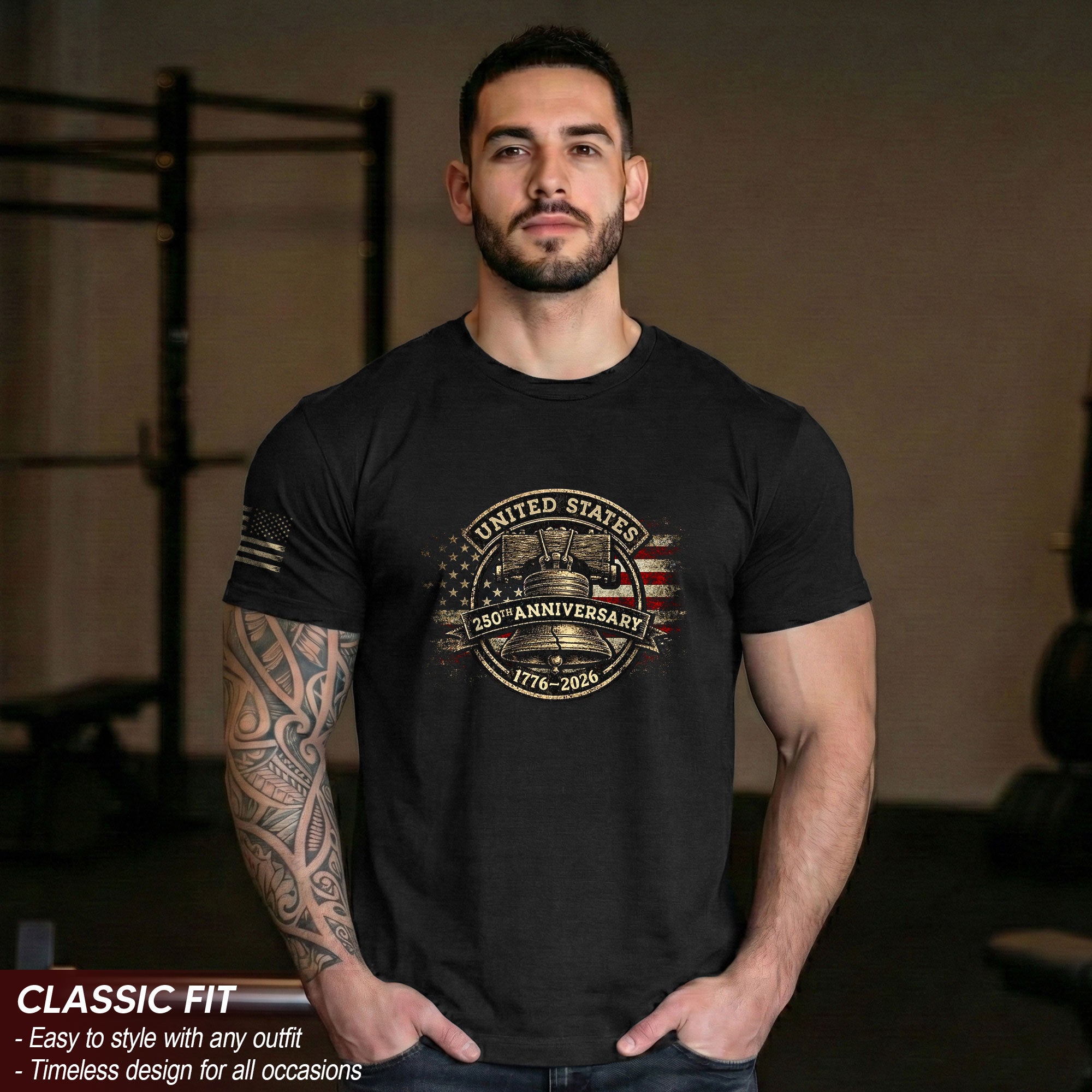 Historic roots. Lasting pride.The Liberty Bell and American flag unite to honor the birth of freedom and 250 years of heritage. Simple, meaningful design perfect for daily wear and patriotic celebrations.