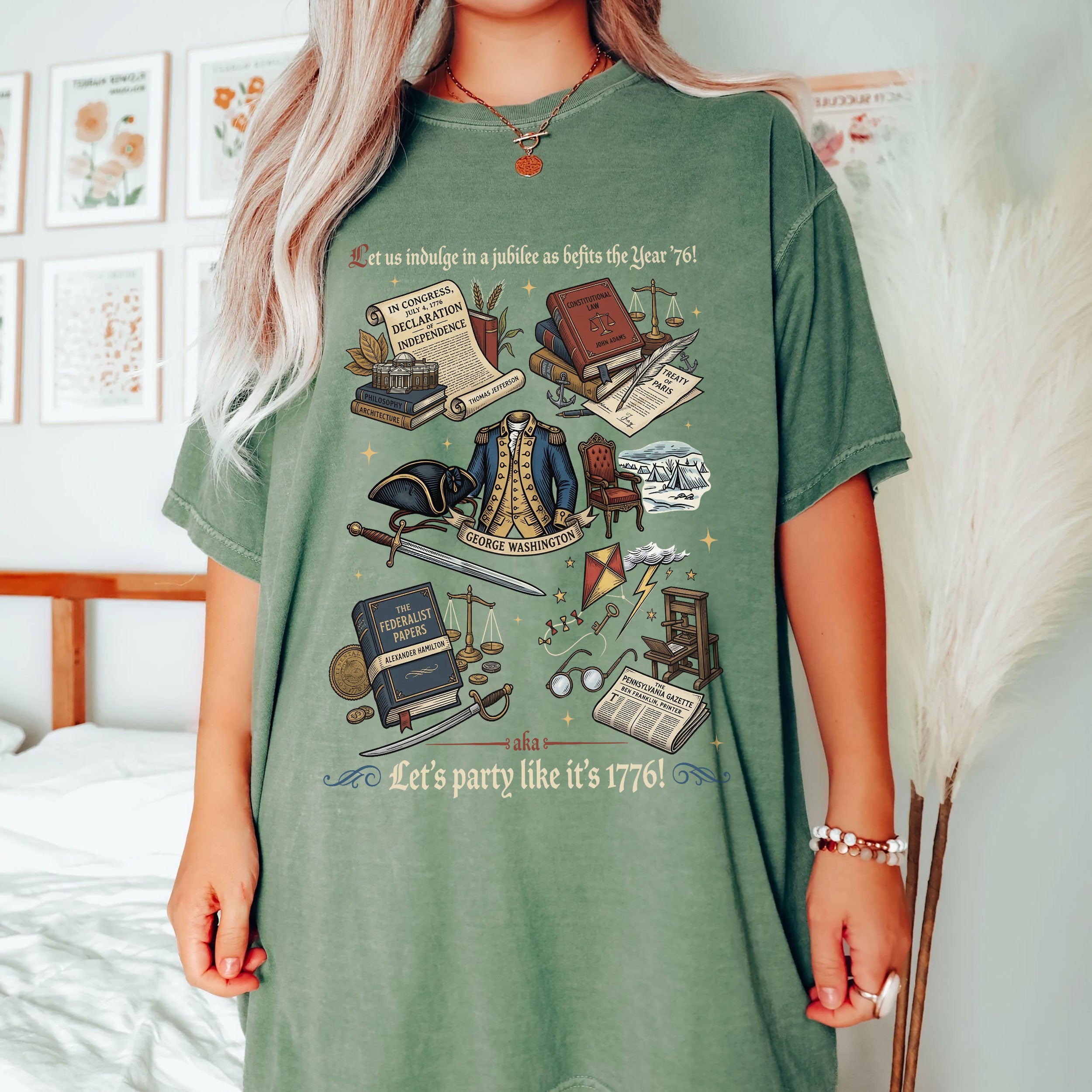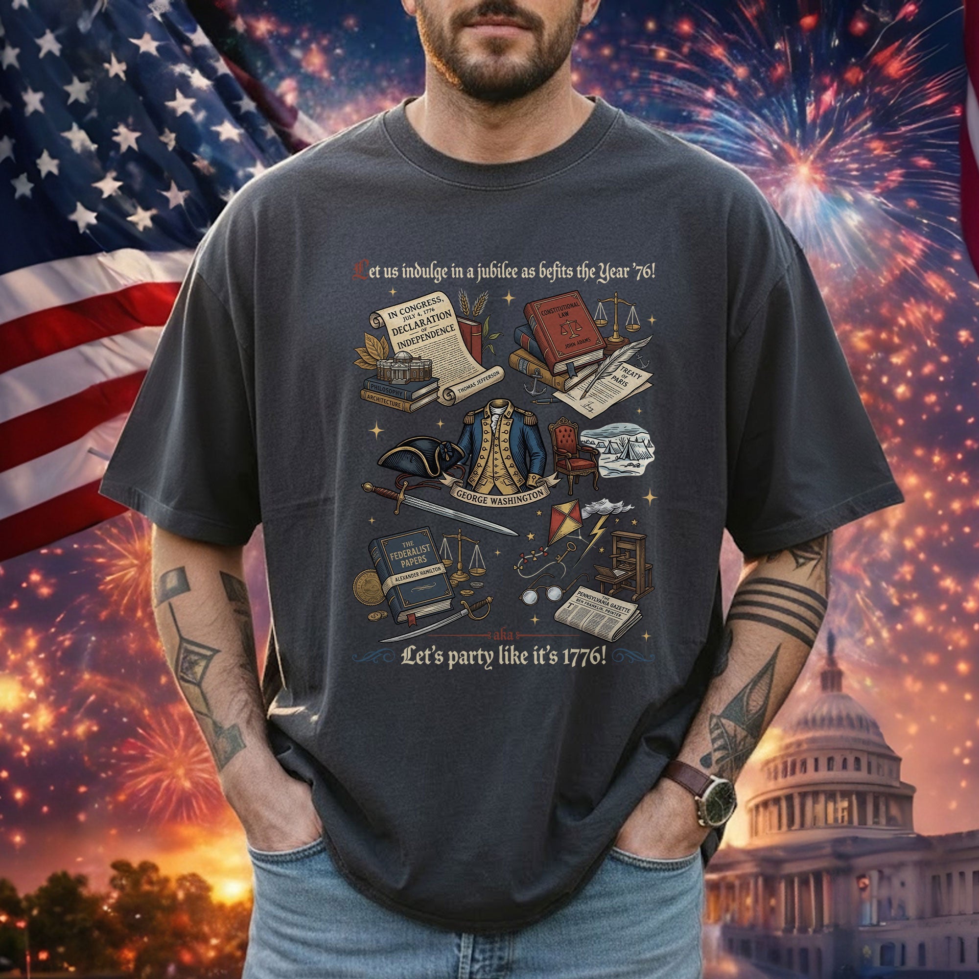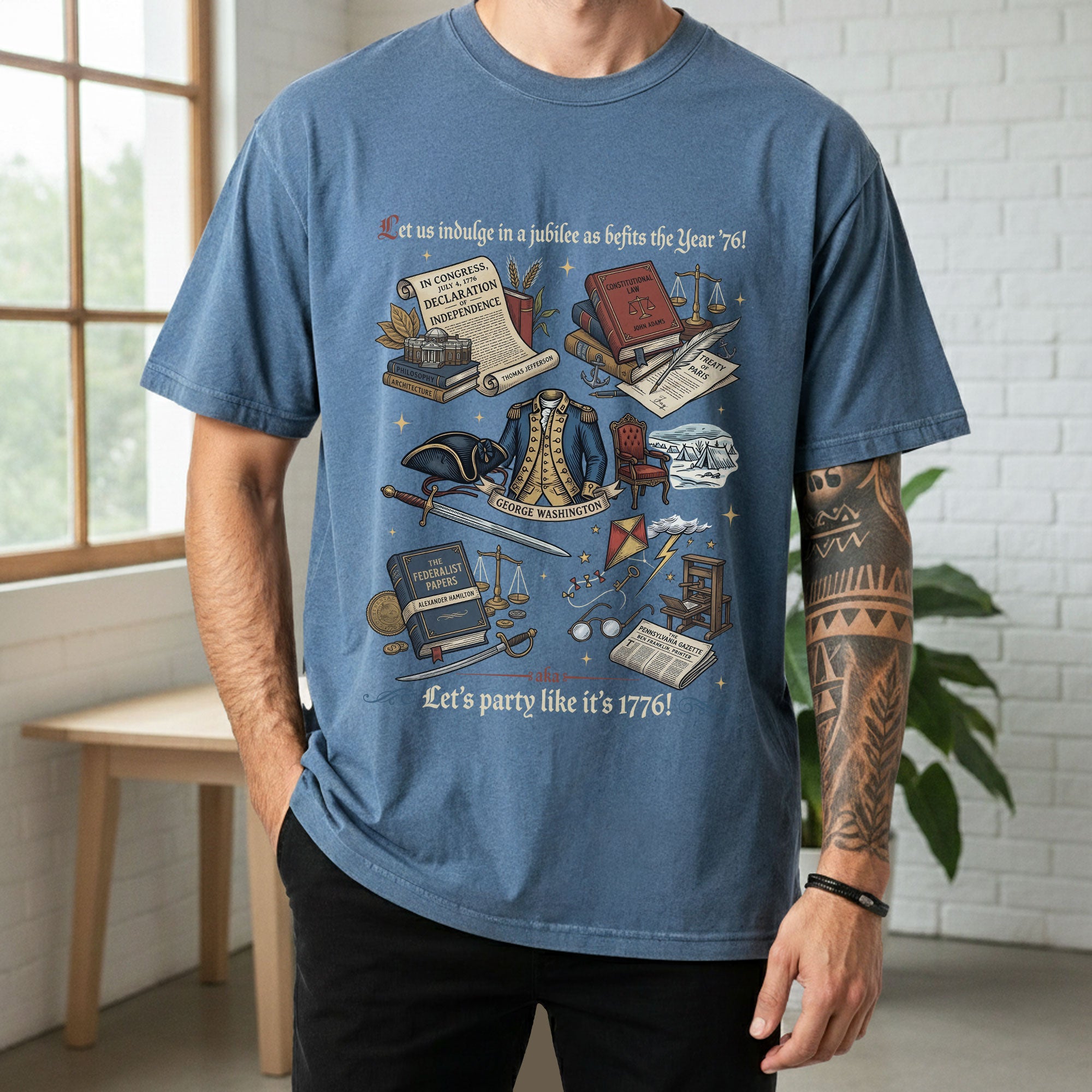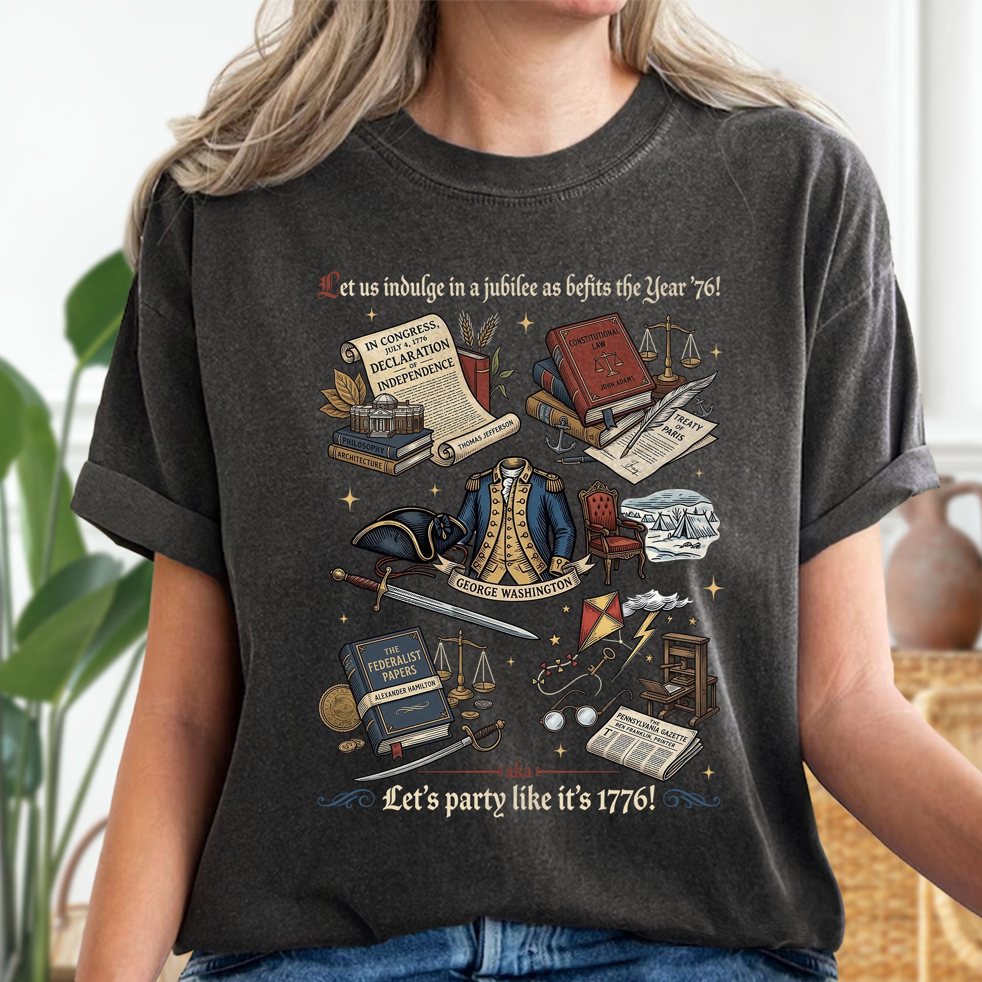 Stylish 1776 vintage patriotic T-shirt featuring classic American history icons and a timeless design. Ideal for Independence Day, USA pride, and history enthusiasts.