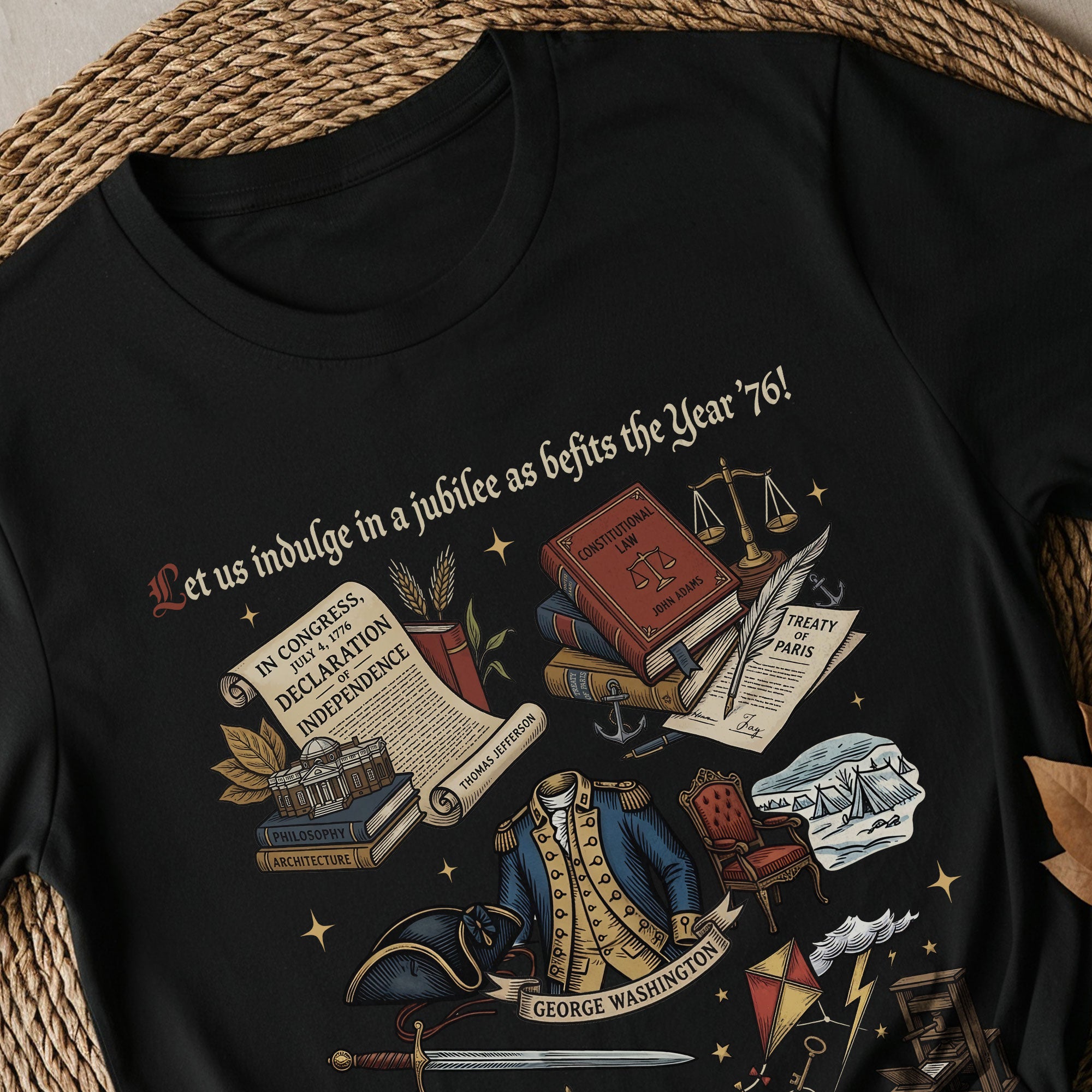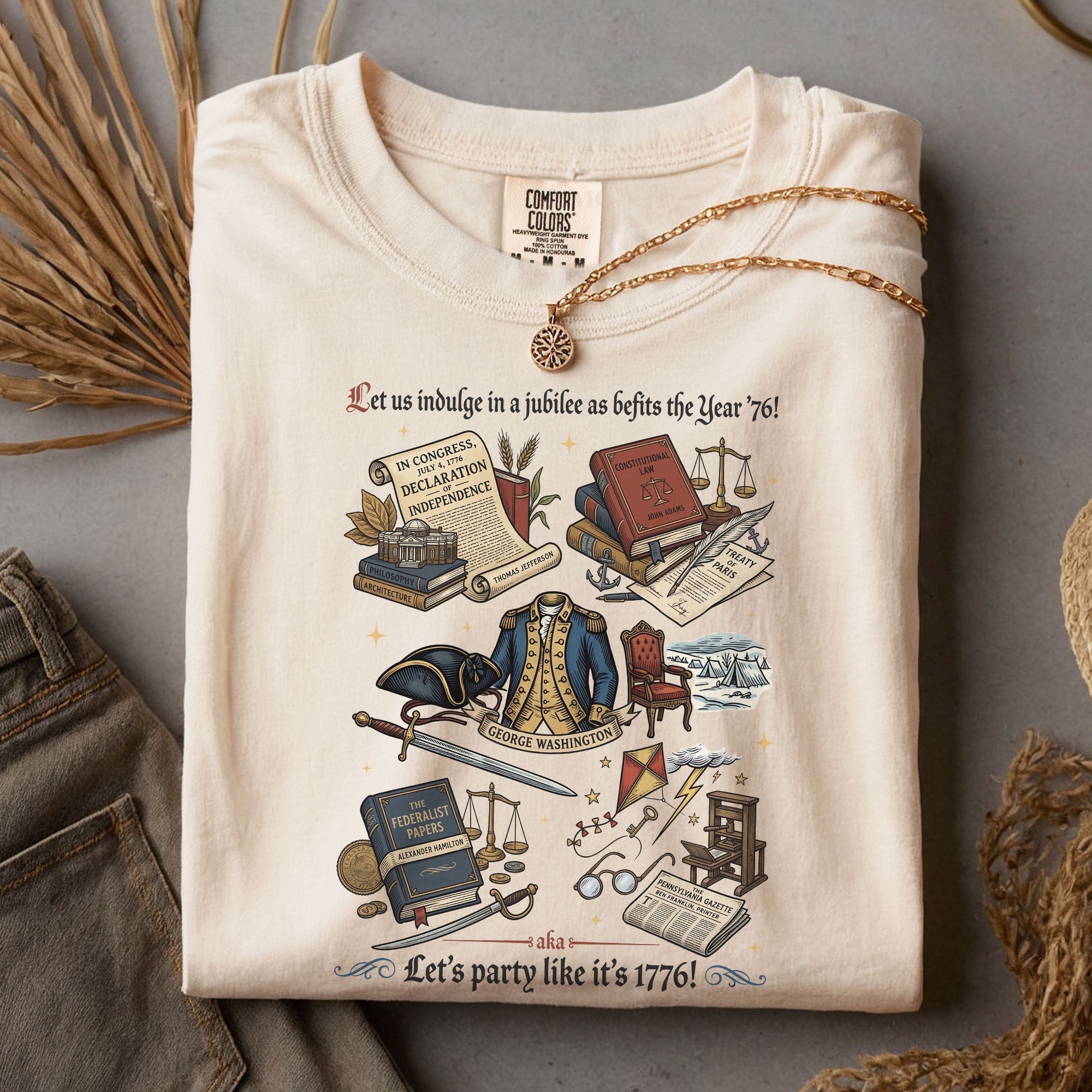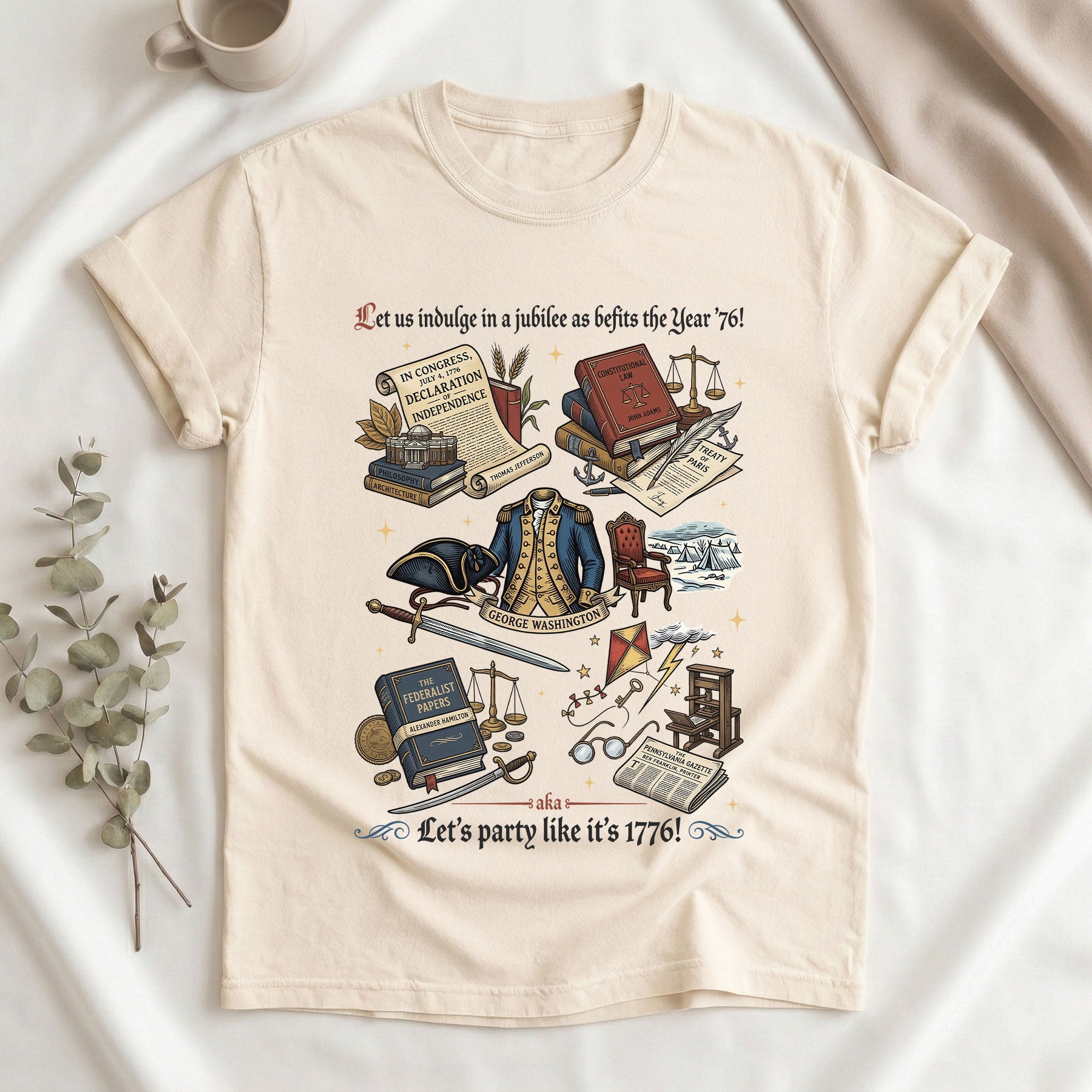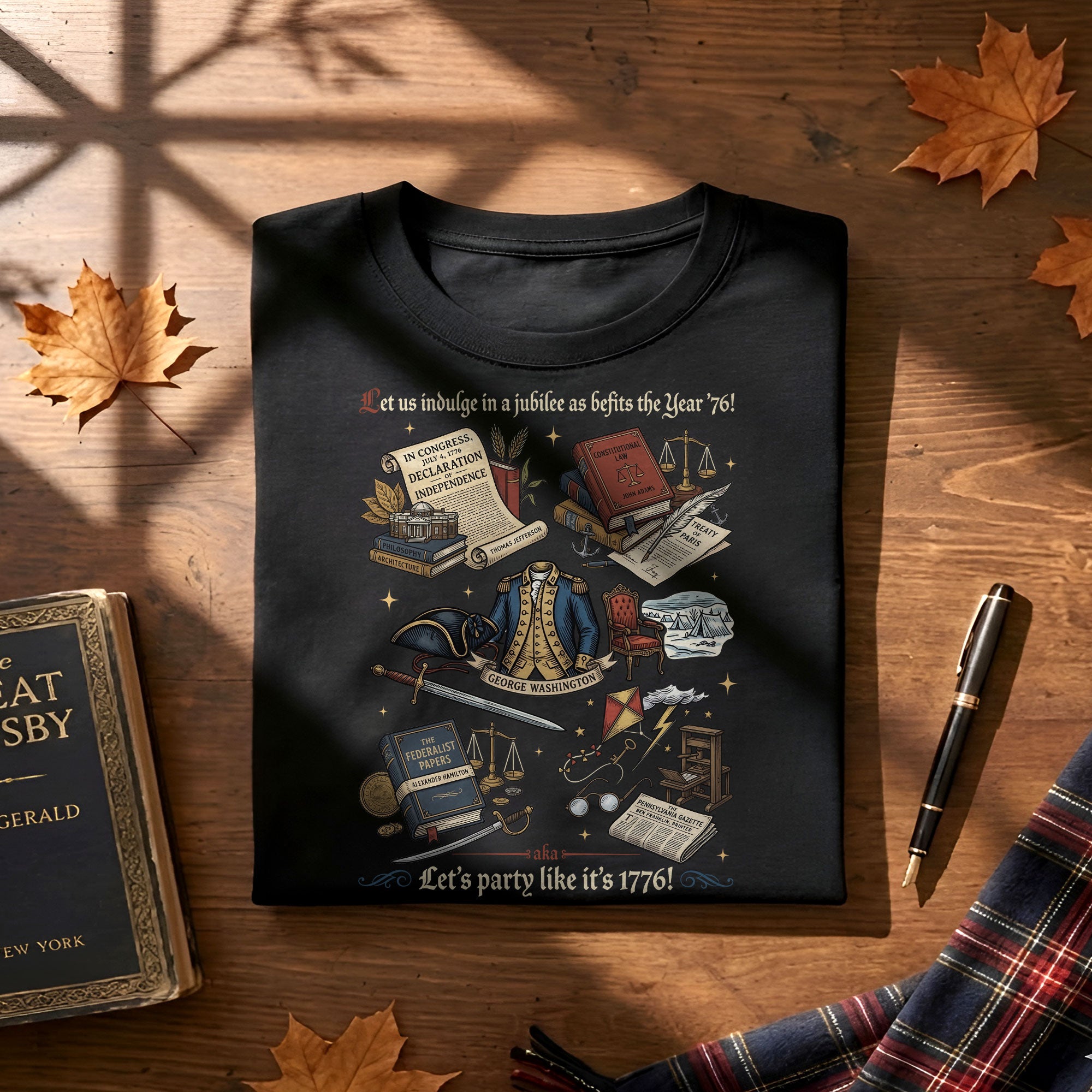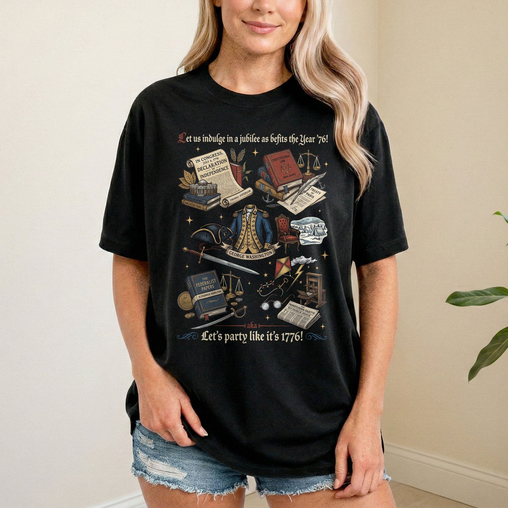 Stylish 1776 vintage patriotic T-shirt featuring classic American history icons and a timeless design. Ideal for Independence Day, USA pride, and history enthusiasts.