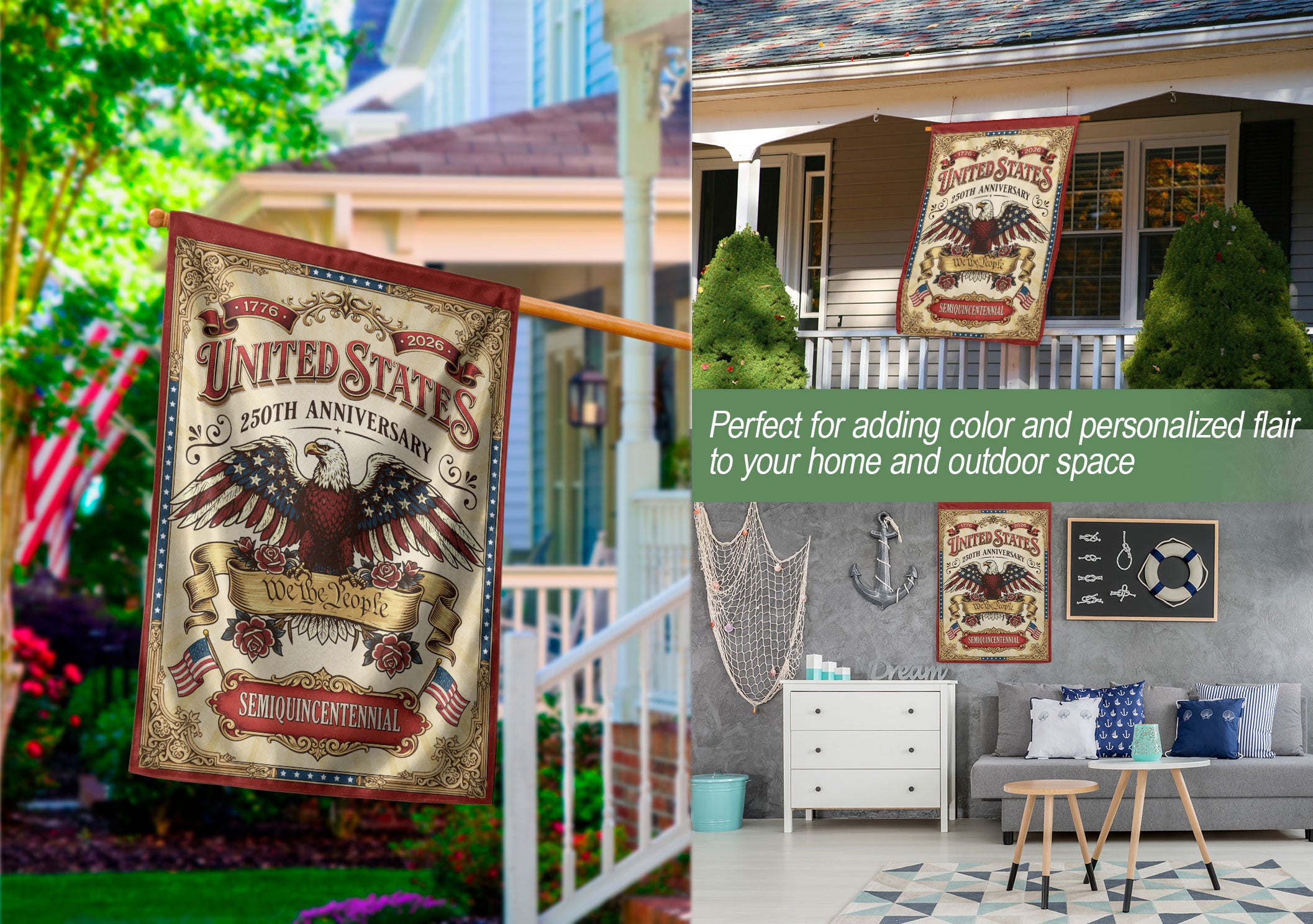 Celebrate 250 years of American independence with this We The People 250 Years United States 1776–2026 Anniversary House Flag. Featuring a striking bald eagle design and the iconic “We The People” phrase, this double-sided USA banner embodies patriotic pride and national strength. Perfect for displaying outside your home, garden, or porch during the anniversary festivities. Crafted with high-quality polyester fabric for vibrant colors and durability, it withstands outdoor weather conditions including wind, rain, and sun exposure. The double-sided printing ensures the bold graphics are visible from both sides, making it ideal for porches, flagpoles, or fences. Easy to hang with reinforced grommets. A must-have for patriots honoring America’s enduring liberty and history.