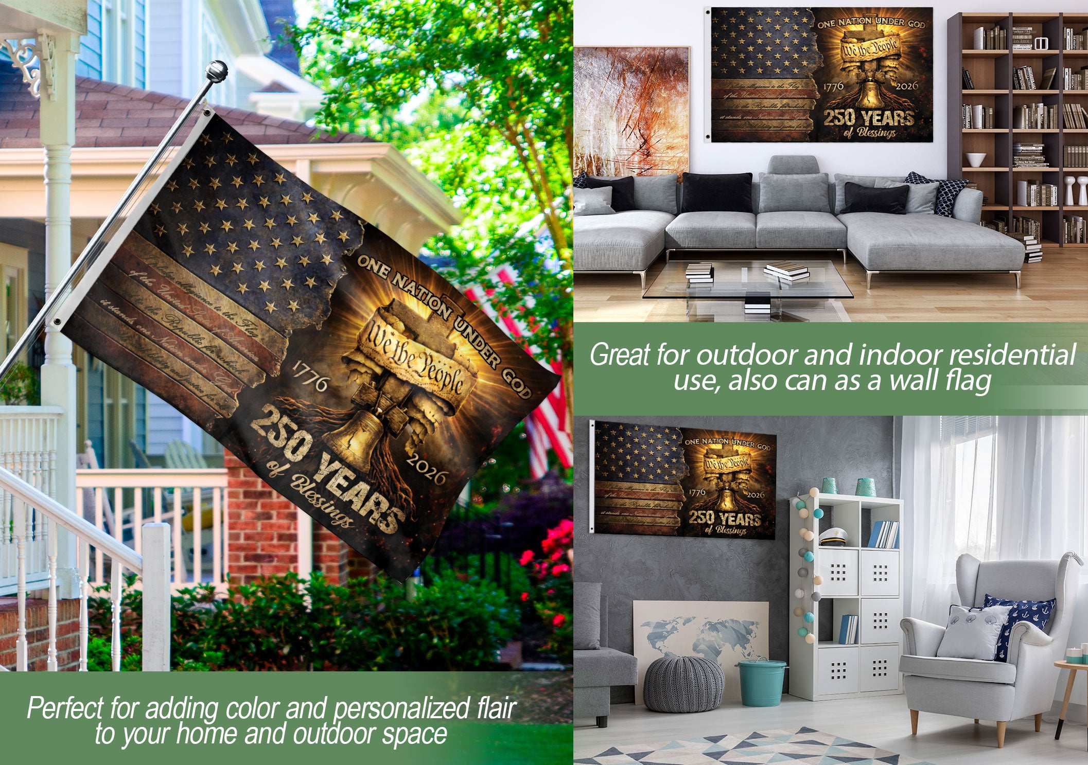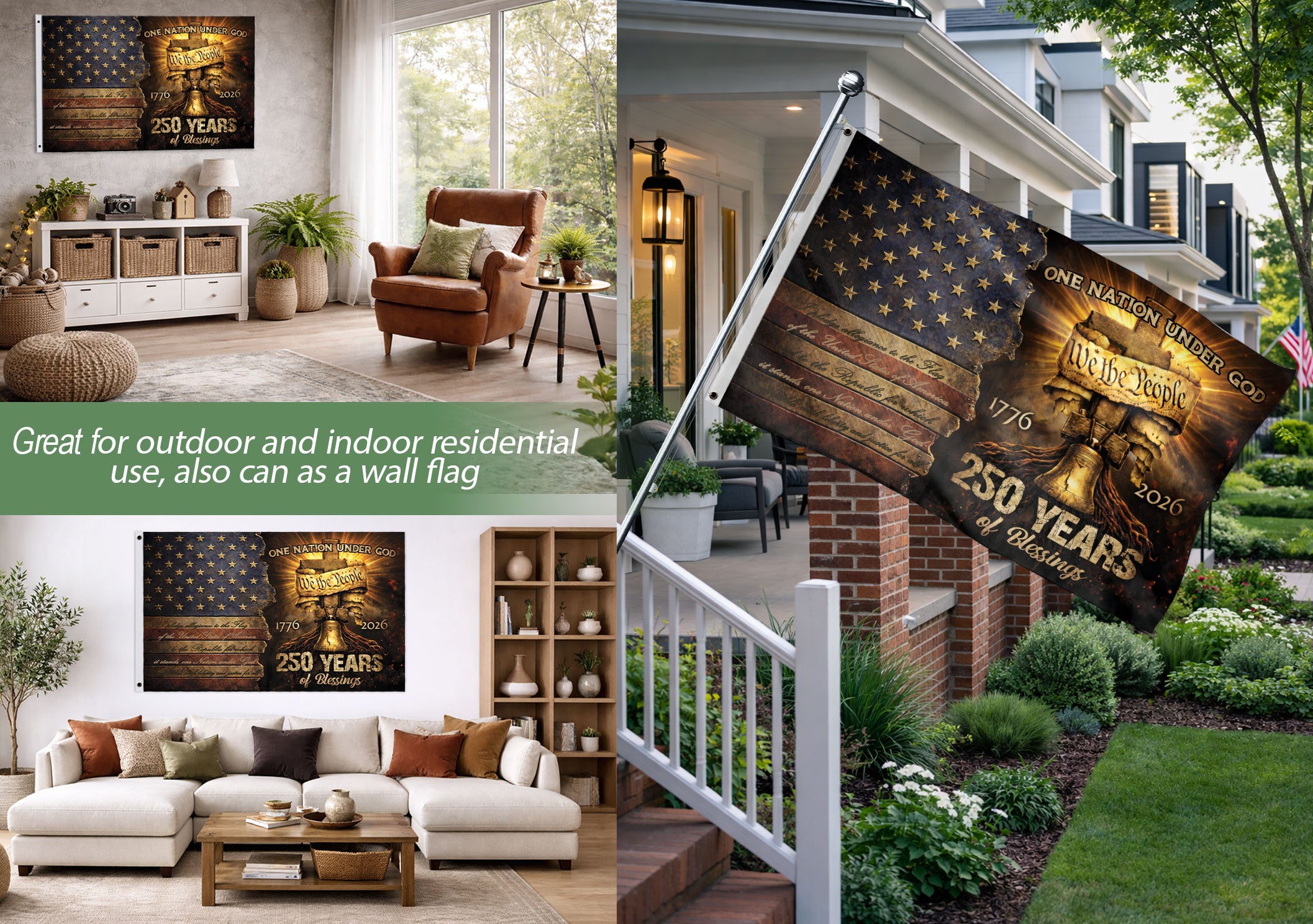 Celebrate 250 years of American independence with this We The People Christian house flag, commemorating the 1776-2026 milestone. Featuring the patriotic phrase ‘One Nation Under God,’ this flag blends faith, freedom, and national pride. Ideal for displaying outside homes, churches, porches, or during patriotic events like Fourth of July, Memorial Day, or Veterans Day. Crafted for durability to withstand outdoor conditions, it serves as a bold statement of Christian values and American heritage. Easy to hang with a standard pole sleeve, this 28×40-inch flag makes a meaningful addition to any outdoor space honoring U.S. history and religious liberty.